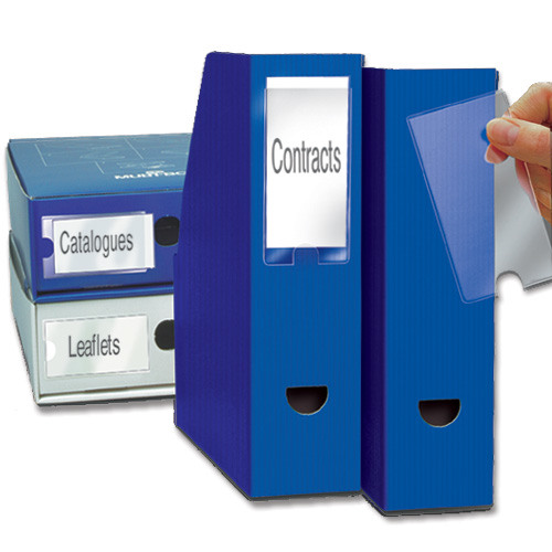 Sichtfenster mit austauschbaren, beschreib- oder bedruckbaren Papieretiketten zur Kennzeichnung von sich laufend änderndem Inhalt von Dokumentenablagen, Ringbüchern, Katalogen und Schubladen. Mit praktischer Fingeröffnung für einfachen Austausch der Etikette.