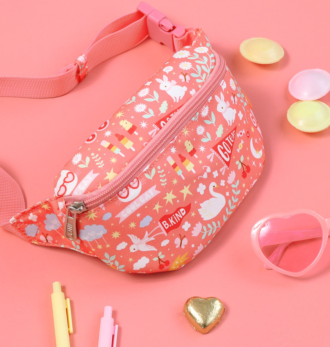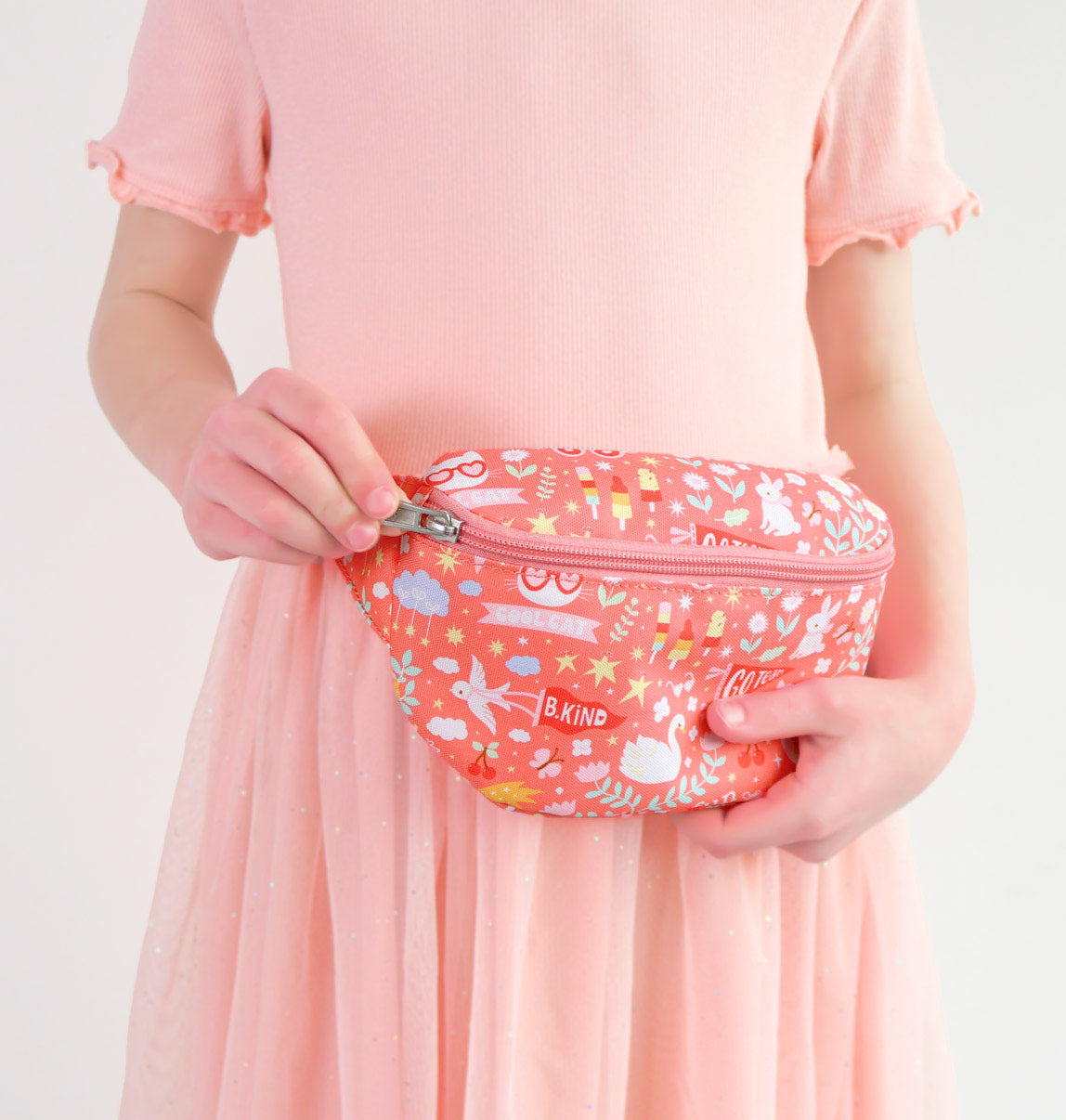 Korallenrosa Gürteltasche mit dem Fun Design in Kindergröße. Die Tasche verfügt über einen verstellbaren Tragegurt, sodass die Tasche auch als Crossbody Bag getragen werden kann. In die Vordertasche passen bequem Geldbörse und Handy. Auf der Rückseite befindet sich eine zusätzliche Reißverschlusstasche, die sich ideal für kleine Wertgegenstände eignet.