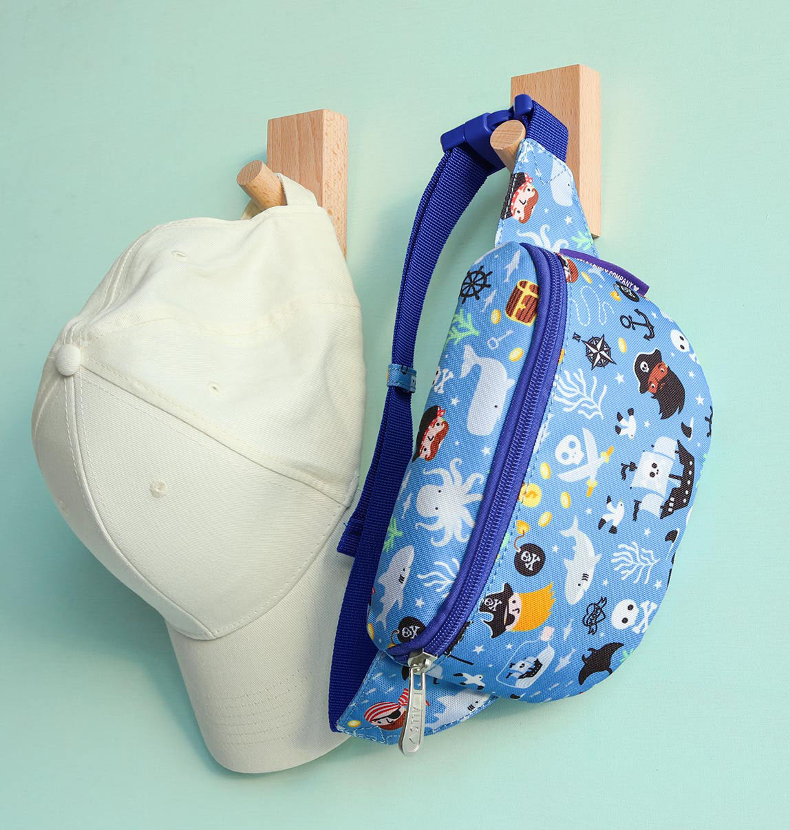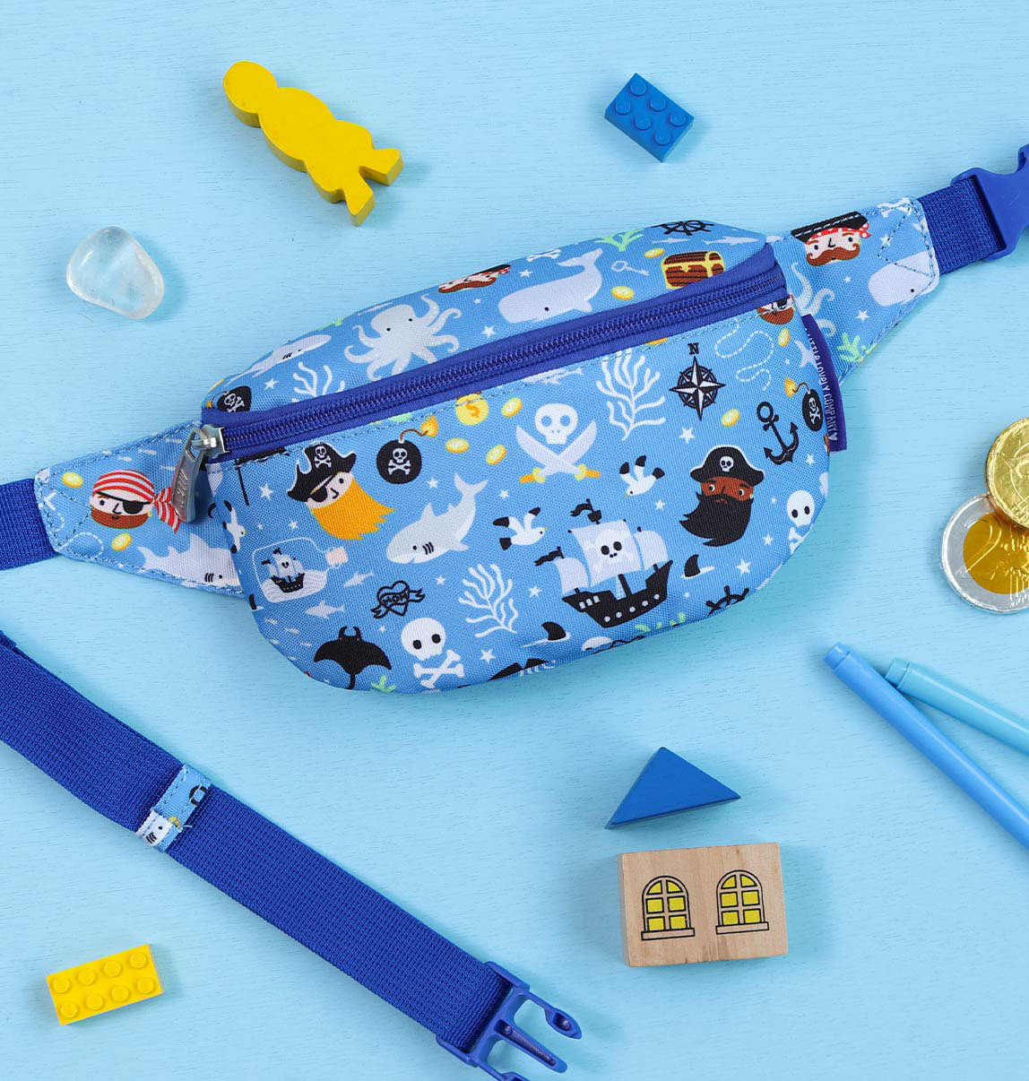 Blaue Gürteltasche mit Piratenmotiv in Kindergröße. Die Tasche verfügt über einen verstellbaren Tragegurt, sodass die Tasche auch als Crossbody Bag getragen werden kann. In die Vordertasche passen bequem Geldbörse und Handy. Auf der Rückseite befindet sich eine zusätzliche Reißverschlusstasche, die sich ideal für kleine Wertgegenstände eignet.