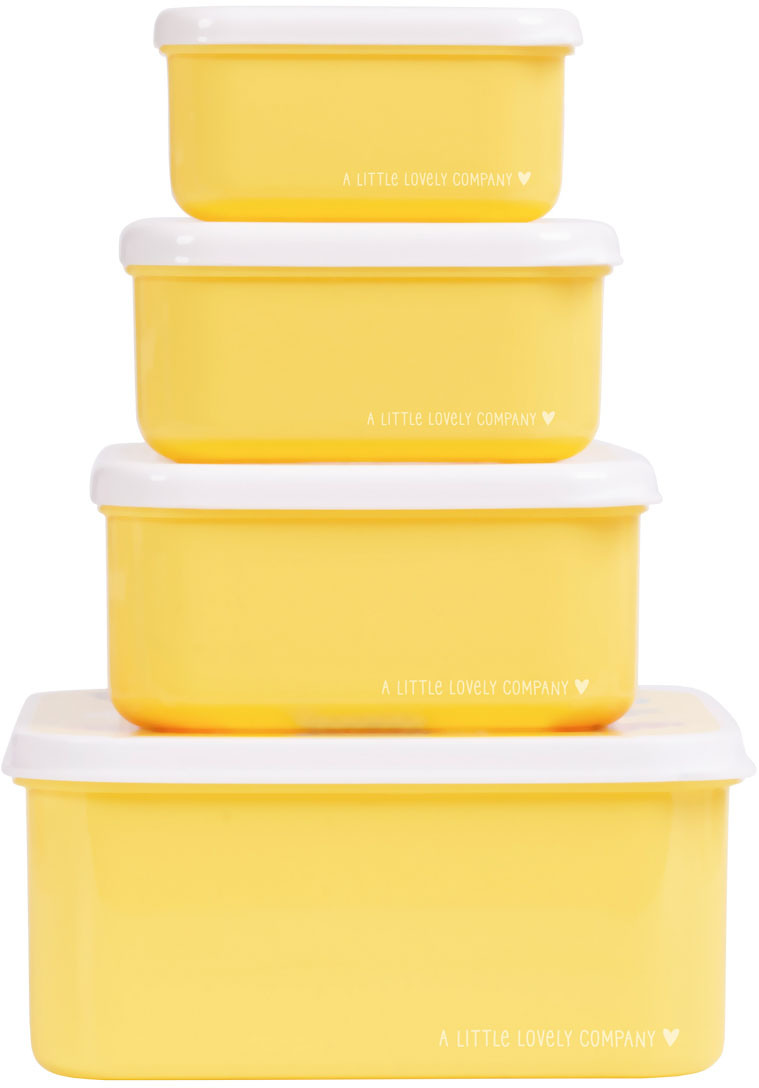 Set mit vier Lunch- und Snackboxen in verschiedenen Grössen und passenden Designs. Grossartig für die Schule, für unterwegs und ideal für die Aufbewahrung von Snacks zu Hause. Dank der Lasche an der Seite des Deckels lassen sie sich leicht öffnen und schliessen, und die Boxen lassen sich zur einfachen Aufbewahrung ineinander stapeln.