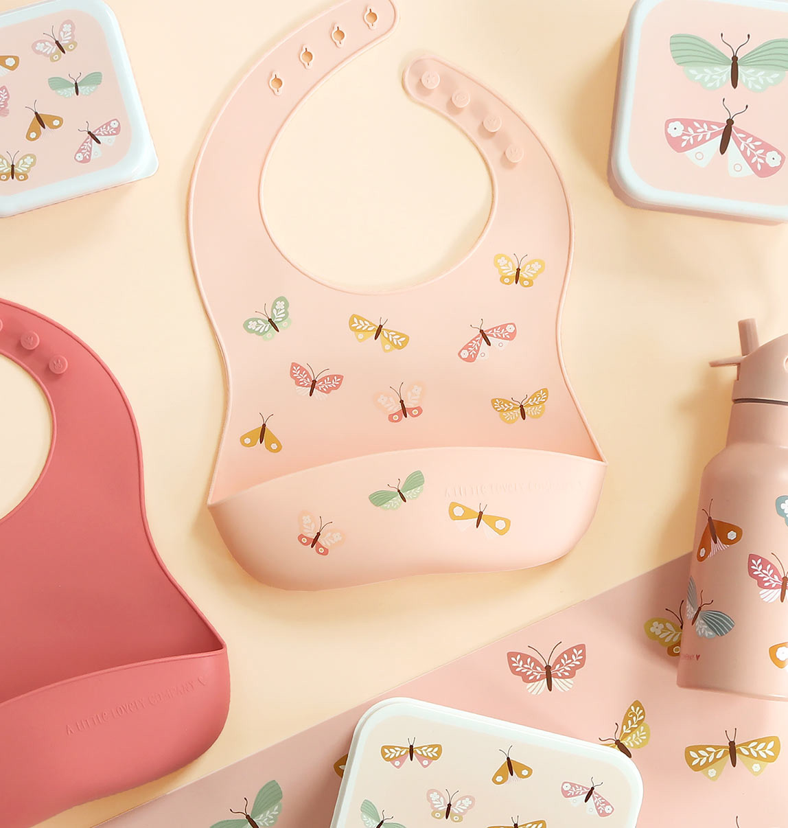 Set mit zwei Silikonlätzchen - eines mit Schmetterlingenaufdruck und eines in passender Unifarbe. Die Lätzchen bestehen aus weichem, food-grade Silikon, sind wasser- und schmutzabweisend und haben eine breite Tasche auf der Vorderseite, die sich ideal zum Auffangen von Essen eignet. Der verstellbare Halsverschluss macht sie für Babys und Kleinkinder geeignet. Die Silikonlätzchen sind leicht zu reinigen und durch Aufrollen leicht zu verstauen.