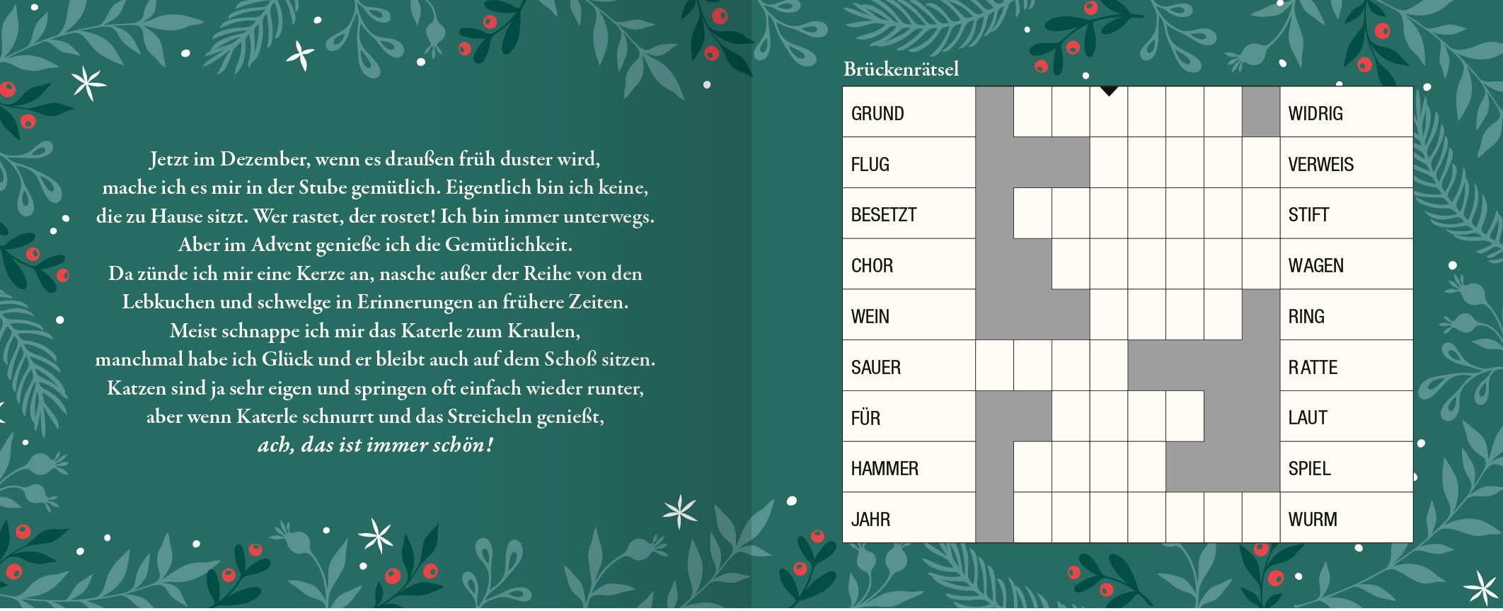 Weihnachtliche Knobelchallenge: Rätsel-Adventskalender von Renate BergmannDie beliebte Online-Omi bringt auch dieses Jahr wieder unsere Gehirnzellen zum Glühen. Mit 24 Rätseln und Renate Bergmanns Wortwitz vergeht die Zeit bis Weihnachten garantiert schnell. Ob Buchstabensalat, Labyrinth, Quiz, Schwedenrätsel, Wortrad oder Kreuzwortgitter - Renate Bergmann hat für jeden Dezembertag eine Rätselaufgabe vorbereitet. Einfach die entsprechende Seite aufschneiden und los geht"s. Mit viel Humor und Rätselspaß durch die Weihnachtszeit: Trainieren Sie mit Renate Bergmann ihre grauen Zellen und Lachmuskeln!Adventskalender für Rätselfreunde: 24 Worträtsel und Buchstabenspiele, eingebunden in eine weihnachtliche Renate-Bergmann-GeschichteGeistig fit durch den Advent: 9 Rätselarten sorgen für Abwechslung beim Knobeln und TüftelnRätselspiel für jeden Tag im Advent: Das Geschenk für alle Superhirne, Rätselfreaks und Abenteurer - nicht nur was für Rentner:innen wie Rena