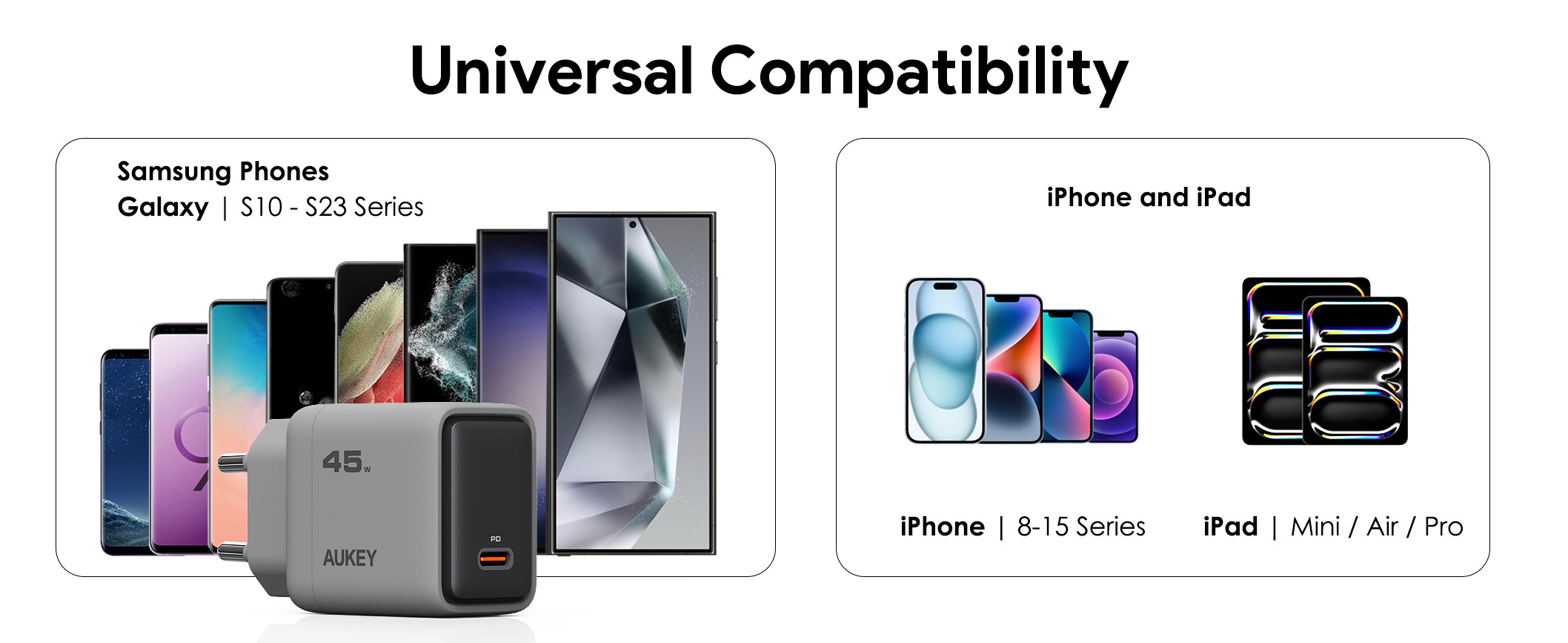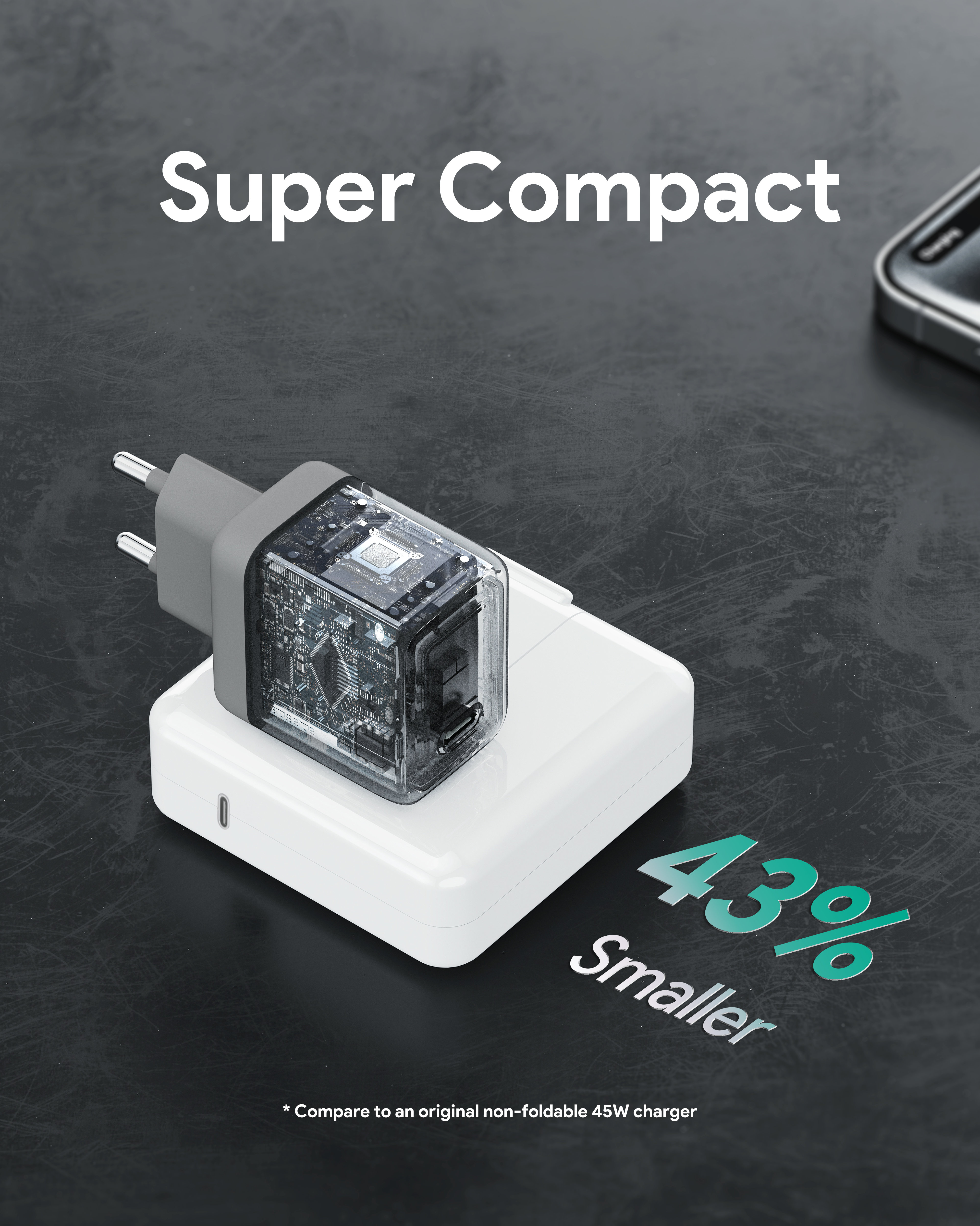 Unglaublich klein und dennoch leistungsstark mit 45 W Leistung. Universeller USB-C-Anschluss. Kann ein neues iPhone mit voller Geschwindigkeit aufladen. Optimierte Ladegeschwindigkeiten für Telefone, Pads und sogar kleine Laptops