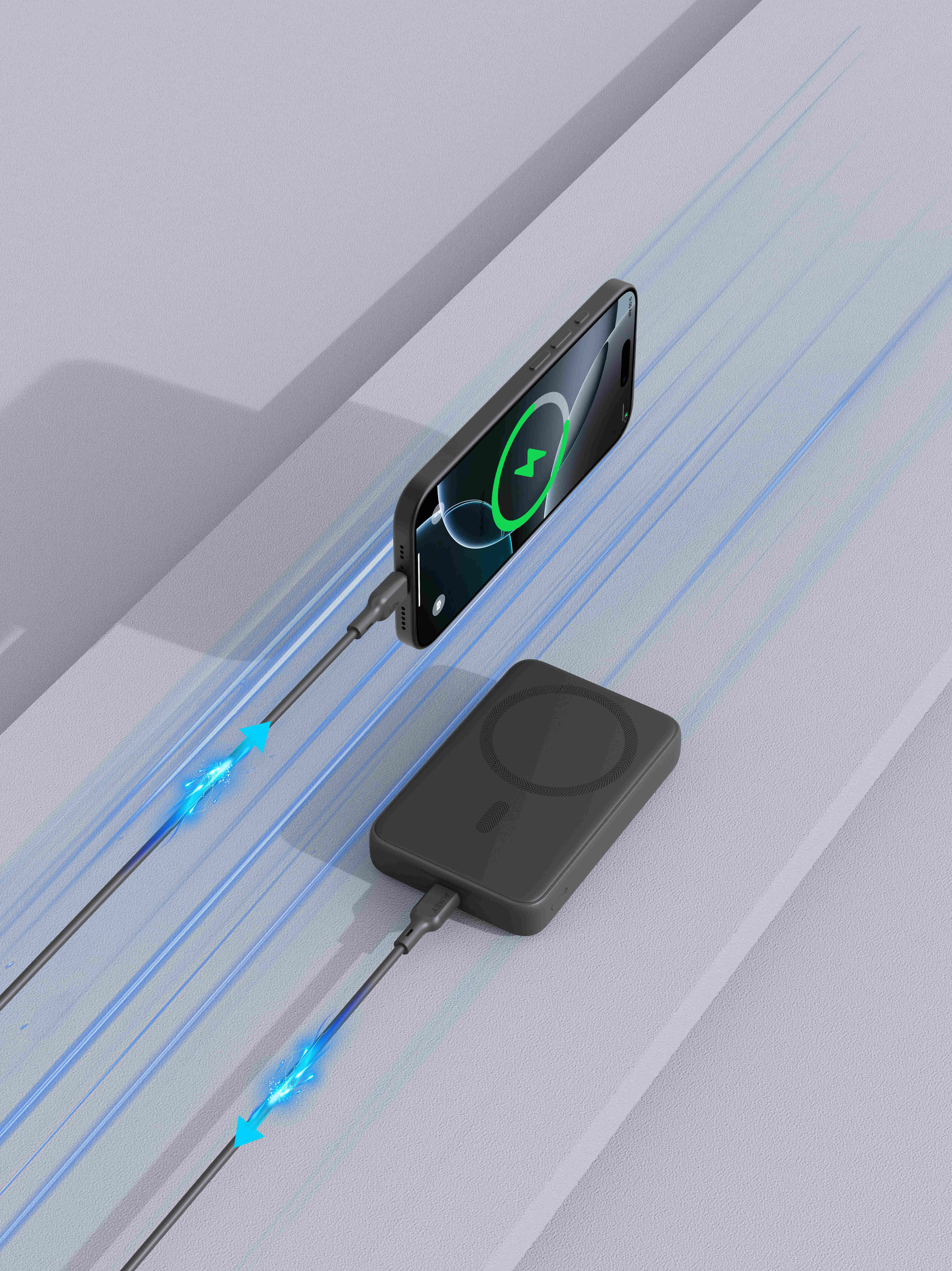 Slim20mmDesign:Schlank und tragbar, passt leicht in Taschen oder Beutel 7.5WMagSafeKompatibel: Bietet schnelles magnetisches kabelloses Laden für MagSafe-fähige Geräte. Schnelles kabelgebundenes Aufladen: 18 W Eingang und 20 W Ausgang über USB-C für schnelle der Powerbank.