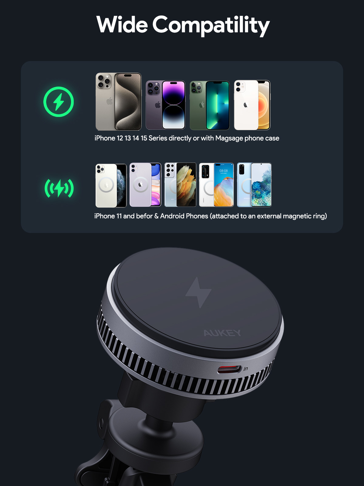 AUKEY MagFusion Dash Phone Mount HD-MC13A w. Cooling System 15W, Qi2