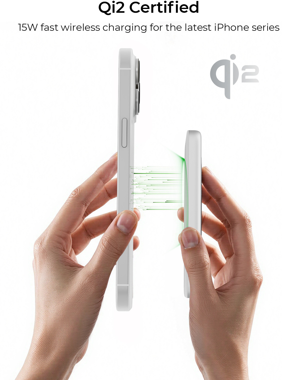 Die Powerbank ist dünner und leichter und passt perfekt in Ihre Tasche, Ihren Geldbeutel und Ihre Handtasche, es ist somit ein hervorragender Ladebegleiter, den Sie überallhin mitnehmen können. Das Metallgehäuse der Powerbank ist äußerst widerstandsfähig gegen Stürze, Abnutzung, Schmutz und hohe Temperaturen, und bietet somit außergewöhnliche Haltbarkeit und Schutz. Das Metallgehäuse sorgt außerdem dafür, dass die Wärme leicht abgeleitet werden kann, was einen stabilen internen Betrieb gewährleistet. Zertifiziert durch Qi2, ist es kompatibel mit Ihren Qi2-unterstützten Geräten und bietet ein schnelleres und sichereres Ladeerlebnis. Diese Powerbank bietet Ihnen zwei flexible alternative Methoden zum schnellen Aufladen 20W wired &15W Wireless. Ob kabelgebunden oder kabellos, Ihre Geräte bleiben immer mit Strom versorgt. Stellen Sie sicher, dass Ihr Telefon die ganze Zeit an der Powerbank befestigt und angeschlossen bleibt.