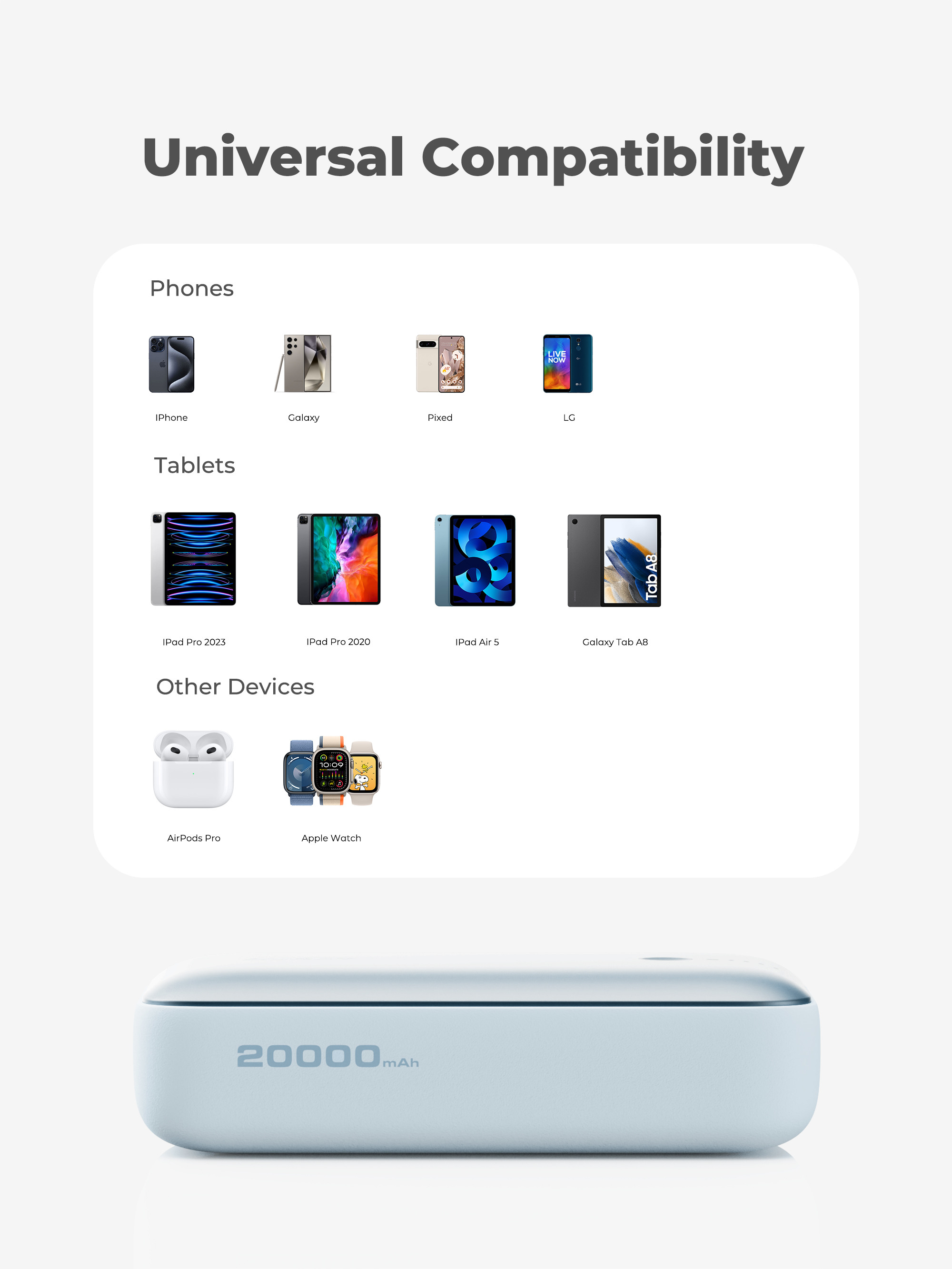 - Hohe Kapazität: Mit einer beeindruckenden Kapazität von 20000 mAh, verpackt in einem kompakten Design, bietet diese Powerbank umfangreiche Lademöglichkeiten, die es Ihnen ermöglichen, die meisten Smartphones mehrfach aufzuladen und sogar größere Geräte wie Tablets zu unterstützen.