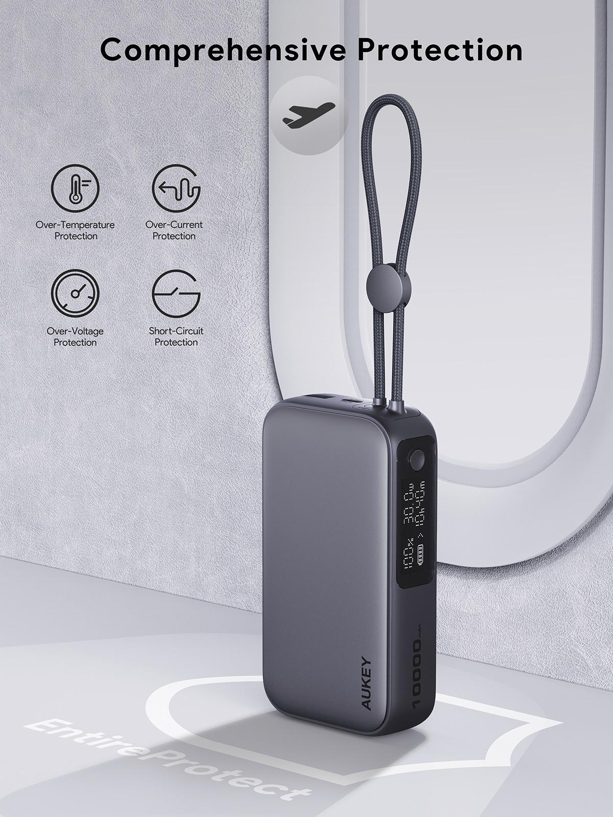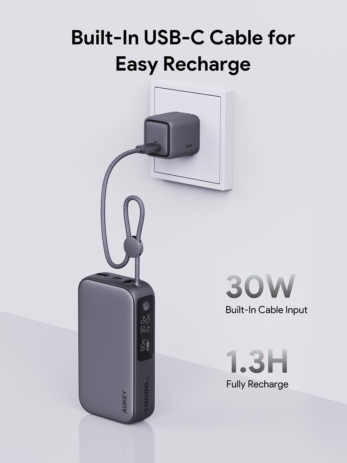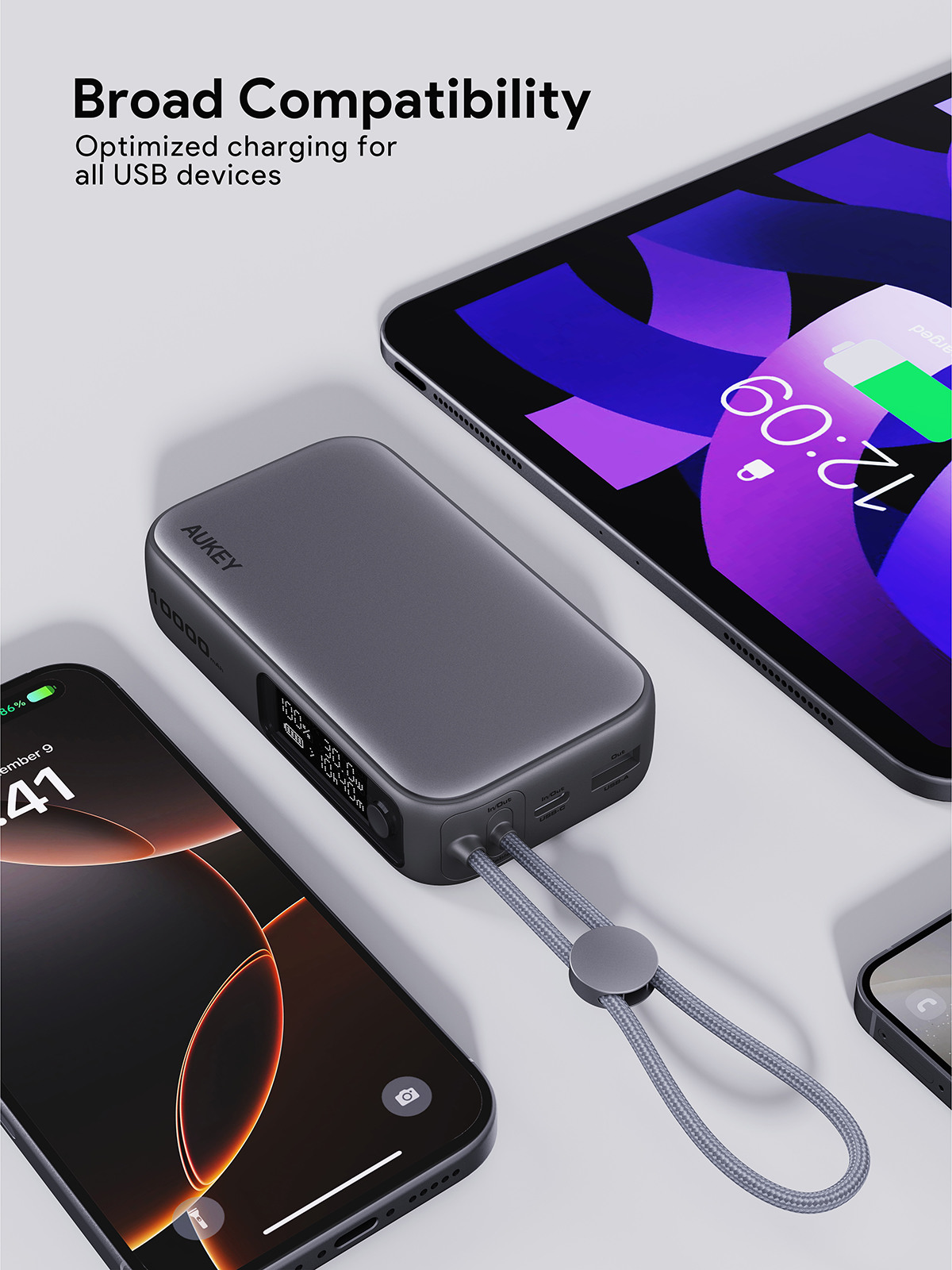 Eingebautes geflochtenes USB-C-Kabel: Das robuste, geflochtene USB-C-Kabel ist in die Powerbank integriert und sorgt dafür, dass Sie immer eine robuste, verwicklungsfreie Ladeoption zur Hand haben. Intelligentes digitales Display: Verfügt über ein klares digitales Display, das die verbleibende Akkulaufzeit und den Ladestatus in Echtzeit anzeigt und so ein besseres Energiemanagement ermöglicht. 30W High-Speed-Laden & Wiederaufladen: Liefert eine schnelle und effiziente Ladeleistung, mit der Geräte wie Smartphones, Tablets und sogar einige Laptops schnell aufgeladen werden können.