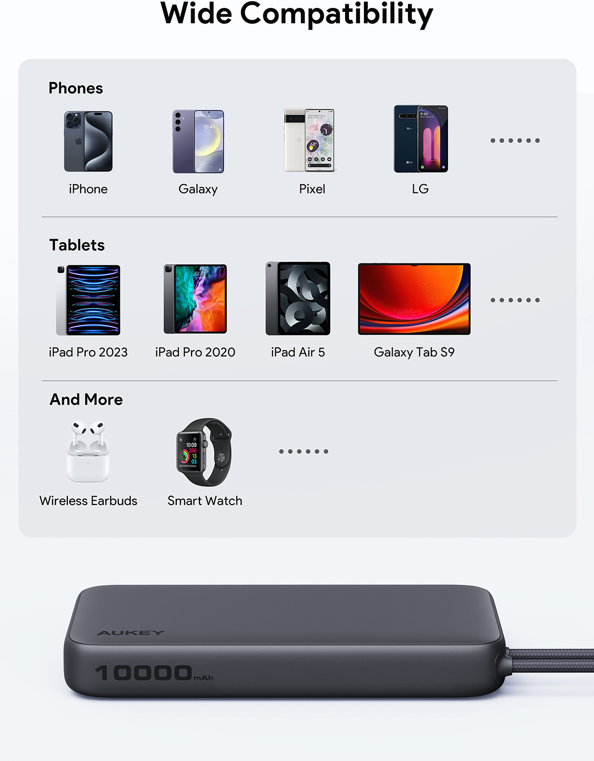 Ultra-schlankes Design: Mit einer Dicke von nur 17 mm ist diese ultradünne Powerbank außergewöhnlich tragbar und passt problemlos in Taschen, Beutel und sogar in die kleinsten Räume. Eingebautes nylongeflochtenes USB-C-Kabel:Dieses auf Langlebigkeit und Zuverlässigkeit ausgelegte, verwicklungsfreie Kabel stellt sicher, dass Sie immer eine Ladelösung zur Hand haben, ohne dass Sie zusätzliche Kabel benötigen.Hohe Kapazität: 10000 mAh, damit Ihre Geräte den ganzen Tag lang geladen bleiben