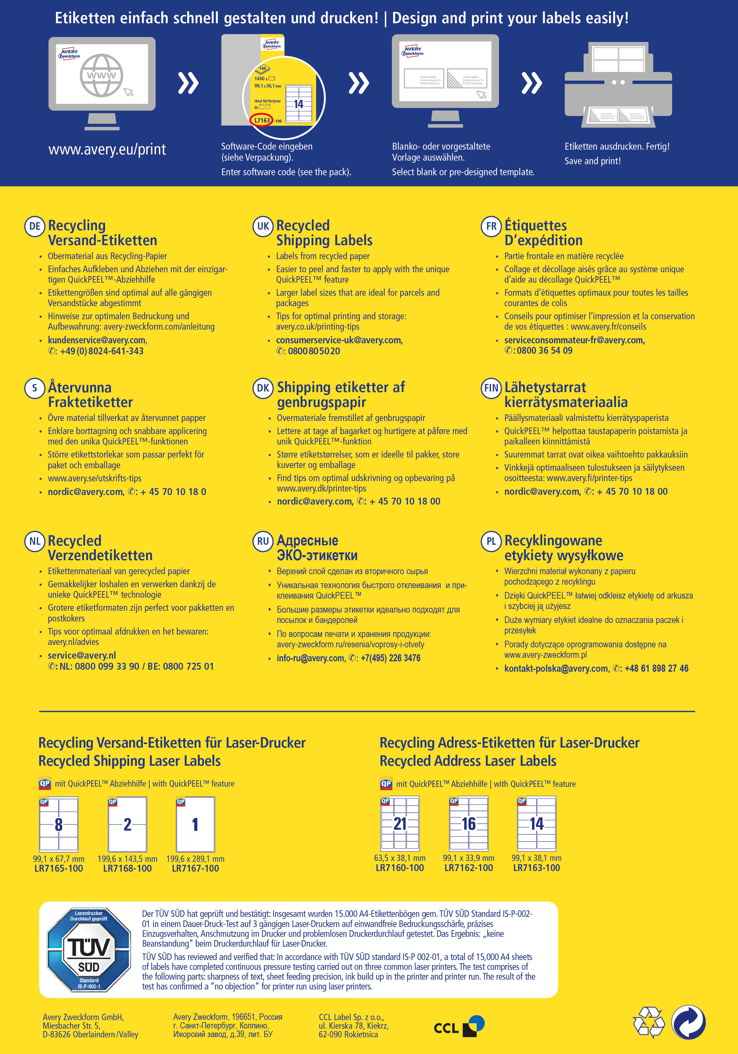 Qualität vom Etiketten-Experten: die naturweissen Recycling Versand-Etiketten LR7168-100 für Laser-Drucker im Format 199,6 x 143,5 mm von Avery Zweckform eignen sich z.B. ideal für Pakete und Päckchen oder für die DHL Online Frankierung. 200 Aufkleber auf 100 Bogen. Das Beste für die Umwelt: das Etiketten-Material der umweltfreundlichsten Etiketten von Avery Zweckform besteht zu 100% chlorfrei gebleichtem Altpapier. Der Klebstoff ist wasserbasiert und das Produkt ist ausgezeichnet mit dem Blauen Engel. Bei der Herstellung entstehen weniger Emissionen, die Produktionsabfälle werden komplett wiederverwertet. Das ist Nachhaltigkeit „Made in Germany“ und die erste Wahl für die Zukunft unserer Erde. Ideen drucken - einfach & professionell: mit Etiketten von Avery Zweckform können Sie den kostenlosen Online Etiketten-Designer unter www.avery.eu/print nutzen. Gestalten Sie Ihr Etikett mit der Software komplett selbst, verwenden Sie eine der Design-Vorlagen zu zahlreichen Themen, die Sie individuell anpassen können oder laden Sie Ihr fertiges Design hoch und drucken anschliessend standgenau aus. So schnell und einfach sorgen Sie für einen professionellen Auftritt. Think & Care - Avery Zweckform ist seit 2020 klimaneutral: die Treibhausgasemissionen des Standortes werden durch zertifizierte Klimaschutzprojekte ausgeglichen. Schon seit 2014 wird ausschliesslich Ökostrom/-gas verwendet. Forschung, Entwicklung, Produktion, Logistik und Verwaltung am Firmenstandort in Oberlaindern/Bayern garantieren höchste Qualitäts- und Umweltstandards sowie kurze Lieferwege.