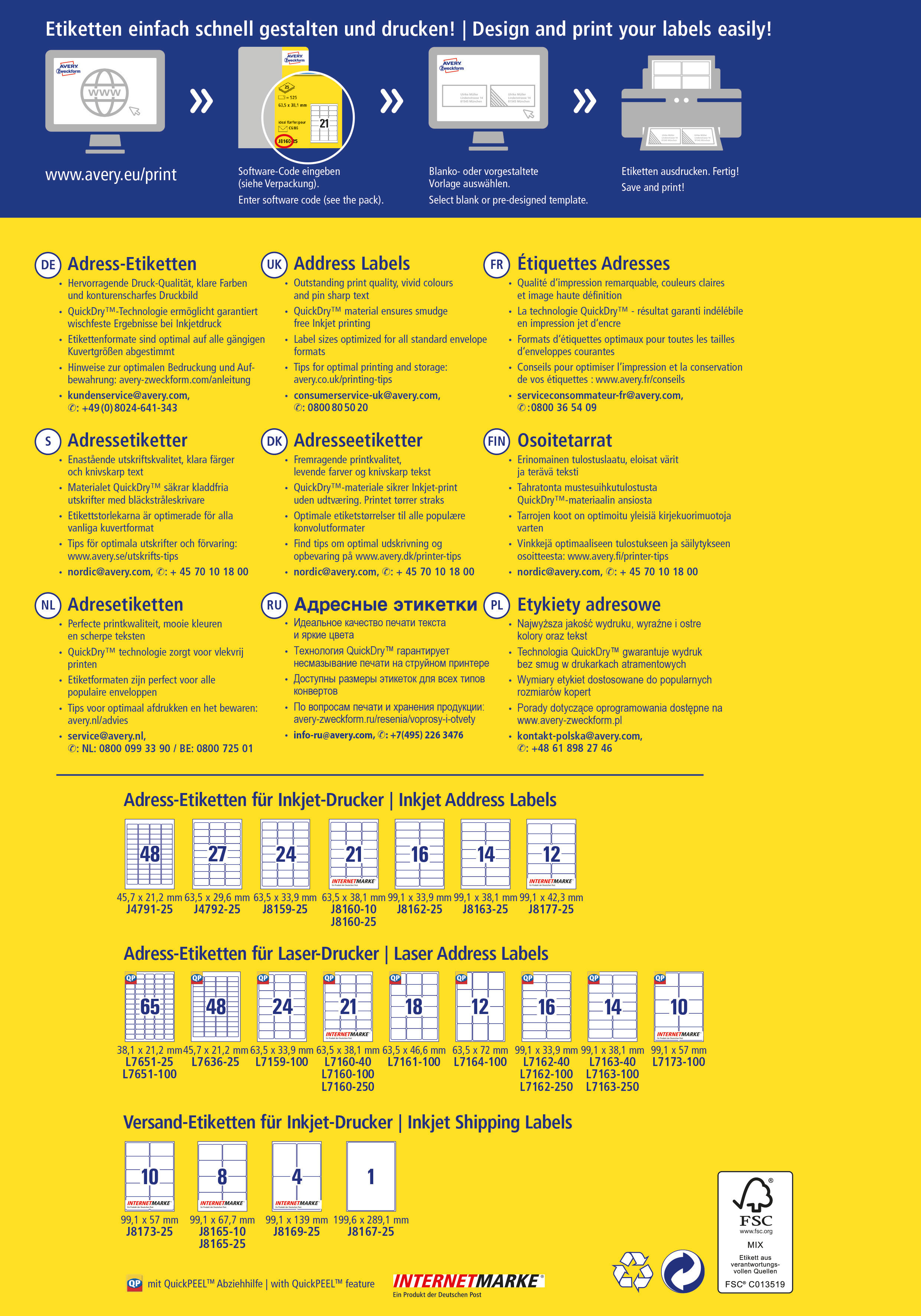 Qualität vom Etiketten-Experten: die weissen, spezialbeschichteten Adress-Etiketten J8160-25 für Inkjet-Drucker im Format 63,5 x 38,1 mm von Avery Zweckform sind optimal auf alle gängigen Kuvertgrössen abgestimmt und eignen sich z.B. zum Adressieren von C6 Kuverts. Die Etiketten sind auch geeignet für die INTERNETMARKE der Deutschen Post. 525 Adress-Etiketten pro Packung auf 25 Bogen. Die spezielle QuickDry-Technologie garantiert wischfeste Ergebnisse, damit Sie für Ihre Aussendungen ein konturenscharfes Druckbild mit klaren Farben erhalten. Geeignet für alle gängigen Inkjet-Drucker. Ideen drucken – einfach & professionell: mit Etiketten von Avery Zweckform können Sie den kostenlosen Online Etiketten-Designer unter www.avery.eu/print nutzen. Gestalten Sie Ihr Etikett mit der Software komplett selbst, verwenden Sie eine der Design-Vorlagen zu zahlreichen Themen, die Sie individuell anpassen können oder laden Sie Ihr fertiges Design hoch und drucken anschliessend standgenau aus. So schnell und einfach sorgen Sie für einen professionellen Auftritt. Think & Care - Avery Zweckform ist seit 2020 klimaneutral: die Treibhausgasemissionen des Standortes werden durch zertifizierte Klimaschutzprojekte ausgeglichen. Schon seit 2014 wird ausschliesslich Ökostrom/-gas verwendet. Forschung, Entwicklung, Produktion, Logistik und Verwaltung am Firmenstandort in Oberlaindern/Bayern garantieren höchste Qualitäts- und Umweltstandards sowie kurze Lieferwege. Das Obermaterial dieser chlorfrei gebleichten Etiketten wird zu 100% aus FSC®-zertifiziertem Papier aus verantwortungsvoll bewirtschafteten Wäldern hergestellt.