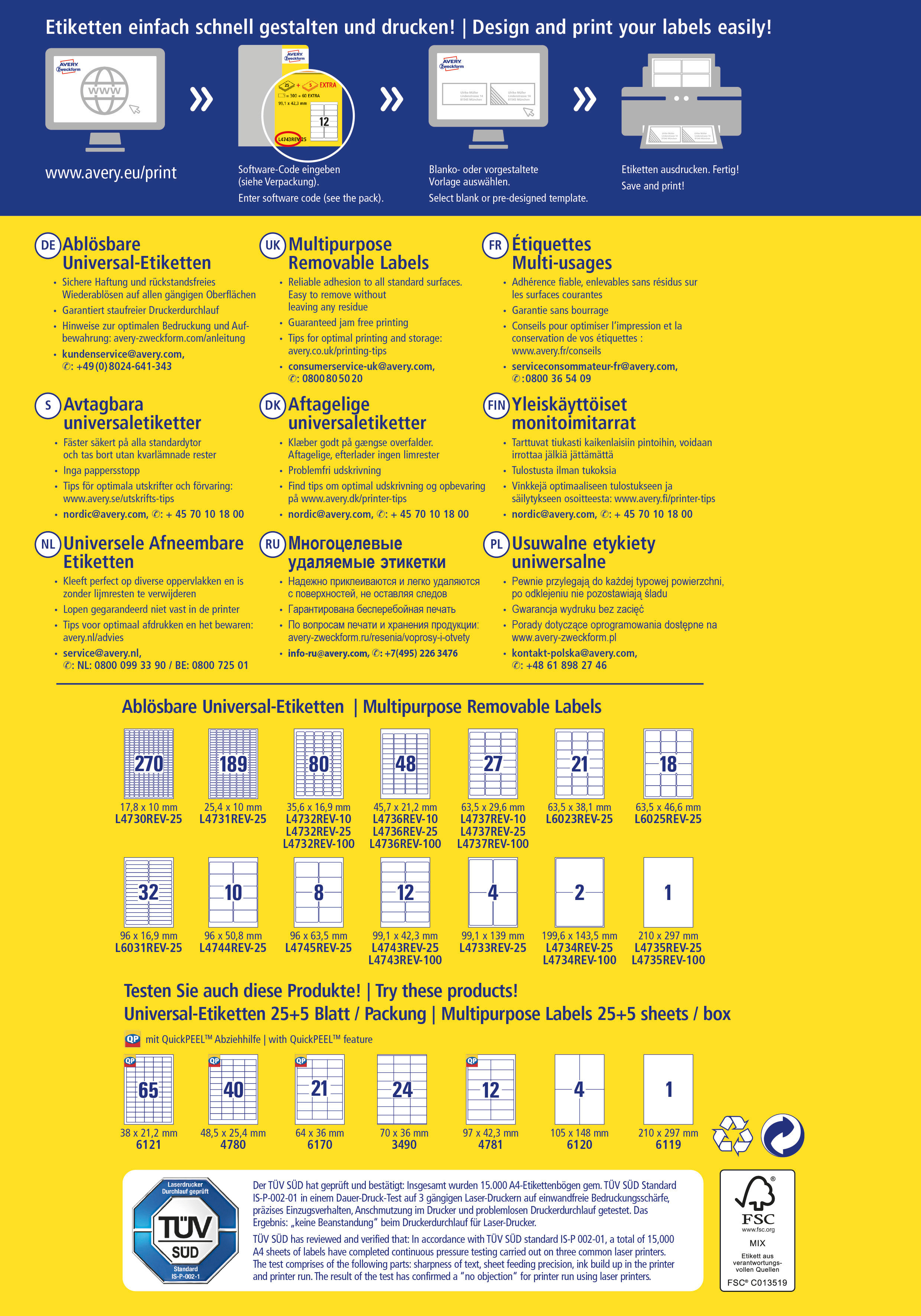 Qualität vom Etiketten-Experten: mit 5 Blatt EXTRA-Inhalt! Die weissen ablösbaren Etiketten L4736REV-25 im Format 45,7 x 21,2 mm von Avery Zweckform haften sicher auf den verschiedensten Oberflächen und können entfernt werden, ohne Klebstoffrückstände zu hinterlassen. Sie eignen sich sehr gut z.B. zur Beschriftung von Gewürzen (1.200 Etiketten/Pack + 240 Etiketten EXTRA).Universal-Etiketten für jeden Bedarf: mit einem gestochen scharfen Druckbild ohne Verwischen - durch beste Tonerverankerung. Sie können sich auf einen absolut staufreien Druckerdurchlauf ohne Klebstoffablagerungen im Drucker verlassen. Regelmässig überprüft und für Laser bestätigt durch TÜV Süd. Geeignet für alle Laser- und Inkjet-Drucker. So arbeiten Sie effizient wie stressfrei und schaffen sich wertvolle Zeit für die wirklich wichtigen Dinge. Ideen drucken - einfach & professionell: mit Etiketten von Avery Zweckform können Sie den kostenlosen Online Etiketten-Designer unter www.avery.eu/print nutzen. Gestalten Sie Ihr Etikett mit der Software komplett selbst, verwenden Sie eine der Design-Vorlagen zu zahlreichen Themen, die Sie individuell anpassen können oder laden Sie Ihr fertiges Design hoch und drucken anschliessend standgenau aus. So schnell und einfach sorgen Sie für einen professionellen Auftritt.Think & Care - Avery Zweckform ist seit 2020 klimaneutral: die Treibhausgasemissionen des Standortes werden durch zertifizierte Klimaschutzprojekte ausgeglichen. Schon seit 2014 wird ausschliesslich Ökostrom/-gas verwendet. Forschung, Entwicklung, Produktion, Logistik und Verwaltung am Firmenstandort in Oberlaindern/Bayern garantieren höchste Qualitäts- und Umweltstandards sowie kurze Lieferwege. Das Obermaterial dieser chlorfrei gebleichten Etiketten wird zu 100% aus FSC®-zertifiziertem Papier aus verantwortungsvoll bewirtschafteten Wäldern hergestellt.