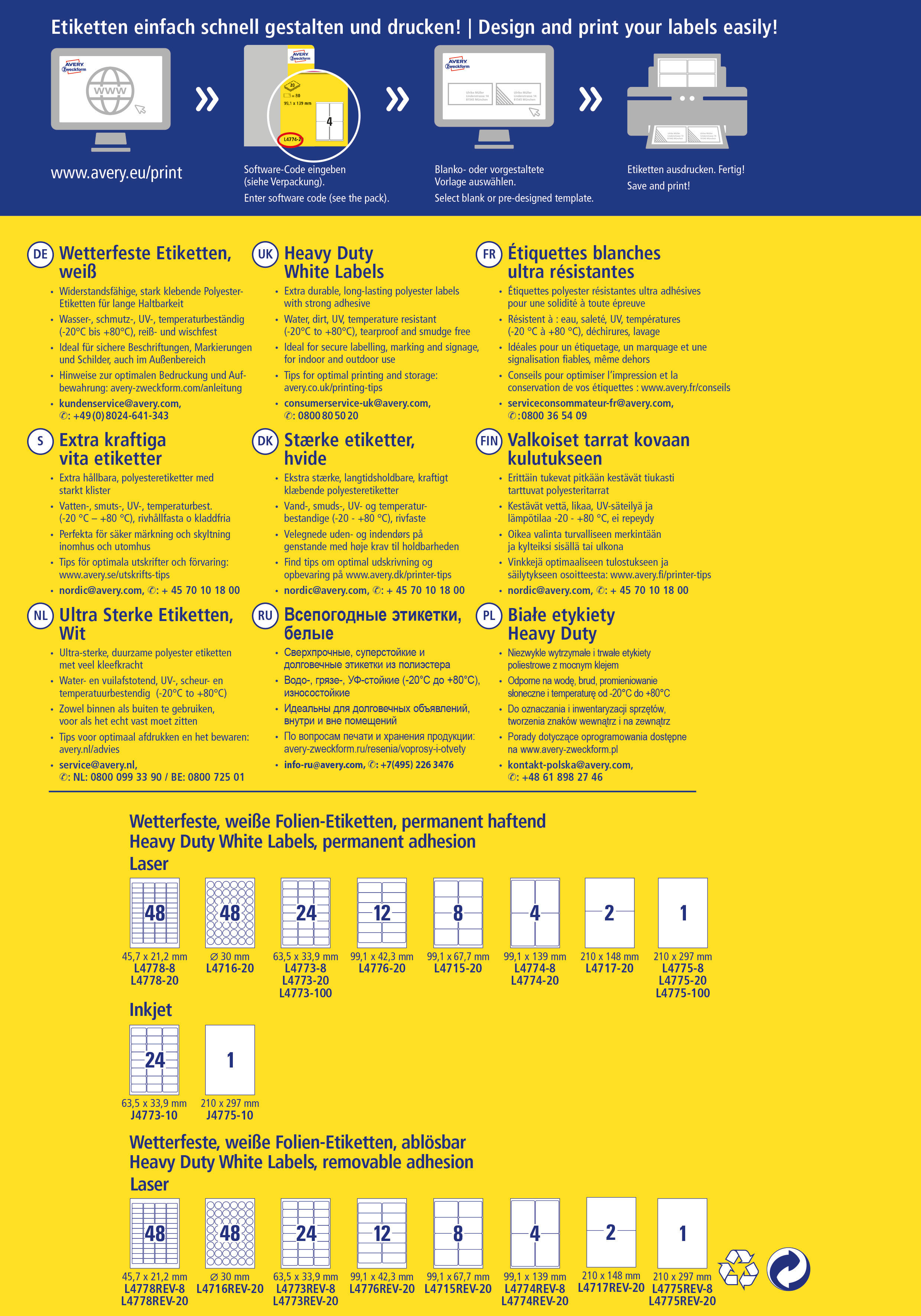 Qualität vom Etiketten-Experten: die weissen, wetterfesten Etiketten J4773-10 im Format 63,5 x 33,9 mm für Inkjet-Drucker von Avery Zweckform zeichnen sich durch eine extreme Strapazierfähigkeit im Innen- und Aussenbereich aus. 240 Inkjet-beschichtete Folien-Etiketten aus Polyester auf 10 Bogen. Durch die starke, permanente Haftung eignen sie sich besonders zur wetterfesten und dauerhaften Kennzeichnung. Die reiss- und wasserfesten Folien-Etiketten sind deutlich strapazierfähiger als Papier-Etiketten, öl-, schmutz-, UV- und temperaturbeständig (-20° bis +80°C), seewasserfest und abwaschbar. Für alle gängigen Inkjet-Drucker geeignet. Ideen drucken - einfach & professionell: mit Etiketten von Avery Zweckform können Sie den kostenlosen Online Etiketten-Designer unter www.avery.eu/print nutzen. Gestalten Sie Ihr Etikett mit der Software komplett selbst, verwenden Sie eine der Design-Vorlagen zu zahlreichen Themen, die Sie individuell anpassen können oder laden Sie Ihr fertiges Design hoch und drucken anschliessend standgenau aus. So schnell und einfach sorgen Sie für einen professionellen Auftritt. Think & Care - Avery Zweckform ist seit 2020 klimaneutral: die Treibhausgasemissionen des Standortes werden durch zertifizierte Klimaschutzprojekte ausgeglichen. Schon seit 2014 wird ausschliesslich Ökostrom/-gas verwendet. Forschung, Entwicklung, Produktion, Logistik und Verwaltung am Firmenstandort in Oberlaindern/Bayern garantieren höchste Qualitäts- und Umweltstandards sowie kurze Lieferwege. Die Etiketten aus PVC-freier Folie werden klimaneutral hergestellt, die Emissionen des Materials werden kompensiert.