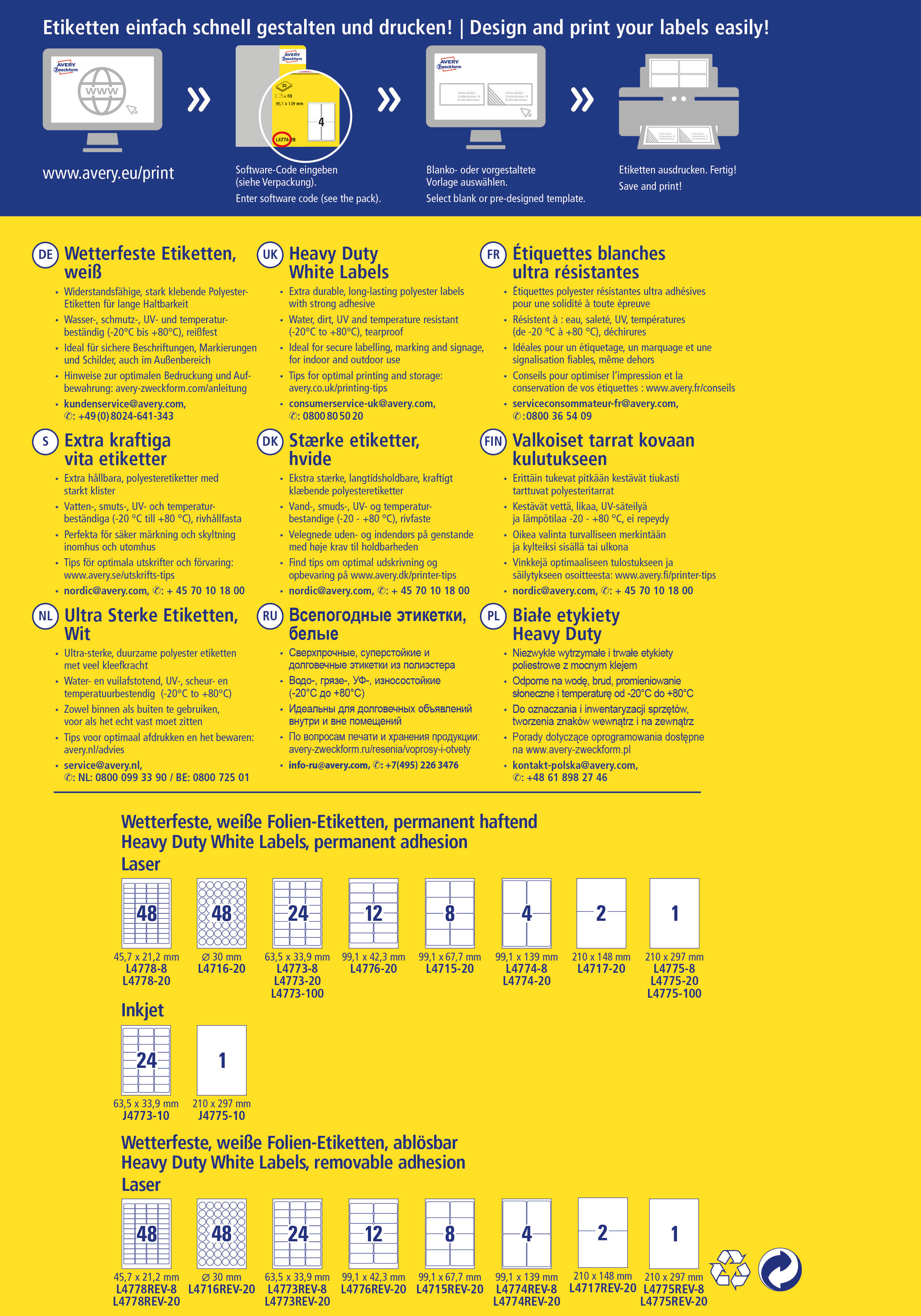 Qualität vom Etiketten-Experten: die weissen, wetterfesten Etiketten L4719-20 im Format 105 x 148 mm für Laser-Drucker von Avery Zweckform zeichnen sich durch eine extreme Strapazierfähigkeit im Innen- und Aussenbereich aus. 80 matt beschichtete Folien-Etiketten aus Polyester auf 20 Bogen. Durch die starke, permanente Haftung eignen sie sich besonders zur wetterfesten und dauerhaften Kennzeichnung. Die reiss- und wasserfesten Folien-Etiketten sind deutlich strapazierfähiger als Papier-Etiketten, öl-, schmutz-, UV- und temperaturbeständig (-20° bis +80°C), seewasserfest und abwaschbar. Für alle gängigen Laser-Drucker geeignet. Ideen drucken - einfach & professionell: mit Etiketten von Avery Zweckform können Sie den kostenlosen Online Etiketten-Designer unter www.avery.eu/print nutzen. Gestalten Sie Ihr Etikett mit der Software komplett selbst, verwenden Sie eine der Design-Vorlagen zu zahlreichen Themen, die Sie individuell anpassen können oder laden Sie Ihr fertiges Design hoch und drucken anschliessend standgenau aus. So schnell und einfach sorgen Sie für einen professionellen Auftritt. Think & Care - Avery Zweckform ist seit 2020 klimaneutral: die Treibhausgasemissionen des Standortes werden durch zertifizierte Klimaschutzprojekte ausgeglichen. Schon seit 2014 wird ausschliesslich Ökostrom/-gas verwendet. Forschung, Entwicklung, Produktion, Logistik und Verwaltung am Firmenstandort in Oberlaindern/Bayern garantieren höchste Qualitäts- und Umweltstandards sowie kurze Lieferwege. Die Etiketten aus PVC-freier Folie werden klimaneutral hergestellt, die Emissionen des Materials werden kompensiert.
