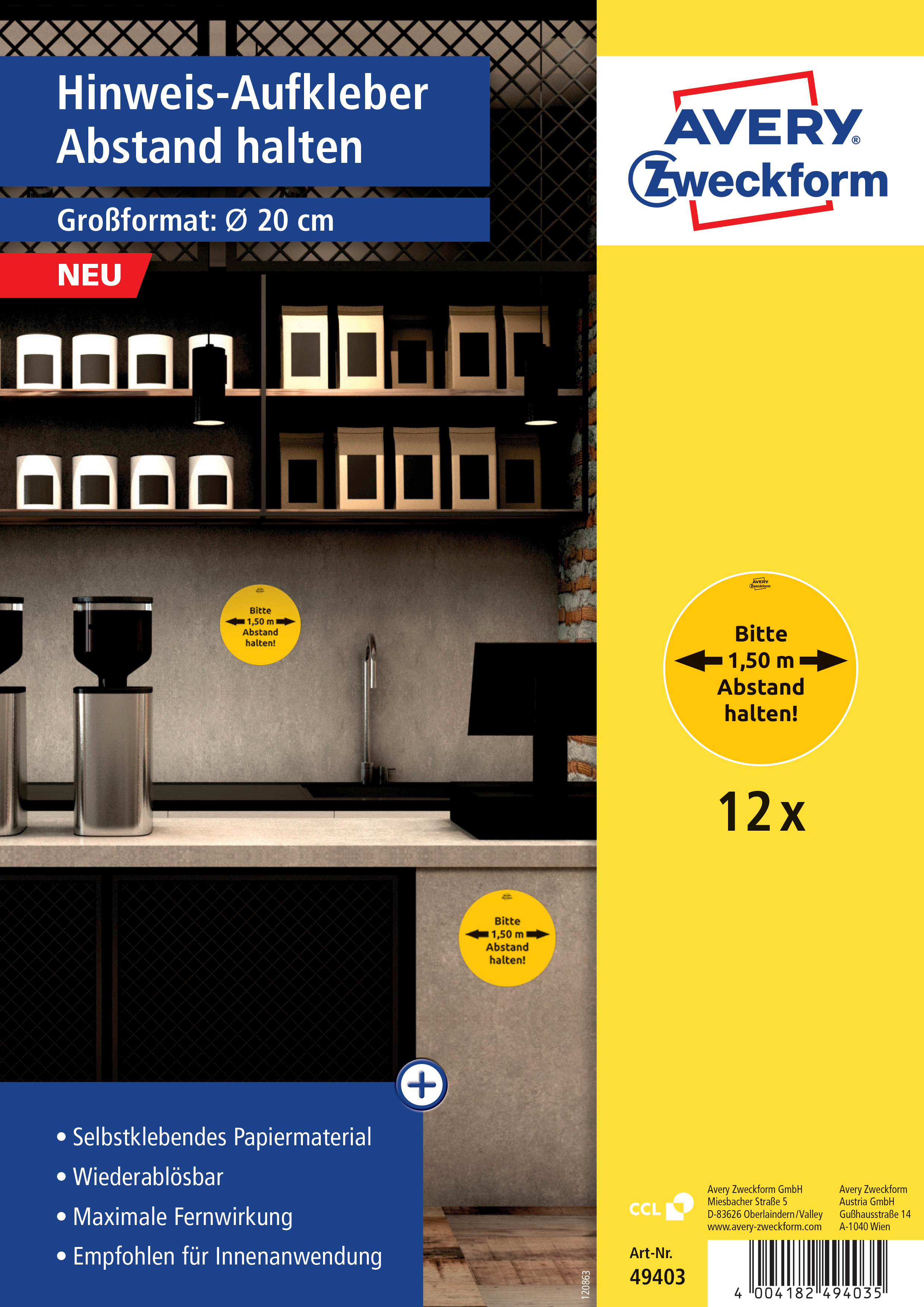 AVERY ZWECKFORM Hinweis-Aufkleber DE 20cm 49403 Abstand halten 12 Stück