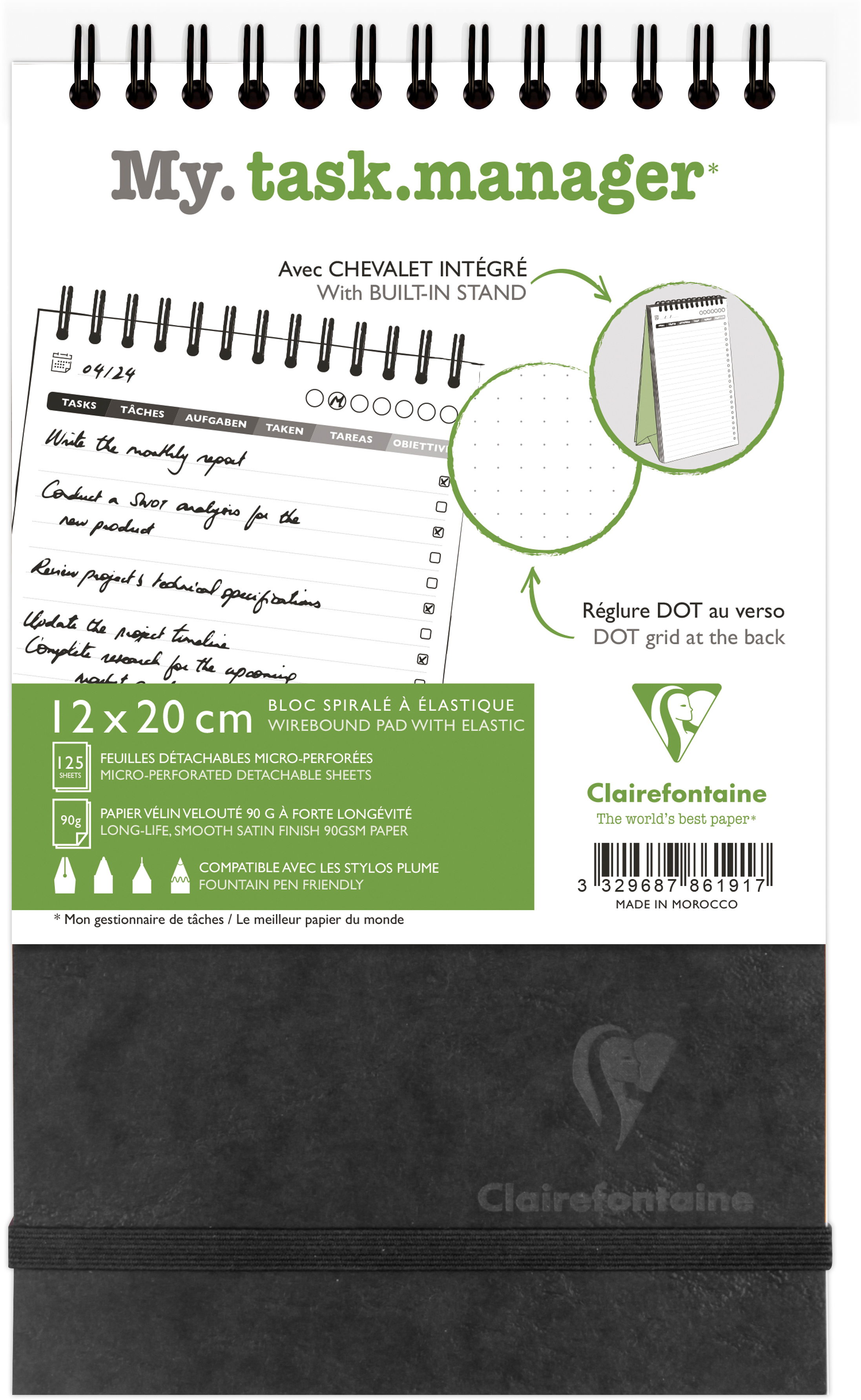 Der Block Age Bag- My.task.manager als Spiralblock 12x20 cm, mit 250 abtrennbare Seiten (125 Blatt) 90g, Rückseite punktkariert (dot) für die Organisation Ihrer Aufgaben: Tragen Sie die zu erledigenden Aufgaben ein und verfolgen Sie sie mit Hilfe der Kontrollkästchen für jede Aufgabe. Umranden Sie das Kästchen, wenn die Aufgabe Priorität hat, fügen Sie einen Strich hinzu, wenn die Aufgabe in Arbeit ist und einen zweiten Strich, wenn die Aufgabe bearbeitet wurde. Mit innen integriertem Aufsteller. Mit Gummizugverschluss auf dem Einband. Einband aus Karton, in der Masse gefärbt, gekörnt mit Lederstruktur: langlebig und widerstandsfähig. Samtweiches Velinpapier 90g von Clairefontaine, für ein einzigartiges Schreiberlebnis. Hergestellt in Frankreich. PEFC-zertifiziert für eine nachhhaltige Waldwirtschaft.