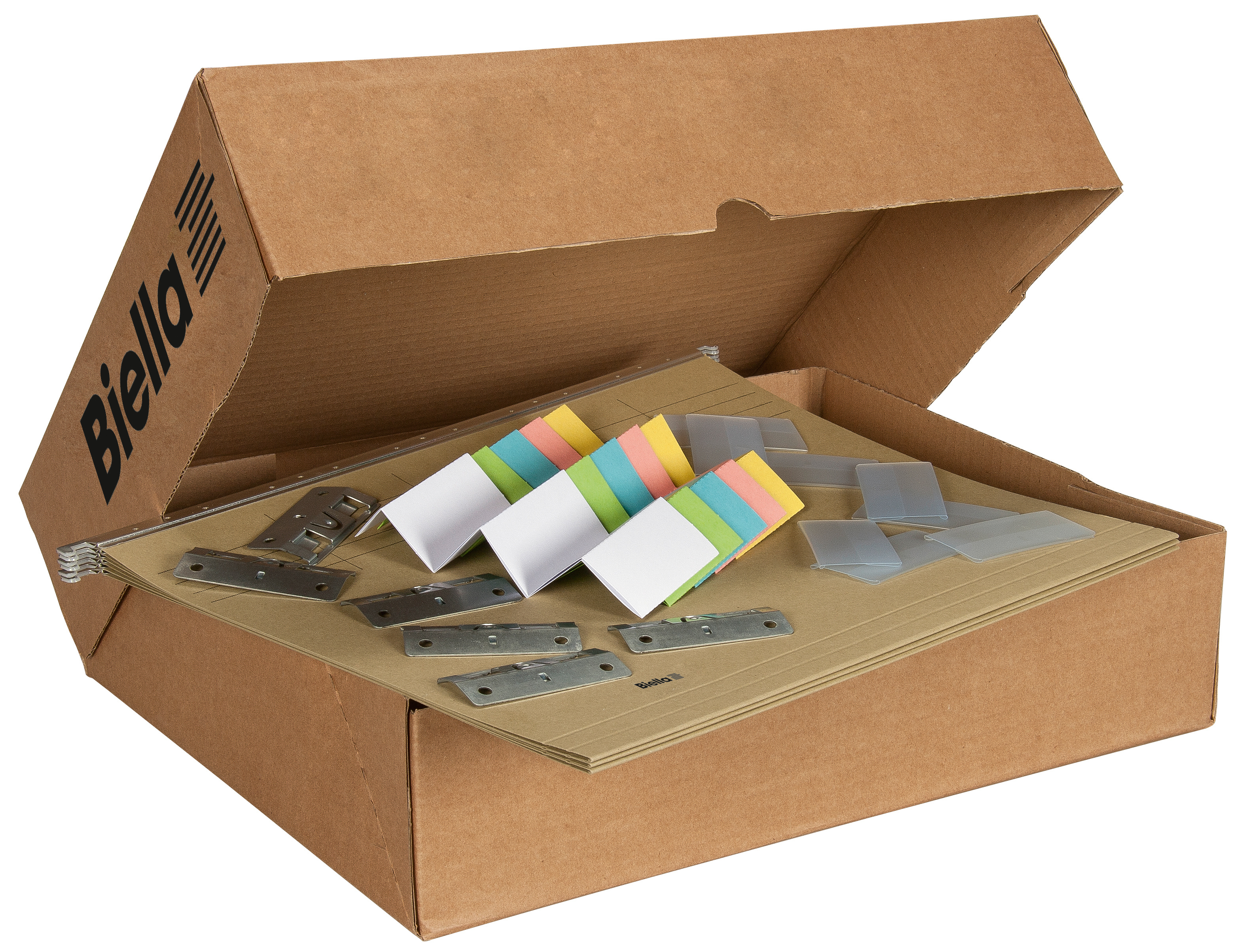Biella Hängemappen Original - das meistverbreitete Registratursystem in der Schweiz. Die Tragstange aus Metall mit eingepresstem Nylon-Gleitern garantiert ein leichtes, geräuschloses Verschieben der Hängemappen. Kürzeste Bearbeitungszeiten bei Loseblatt-Ablage, individuelle Anpassung der einzelnen Mappe an das Inhaltsvolumen. Für Format A4. Strapazierfähiger Karton. Inhalt: 25 Hängemappen 27042600U, 25 Metall-Clip-Reiter 27360100U, 25 Klarsichthülsen farblos 27360203U, 30 Beschriftungsetiketten weiss und 10 Beschriftungsetiketten blau, gelb, grün, rosa 27360301U.