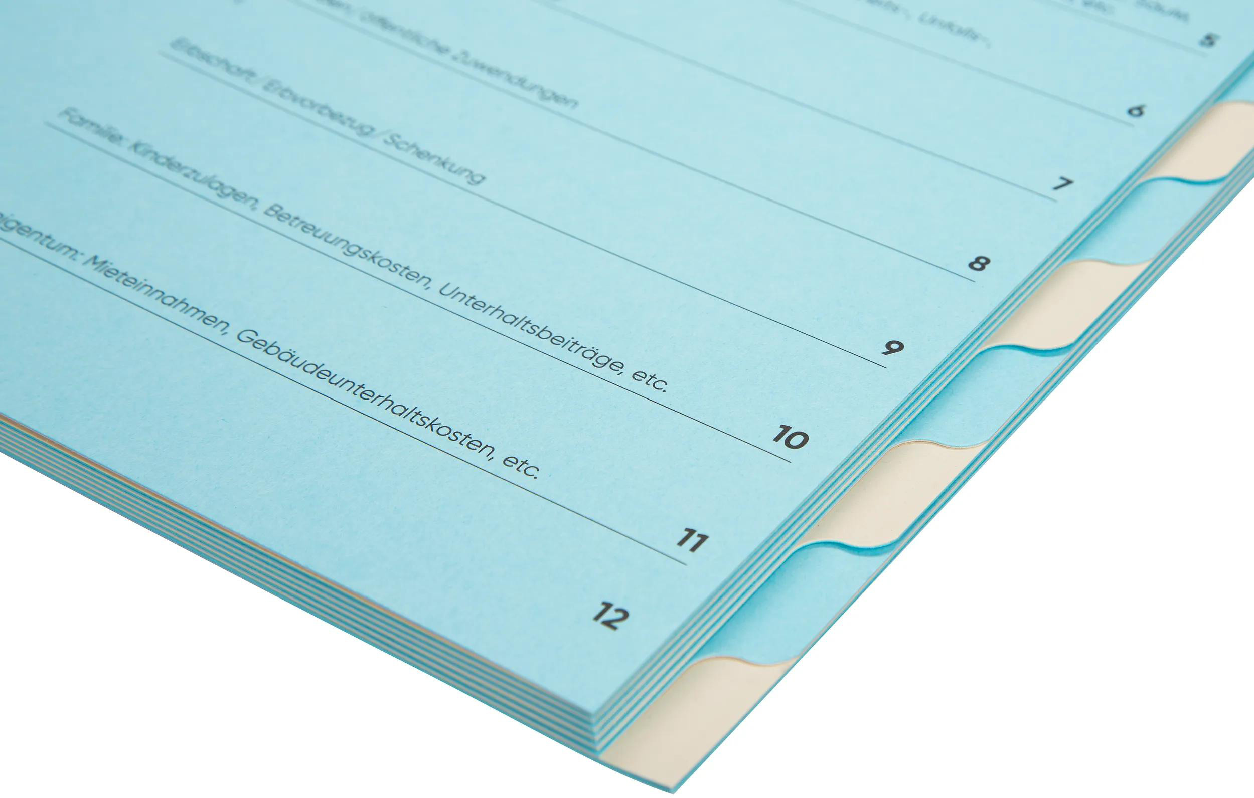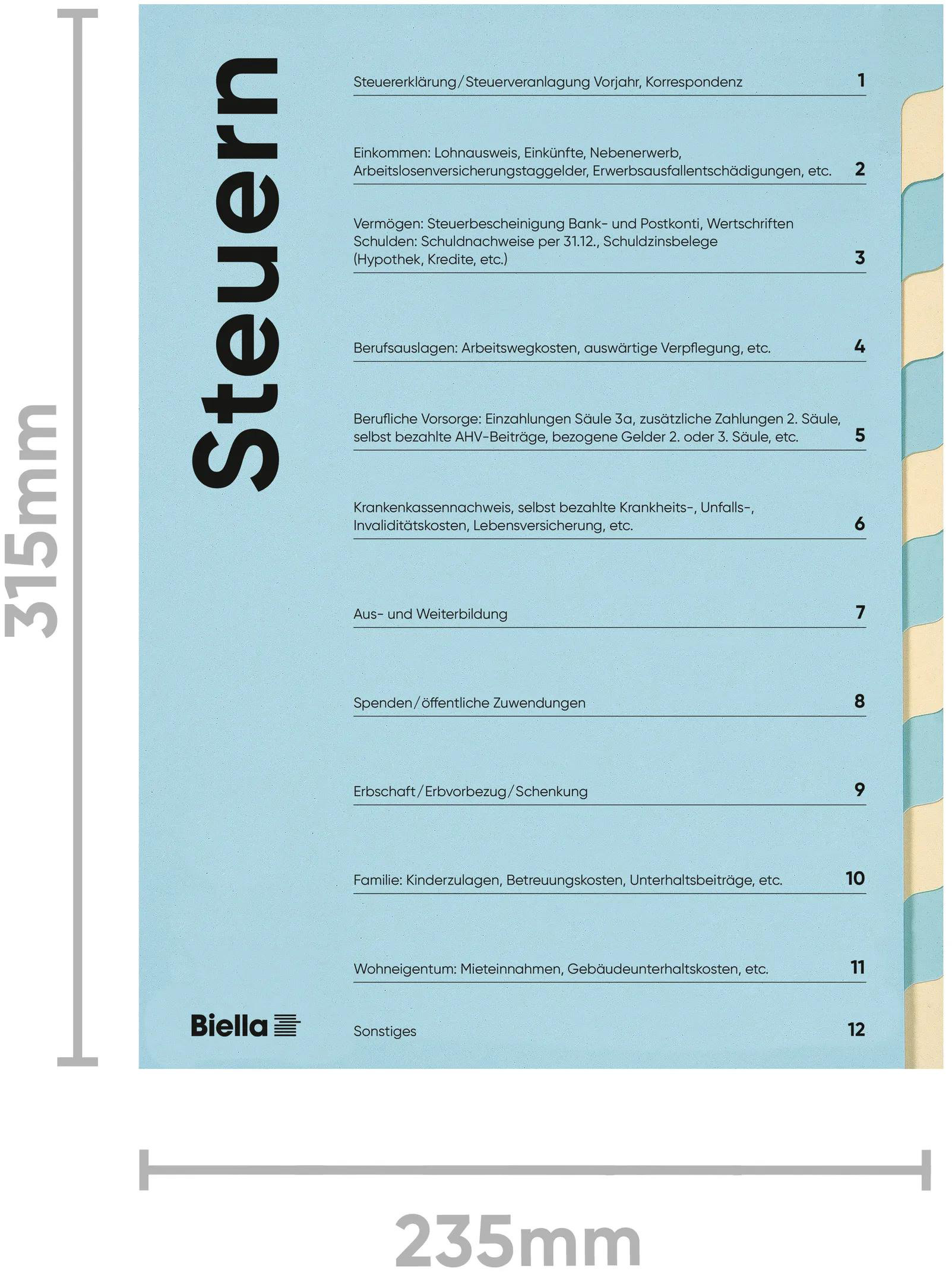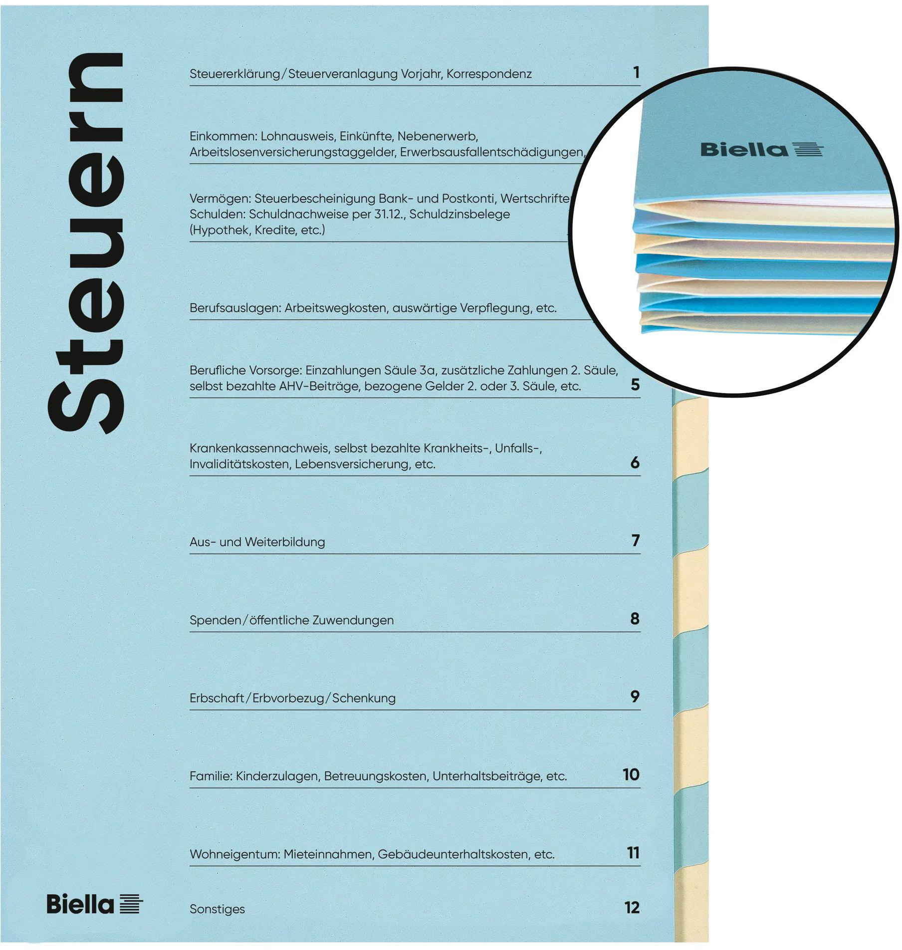 Mit der Biella Steuermappe sammeln Sie bequem und organisiert Ihre Steuerunterlagen und Belege während dem laufenden Jahr. Mittels 12-teiligem Register und dem vorgegebenen Inhaltsverzeichnis in Deutsch oder Französisch können Sie Ihre Dokumente übersichtlich ordnen. Dank der Biella Steuermappe haben Sie Ihre Unterlagen parat, sobald es an der Zeit ist, Ihre Steuererklärung auszufüllen. Die Mappe wächst dank dem flexiblen Rücken mit dem Inhalt mit und lässt sich optimal in die Biella Hängemappen Original integrieren.