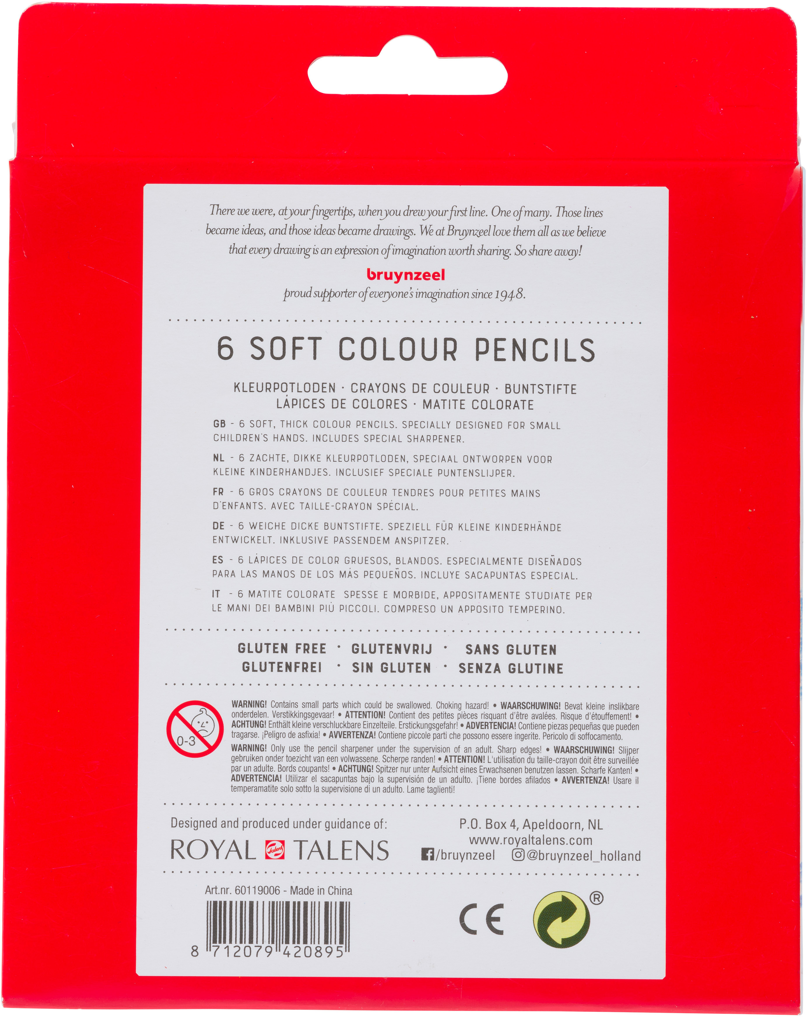 Die dicken Wachsmalstifte von Bruynzeel wurden speziell für kleine Kinderhände entwickelt. Der Kern ist besonders robust und dabei so weich wie Wachsmalstifte für eine besonders gute Farbabgabe! Das Paket enthält 6 Stifte in den beliebtesten Farben und einen passenden Anspitzer. Geeignet für Kinder ab 3 Jahren. Eigenschaften: besonders gute Farbabgabe und lebendige Farben, ideal zur Förderung von Feinmotorik und Kreativität, glutenfrei.