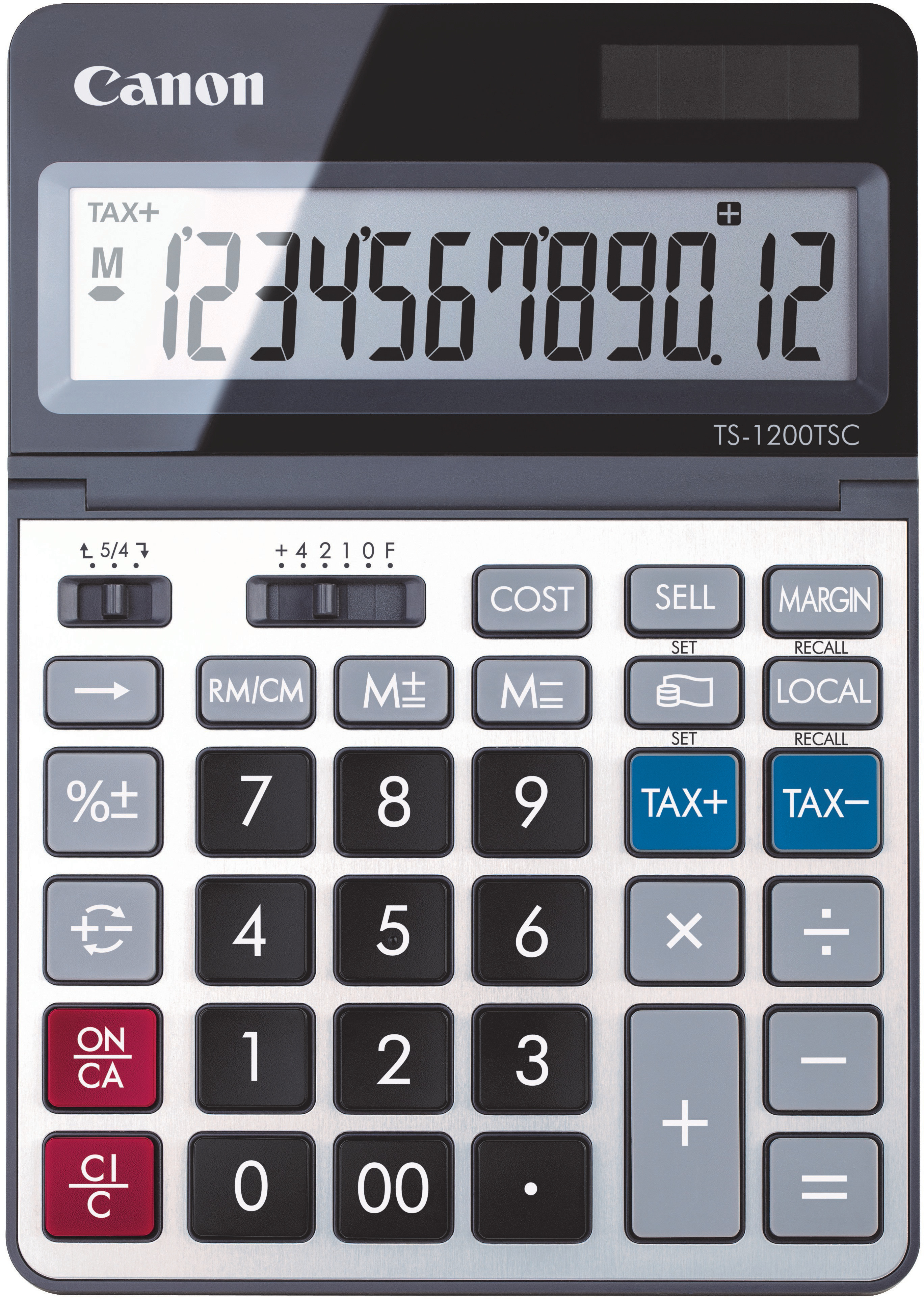 Dieser grosse zwölfstellige Tischrechner hat ein grosses, verstellbares LC-Display mit sehr guter Lesbarkeit bei unterschiedlichen Lichtverhältnissen. Praktische Funktionen zur Steuerberechnung und Währungsumrechnung erhöhen die Vielseitigkeit. Vorstellung des neuen Canon TS-1200TSC Tischrechners. Der TS-1200TSC verfügt über eine einstellbare 12-stellige LCD-Anzeige und eine Vielzahl von Befehlen wie Steuerfunktionen, Währungsumrechnung und Geschäftsberechnungen. Mit einer Metallblende und einem grossen LCD-Display ist der TS-1200TSC der ideale Taschenrechner für jede Schul- oder Heimbüroumgebung.