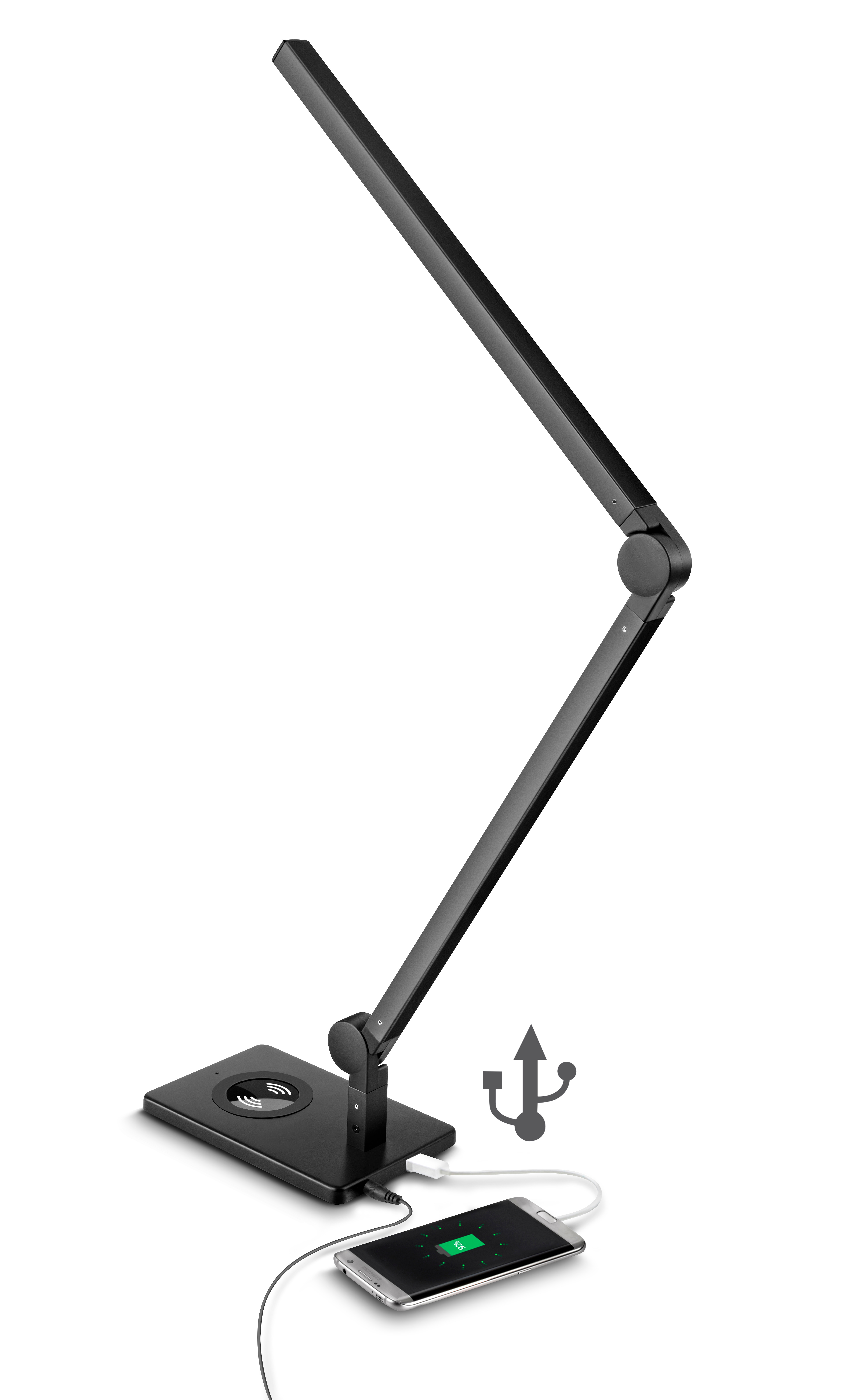 LED-Lampe mit kabelloser Ladestation, sehr robust (Metallstruktur) und extrem leistungsstark (7,2 W), ausgestattet mit einem taktilen Dimmer (max. 230 lm), einem taktilen Farbdimmer (von 3000k bis 5500k) und mit einer Lebensdauer von 50 000h. Dank dieser Lampe können Sie auch 2 Smartphones gleichzeitig über einen USB-Anschluss aufladen (5V2A ultraschnelles Aufladen) sowie ein kabelloses Telefonladegerät (kompatibel mit allen Smartphones und Geräten mit dieser Technologie).