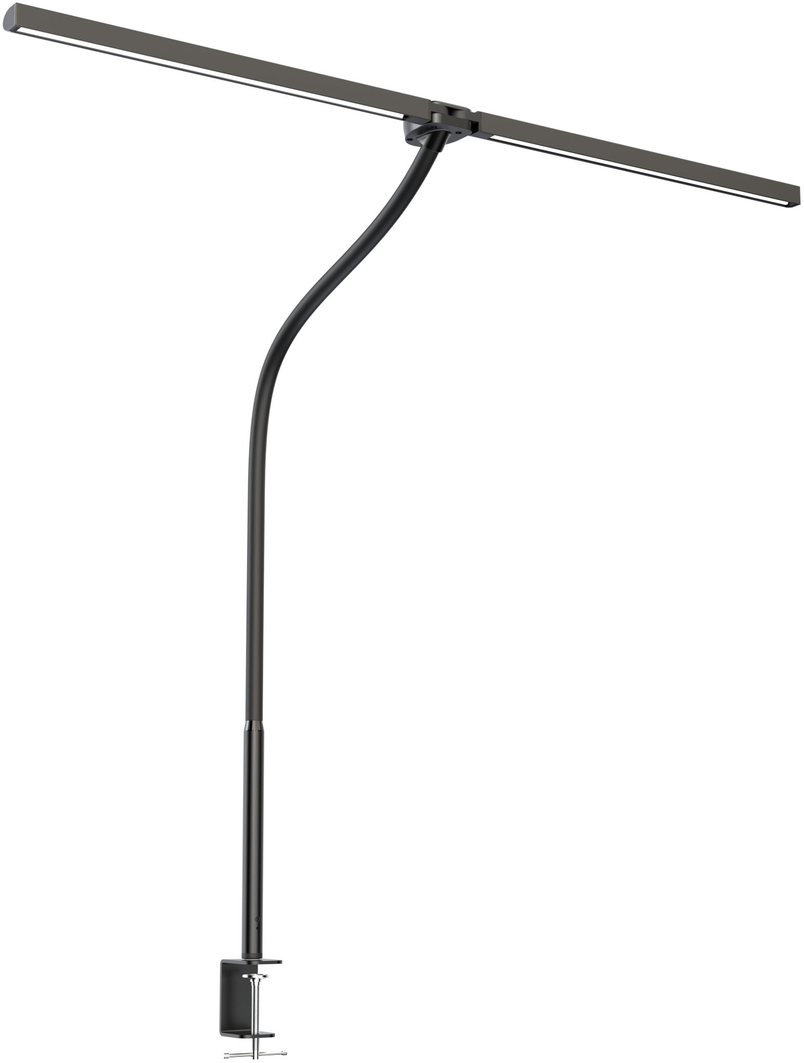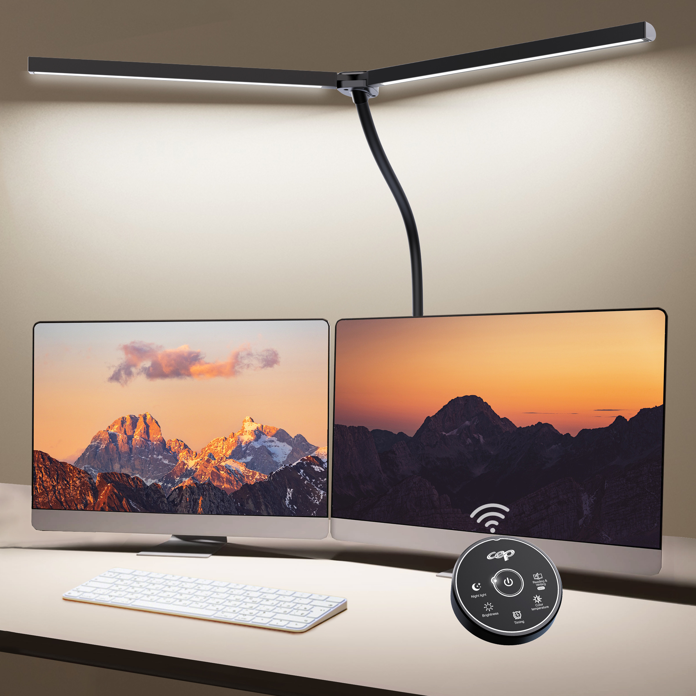 Tischleuchte mit innovativem Design: 2 LED-Lampenköpfe Die beiden LED-Köpfe sind beweglich (sie können zu einem einzigen LED-Modul zusammengefügt werden). Arm ist schwenkbar. Das Licht kann frei auf den gewünschten Winkel eingestellt werden. Die 2 Köpfe bieten eine sehr große Leuchtfläche. Praktisch bei Nutzung von zwei Bildschirmen. Asymmetrische blendfreie Beleuchtung. Klemmfuß mit Schraubzwinge, der eine sichere Anbringung am Bürotisch ermöglicht. Platzsparend. Leistung: 20W /24V-1A. Aus ABS Material+Stahl. Farbtemperatur 3000K/5700k-5500K. Lumen 1100lm. LED typ SMD/2835.CRI >95. Fernbedienung + Berührungsschalter: Sie können die Leuchte mit der Fernbedienung ein- und ausschalten, sowie Helligkeit und Farbtemperatur einstellen. Abmessungen: H 67cm, Länge (pro Kopf): 80 cm Farbe: Schwarz