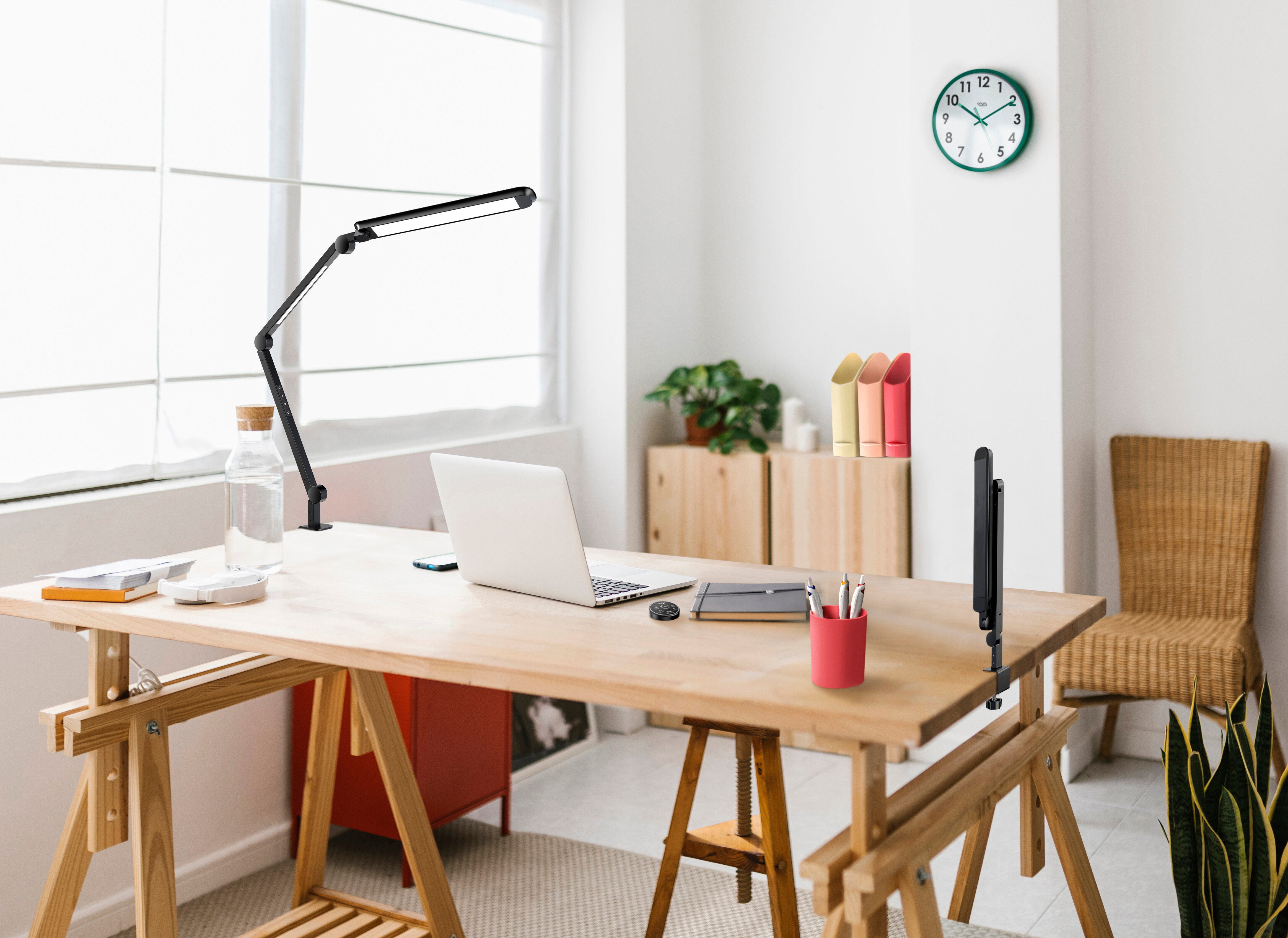 Flexible LED Tisch-Klemmleuchte mit drehbaren Modulen – perfekte Beleuchtung für jeden Arbeitsplatz. Diese moderne LED Tisch-Klemmleuchte vereint Funktionalität und Design für Ihren Homeoffice-Arbeitsplatz, das Büro oder den Schreibtisch zu Hause. Ausgestattet mit zwei unabhängig steuerbaren LED-Modulen, die sich um bis zu 270° drehen lassen, bietet sie eine individuell einstellbare Beleuchtung für jede Tätigkeit – ob Lesen, Schreiben oder Entspannen. Dank der separaten Steuerung von Helligkeit und Farbtemperatur je Modul schaffen Sie jederzeit die optimale Lichtstimmung. Die Leuchte lässt sich flexibel als Tischlampe oder mittels Klemmhalterung befestigen – ideal für kleine Arbeitsflächen oder wechselnde Einsatzorte. Die Leuchte ist komplett zusammenklappbar, wodurch sie sich platzsparend verstauen lässt und für eine aufgeräumte Schreibtischorganisation sorgt.