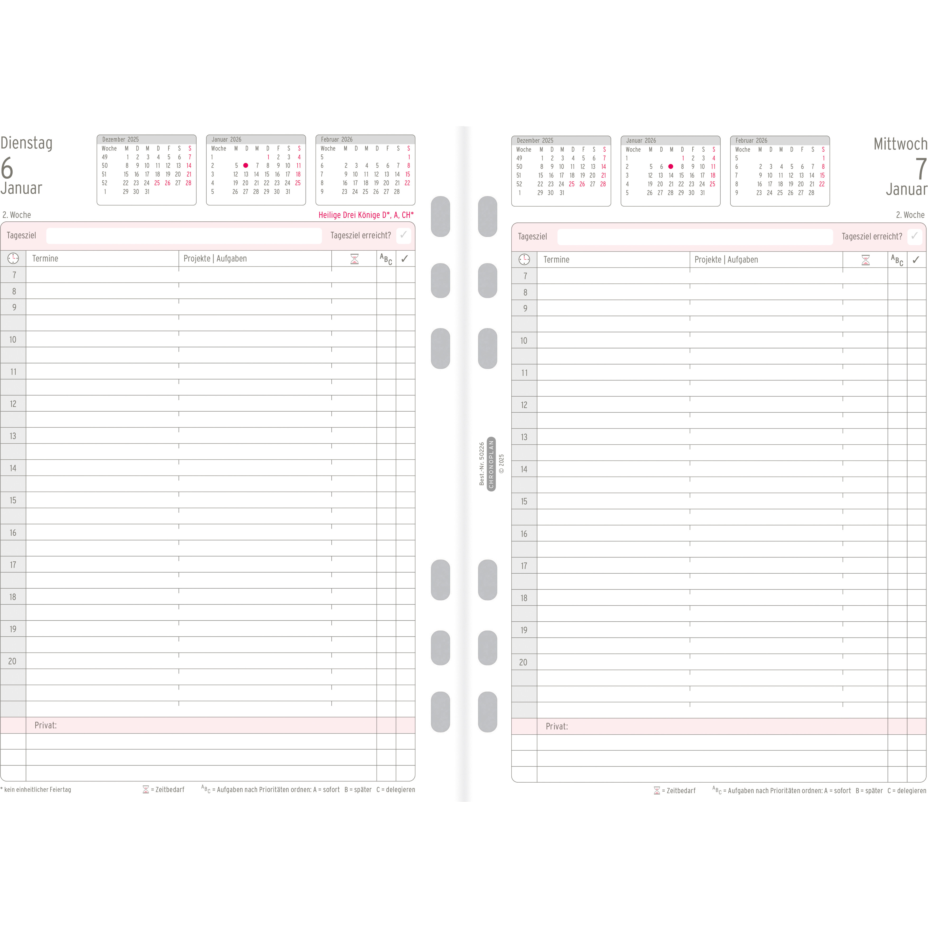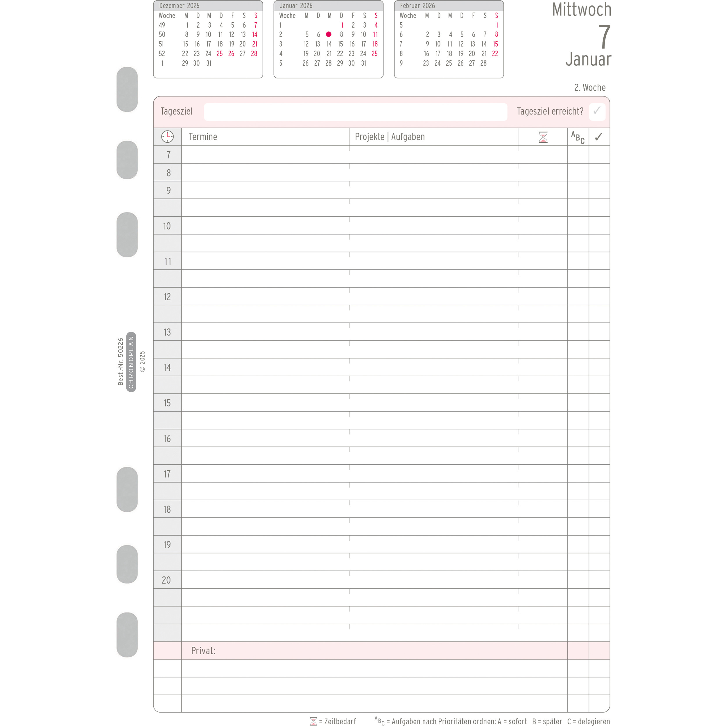 Mit dem CHRONOPLAN Tagesplan 2026 im A5 Format für Ihren Terminplaner behalten Sie die Übersicht über Ihre Termine und Aufgaben. Diese Kalendereinlage ermöglicht ein effizientes und übersichtliches Zeitmanagement mit einer Seite pro Tag. Durch den Zweifar