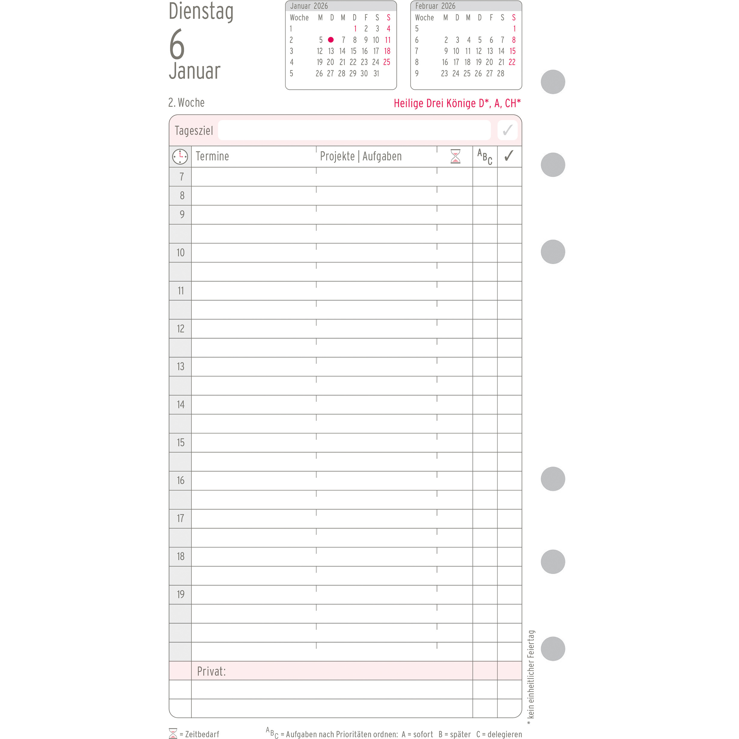 Mit dem CHRONOPLAN Tagesplan 2026 im Midi Format (96 x 172 mm) für Ihren Terminplaner behalten Sie die Übersicht über Ihre Termine und Aufgaben. Diese Kalendereinlage ermöglicht ein effizientes und übersichtliches Zeitmanagement mit einer Seite pro Tag, d