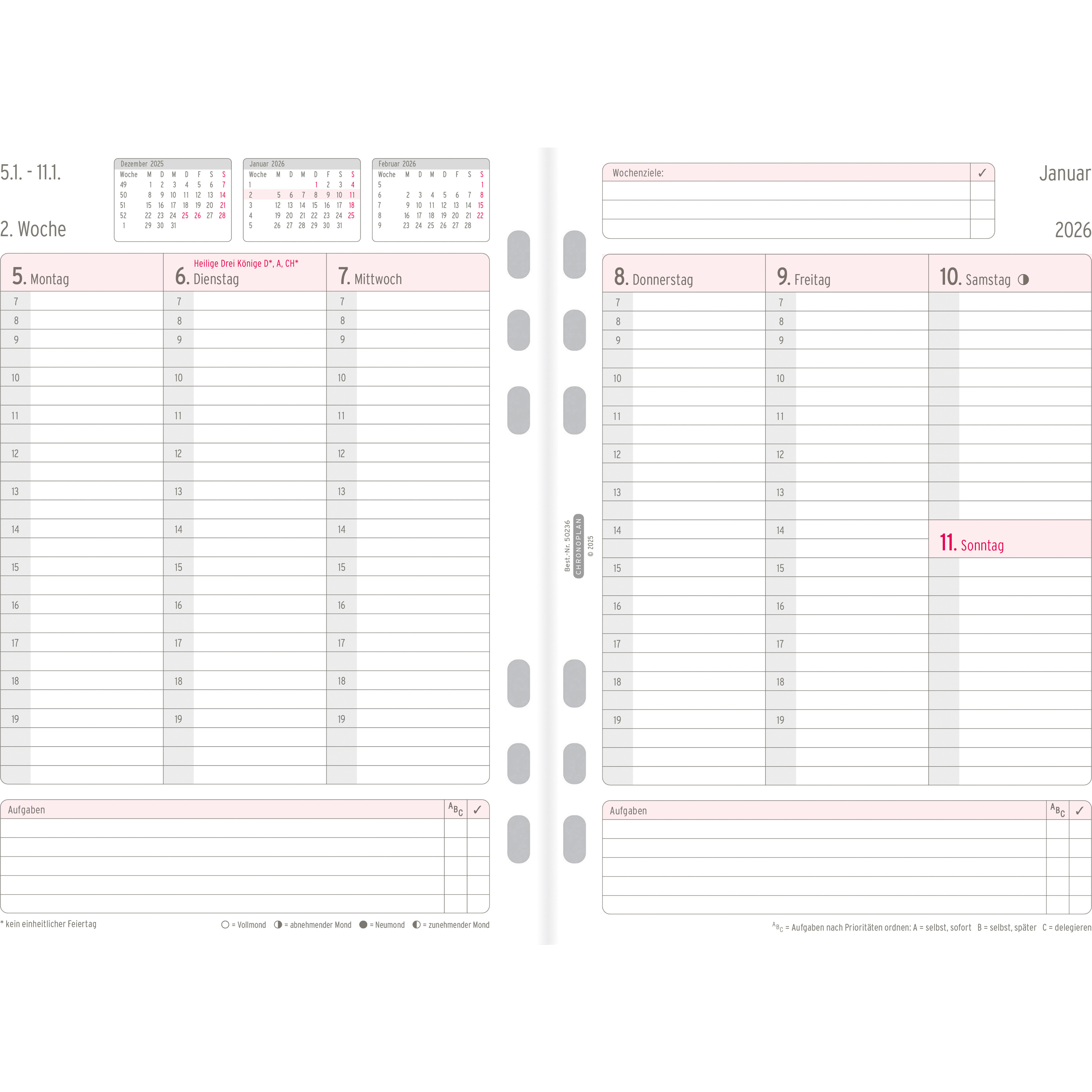 Mit dem CHRONOPLAN Wochenplan 2026 im A5 Format für Ihren Terminplaner behalten Sie die Übersicht über Ihre Termine und Aufgaben. Diese Kalendereinlage ermöglicht ein effizientes und übersichtliches Zeitmanagement mit einer Woche auf 2 Seiten. Die Tage si