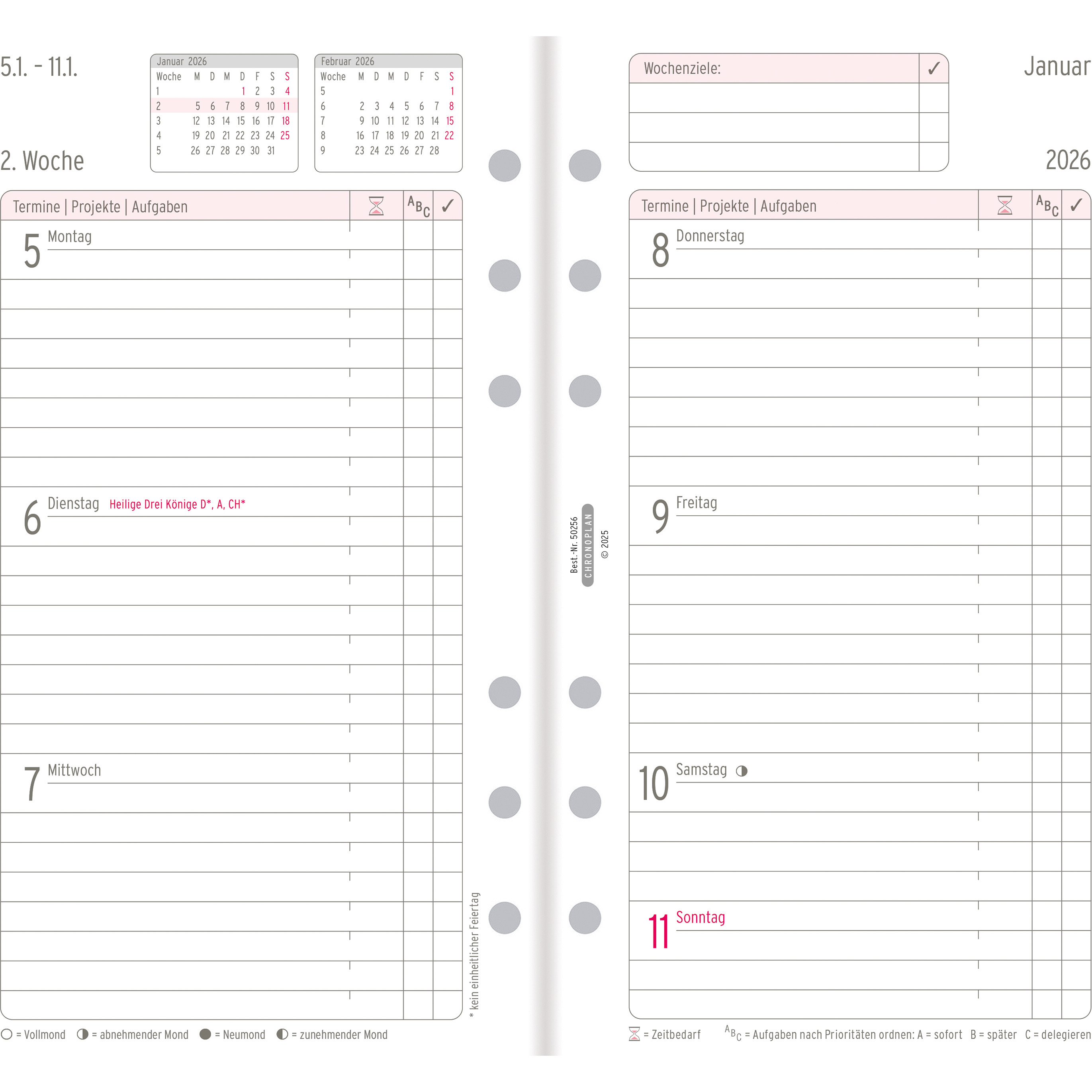 Mit dem Chronoplan Wochenplan 2026 im Midi Format (96 x 172 mm) für Ihren Terminplaner behalten Sie die Übersicht über Ihre Termine und Aufgaben. Diese Kalendereinlage ermöglicht ein effizientes und übersichtliches Zeitmanagement mit einer Woche auf 2 Sei