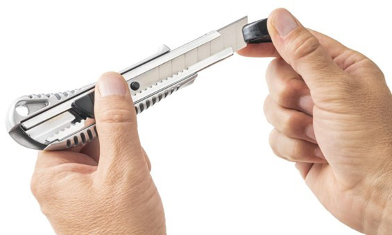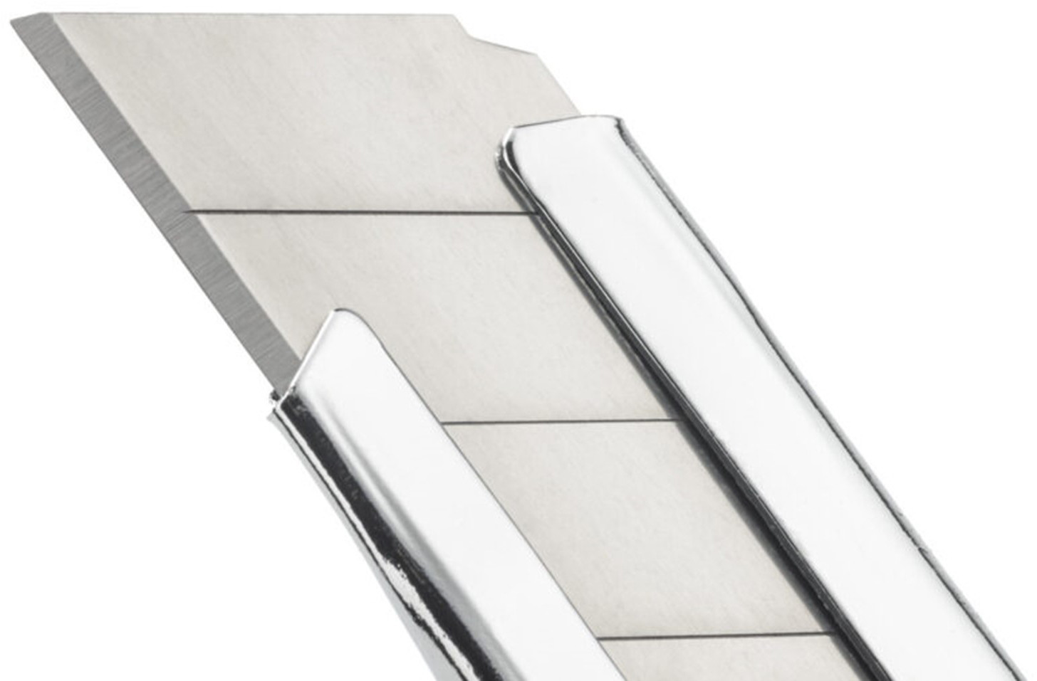 Profi Cuttermesser mit Metallgehäuse und 18 mm Klinge. Formschöne Cutter für saubere Schnittflächen und glatte Kanten. Das vielseitige Werkzeug für den Profi. Die Standard-Abbrechklinge, aus rostfreiem Stahl, kann mittels Rasterautomatik vorgeschoben werden. Die Metallführung der Schneidklinge sorgt für Sicherheit im Handling und garantiert einen exakten Schnitt. Eine Abbrechhilfe ist im Verschlussteil der hinteren Messerzuführung integriert. Ergonomisch geformter Griff aus Metall mit Rippenstruktur für sicheren Halt. Lieferung mit eingesetzter Klinge auf SB-Karte