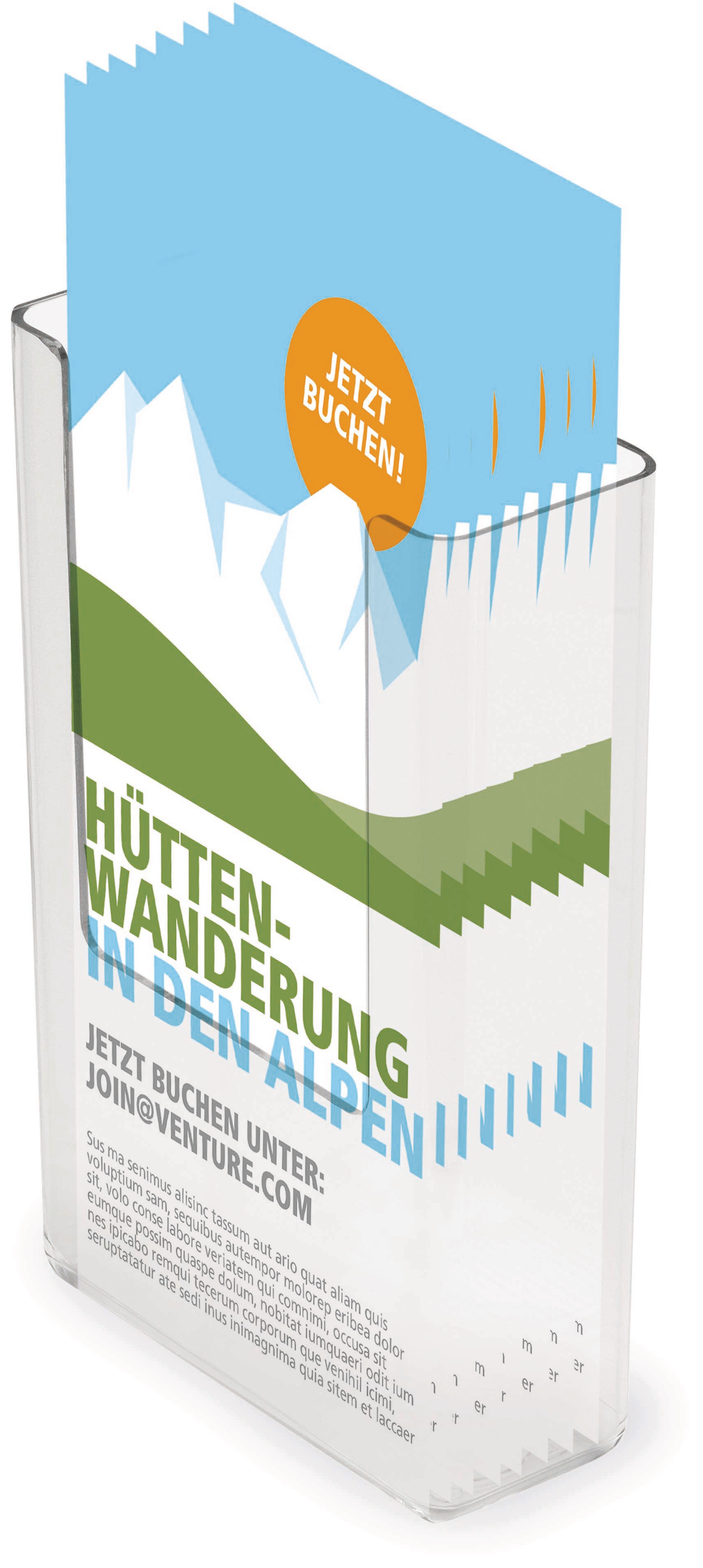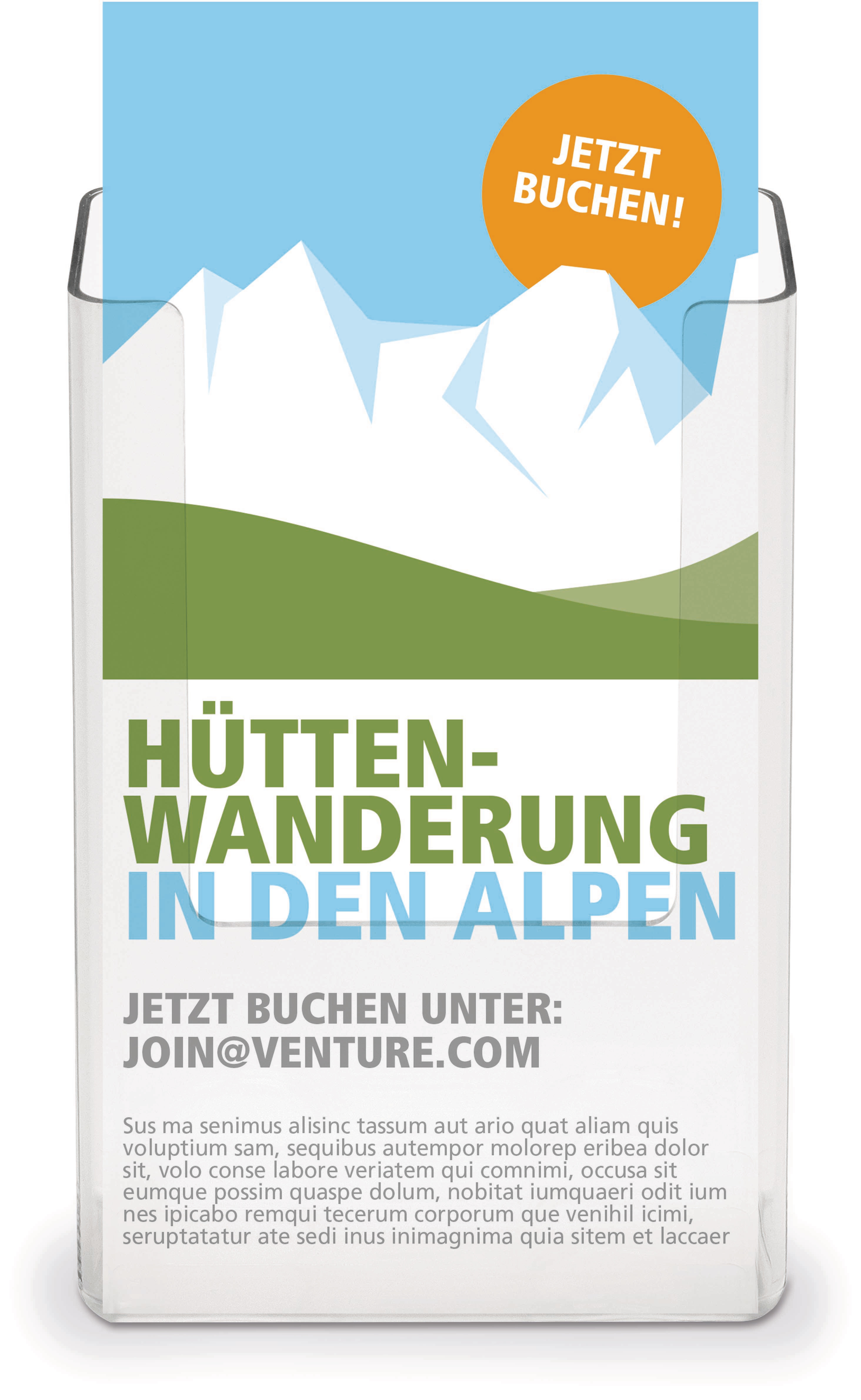 Freistehender Tischständer mit flacher Rückseite. So haben Sie Prospekte und Kataloge glasklar im Blickfeld. Wandmontage ebenfalls möglich. Material: Polystyrol. Grösse: DIN lang, Hochformat, 115 x 180 x 48 mm (B x H x T).