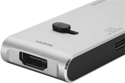 USB-C-Dockingstation, die speziell für die nahtlose Zusammenarbeit mit MacBook Pros entwickelt wurde, aber auch mit anderen Laptops funktioniert. Auf der einen Seite befinden sich zwei USB-C-Stecker, die über einen Schieber an der Oberseite der Dockingstation herausgezogen werden. Diese werden an Ihr MacBook Pro angeschlossen und geben Ihrem MacBook Pro einen HDMI-Anschluss, der 3840x2160 verarbeiten kann, zwei USB-A 3.0-Anschlüsse und zwei USB-C-Anschlüsse.
