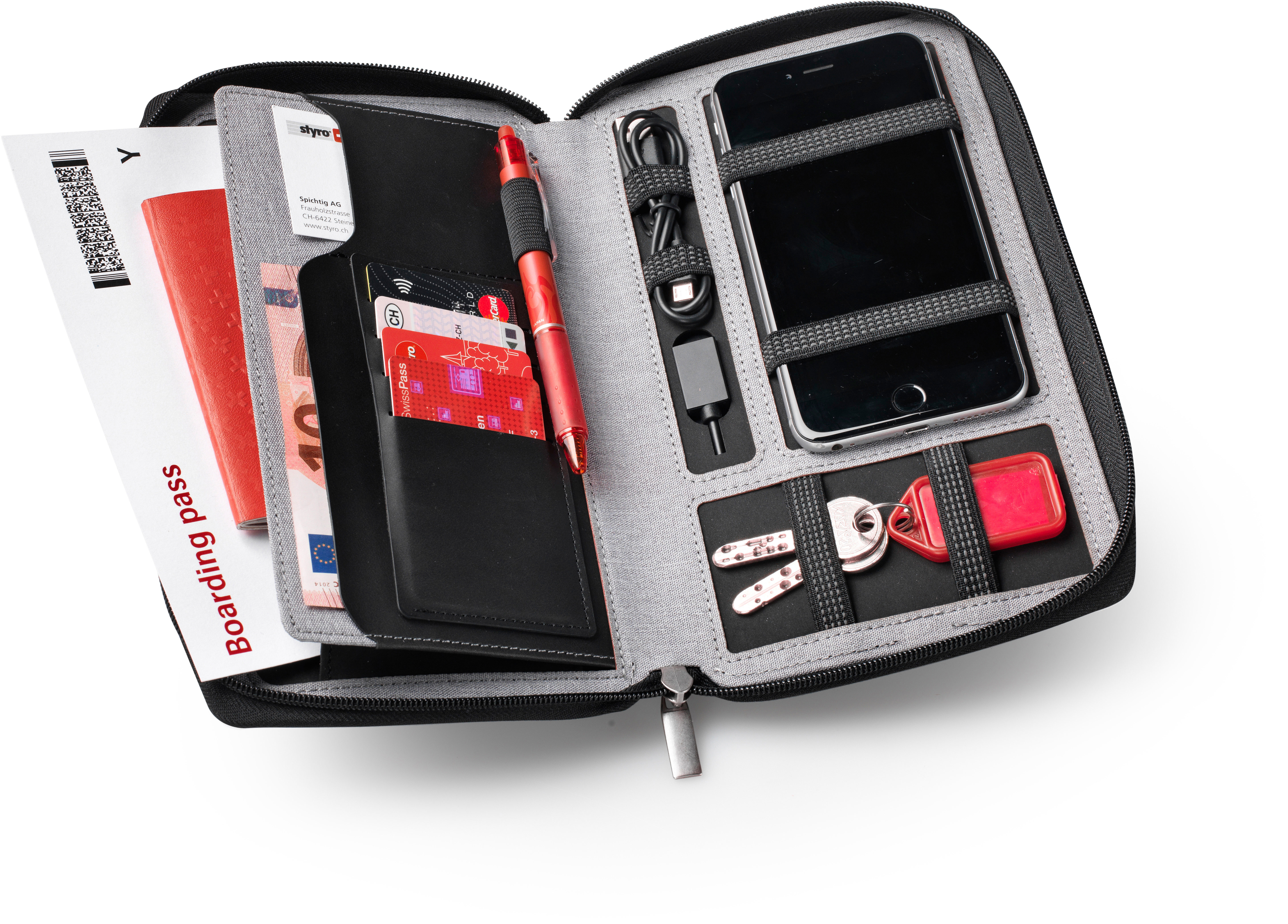 Die praktische Reisemappe "Smart Organizer" ist dank der Powerbank (4000 mAh) und dem mitgelieferten Micro-USB-Kabel der ideale Reisebegleiter für unterwegs. Die Reisemappe verfügt über diverse Fächer für Smartphone (bis Grösse 6"), Unterlagen und Kreditkarten. Zudem können USB-Sticks, Ladekabel und vieles mehr, sauber und übersichtlich verstaut werden. Aus strapazierfähigem, wasserabweisendem Textilmaterial gefertigt, mit umlaufendem Reissverschluss und abnehmbare Handschlaufe.