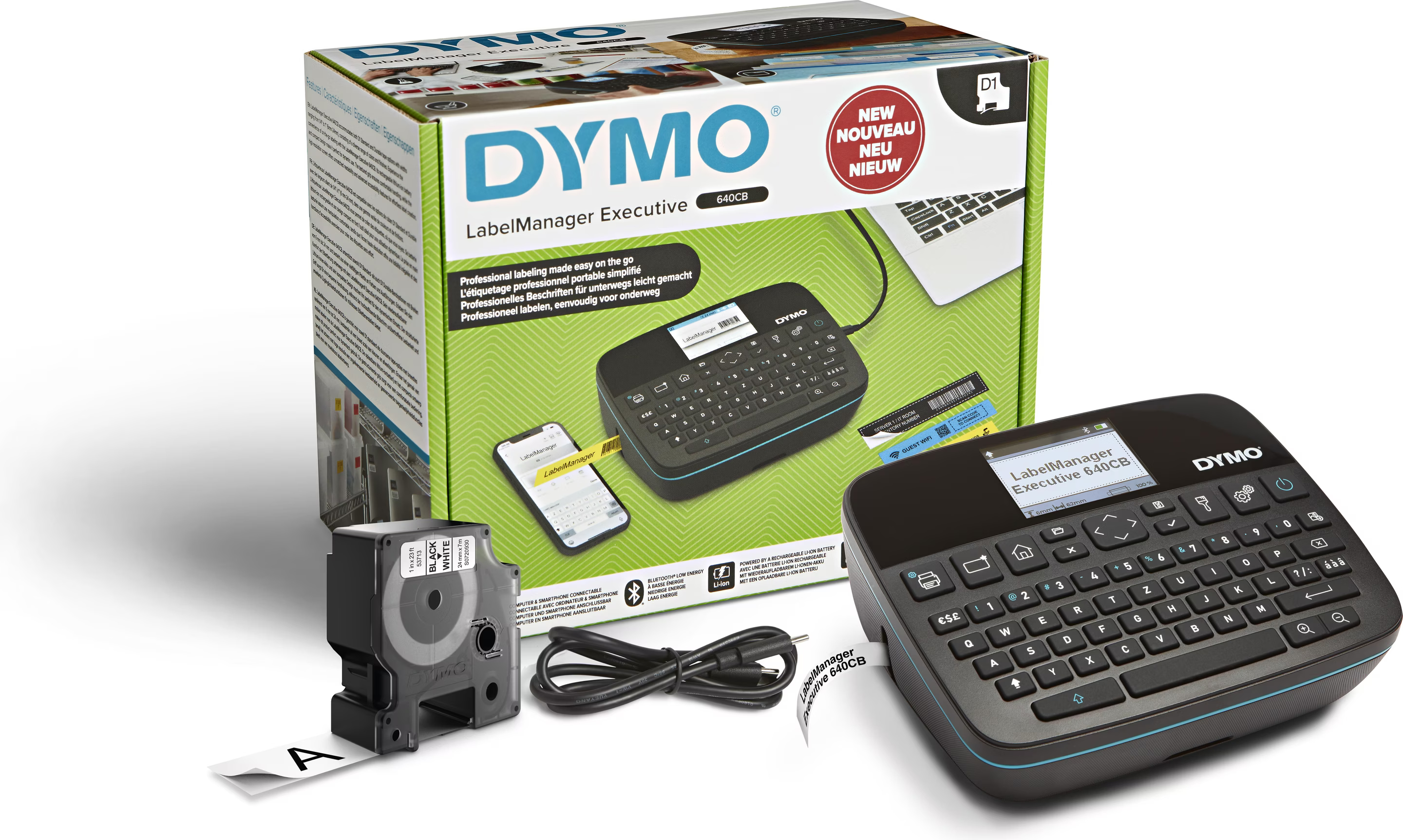 Der LabelManager™ Executive 640 CB eignet sich sowohl für D1-Standard- als auch für Hochleistungs-Schriftbänder mit Breiten von 6 mm bis 24 mm, die in verschiedenen Farben und Ausführungen erhältlich sind. Erleben Sie unterwegs den Komfort der Beschriftung mit dem LabelManager™ Executive 640 CB. Der wiederaufladbare Lithium-Ionen-Akku und das kompakte Design des für mobile Profis konzipierten Geräts ermöglichen die mühelose Erstellung von Etiketten, wo immer Sie auch sind. Der strukturierte Griff bietet auch bei längerem Gebrauch Komfort und spiegelt unser Engagement für hervorragende Ergonomie wider. Mit seinem hochauflösenden Bildschirm für unübertroffene Lesbarkeit und einer intuitiven und übersichtlichen Menüführung setzt der LabelManager™ Executive 640 CB einen neuen Standard für die Erstellung und Anpassung von Etiketten. Darüber hinaus ermöglicht die benutzerfreundliche Bedienung des LabelManager™ Executive 640 CB und die dualen Verbindungsoptionen, wie Bluetooth® Low Energy-Technologie und USB-C, das Speichern von praktisch unbegrenzten* personalisierten Etiketten über die mobilen und Desktop-Softwareanwendungen von DYMO®, wodurch ein optimierter Arbeitsablauf gefördert wird und die Notwendigkeit entfällt, das Gerät zu verbinden. Egal, ob Sie an Ihrem Arbeitsplatz organisieren oder im Einsatz sind, der LabelManager™ Executive 640 CB ermöglicht Ihnen eine unvergleichliche Effizienz und Präzision bei Beschriftungsaufgaben.