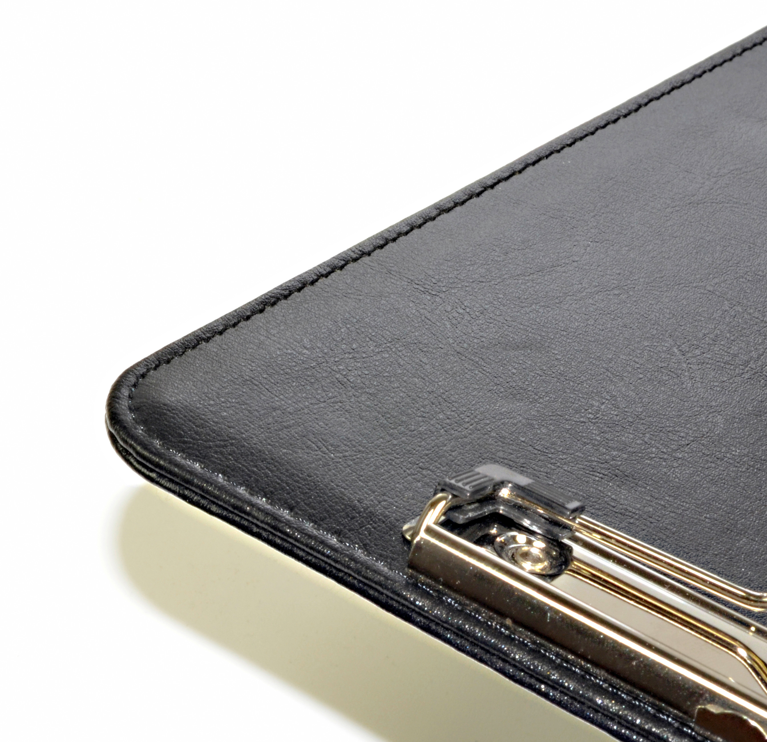 Schreibplatten aus Kunstleder für Schriftgut DIN A4 + DIN A5, solider Kern für ein angenehmes Schreibgefühl, softe Oberfläche mit rundum gesteppter Ziernaht, mit rutschfester, gummierter Stahl-Klemmschiene an kurzer Seite, zusätzliche Aufhängemöglichkeit, einzeln in Folie verpackt