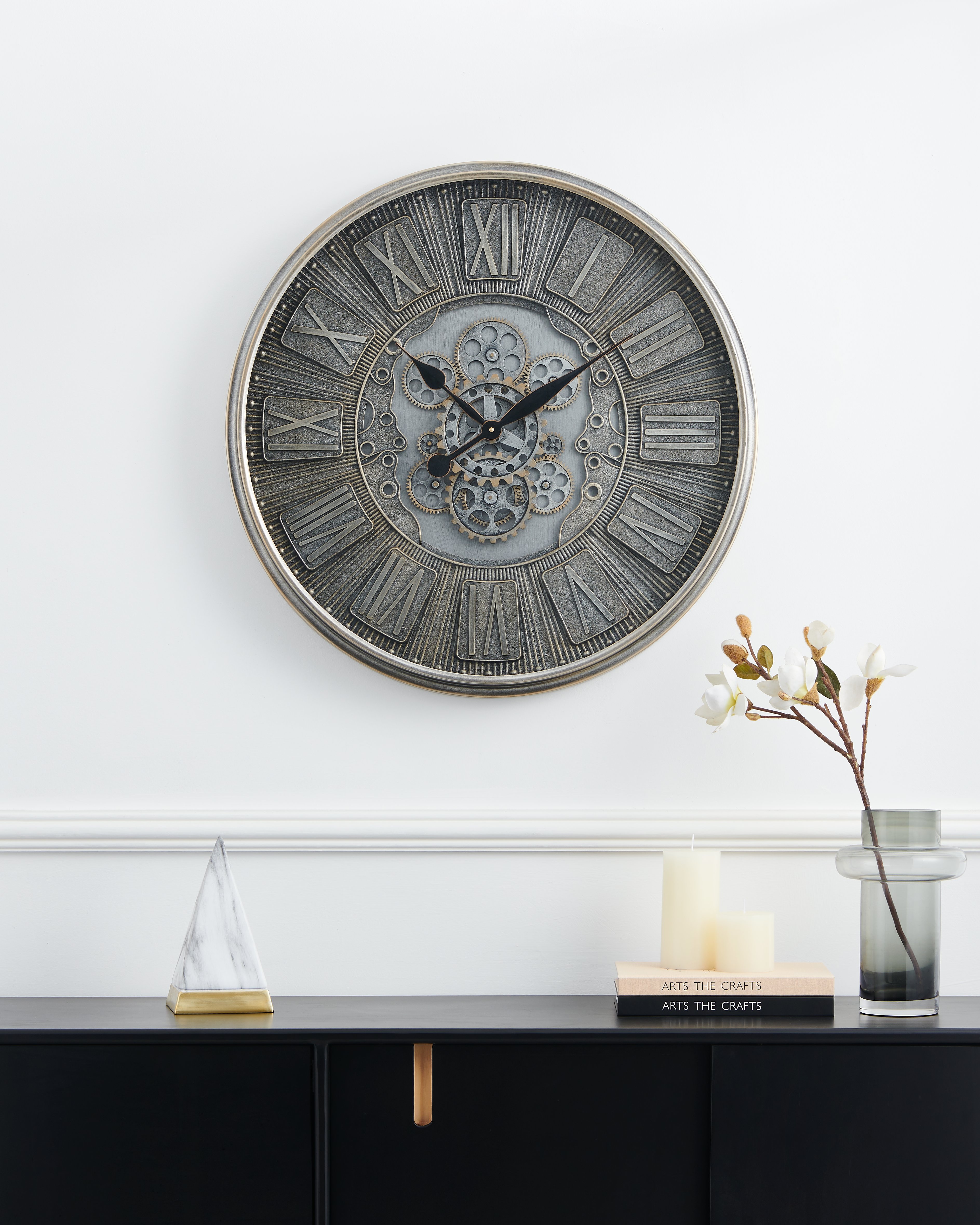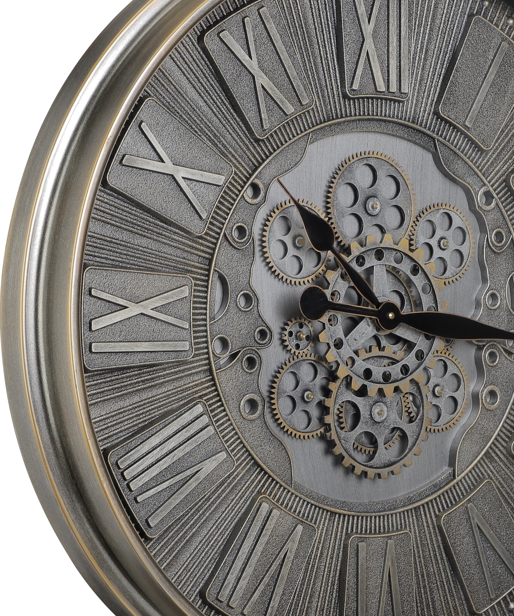 Behalte mit der KENEMA Wanduhr immer die Zeit im Blick. Mit ihrem Industrial und eleganten Design schmückt dieses Deko-Accessoire deine Wand im Wohn-Essbereich, Schlafzimmer oder Office. Die mechanisch-geformte Uhr in silber/grau mit Gold aktzenten, fügt sich mit ihrem hochwertigen Materialien und den schwarzen Zeigern bestens in jede Einrichtung ein. Die Wanduhr wird exklusive Batterien geliefert. Mit dem Einstellrad auf der Rückseite kannst du bequem die Zeit einstellen. Das Bewegen der Zeiger von Hand kann das Uhrwerk beschädigen.