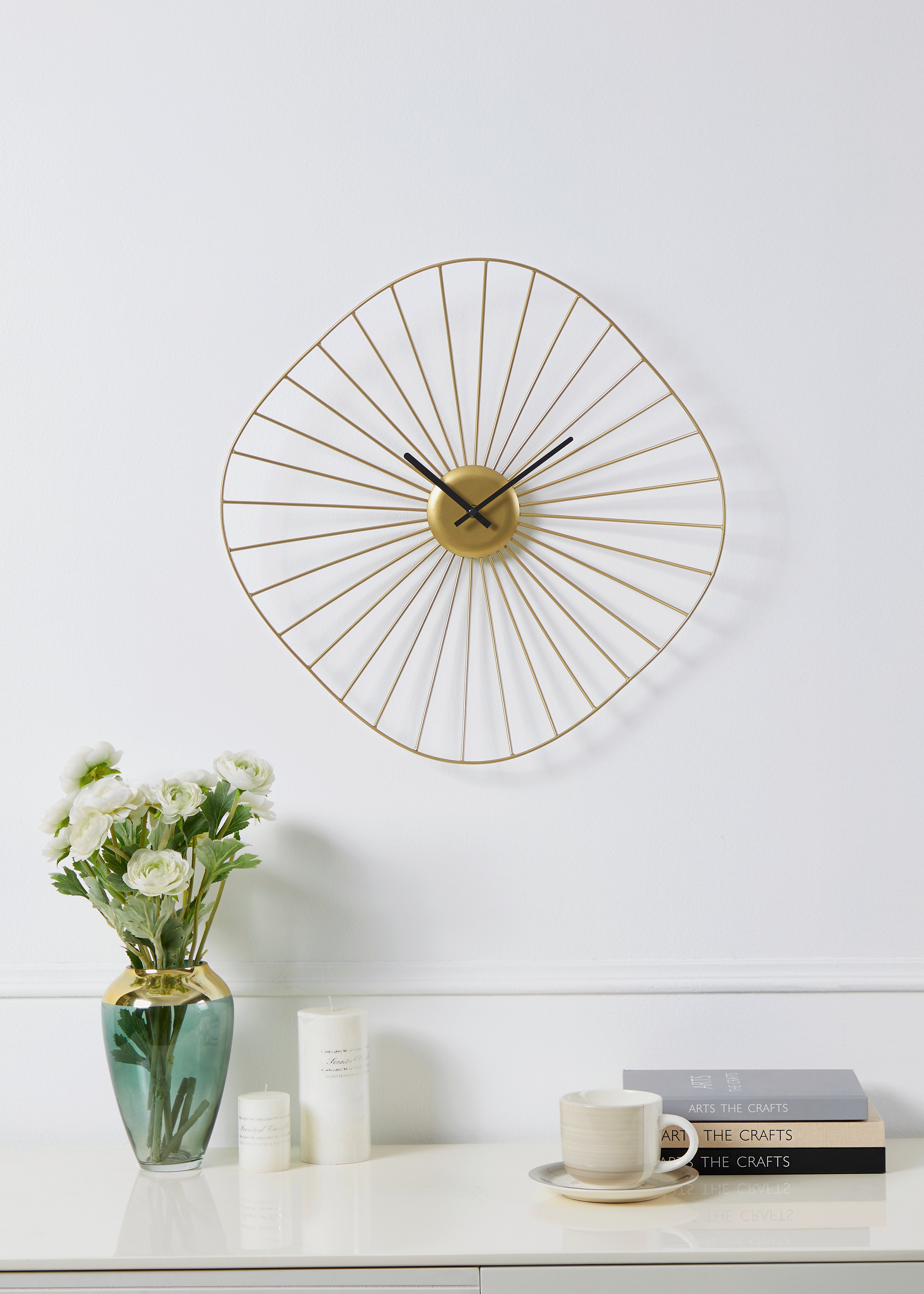 Behalte mit der MATSUMOTO Wanduhr immer die Zeit im Blick. Mit ihrem minimalistischen und eleganten Design schmückt dieses Deko-Accessoire deine Wand im Wohn-Essbereich, Schlafzimmer oder Office. Die organisch geformte Uhr in Messingfarben fügt sich mit ihrem hochwertigen Drahtgestell und den schwarzen Zeigern bestens in jede Einrichtung ein. Die Wanduhr wird exklusive Batterien geliefert. Mit dem Einstellrad auf der Rückseite kannst du bequem die Zeit einstellen. Das Bewegen der Zeiger von Hand kann das Uhrwerk beschädigen.