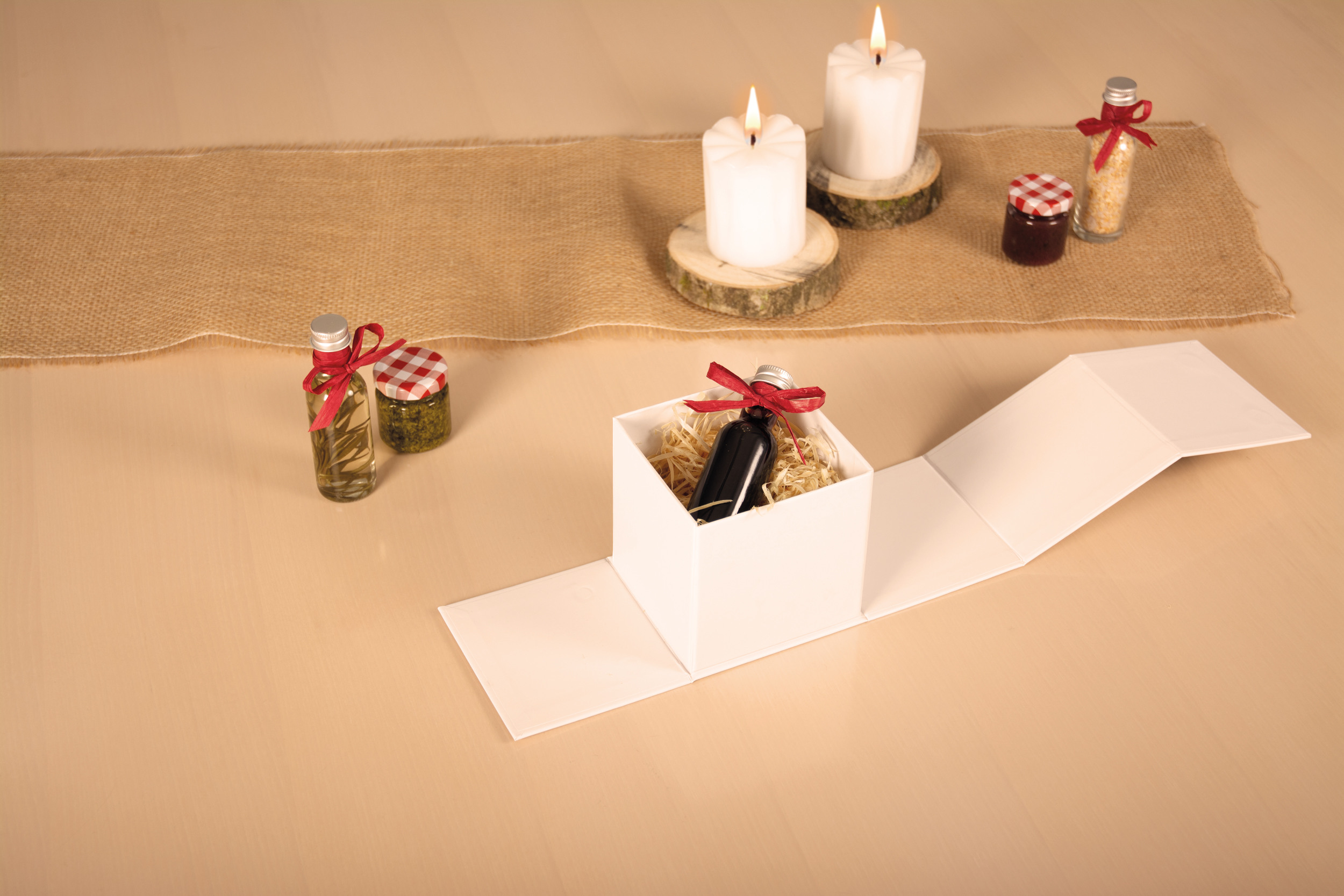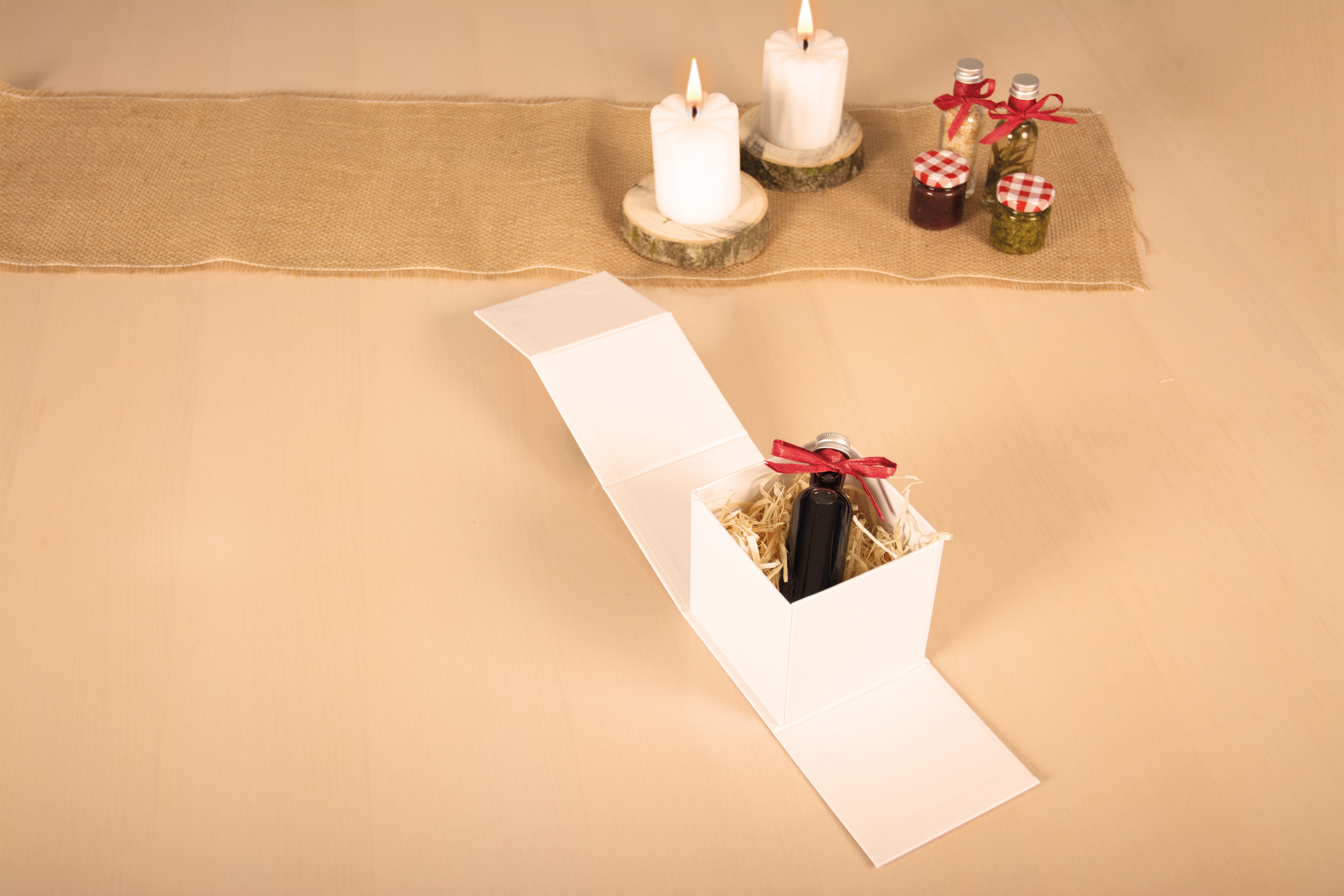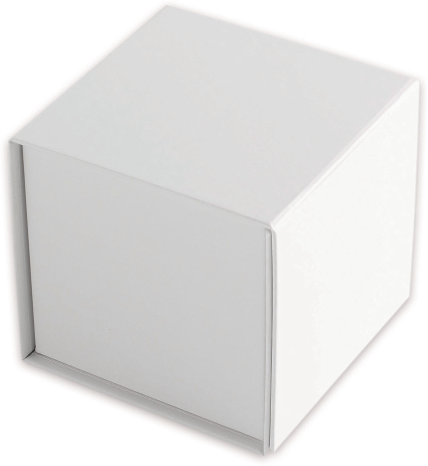 Hochwertige Geschenkbox aus Karton (1200 g/m²) mit weissem Papier (140 g/m²) beschichtet. Mit Magnetverschluss. Flach angeliefert und dank Haftklebestreifen einfach aufzustellen.