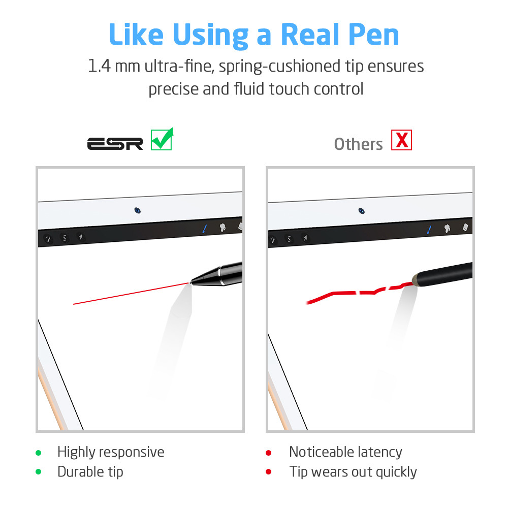 Die ultrafeine 1,4-mm-Stiftspitze ermöglicht eine präzise und flüssige Berührungssteuerung. Schreiben und Zeichnen auf einem Touchscreen fühlt sich an, als würde man einen Stift auf Papier setzen