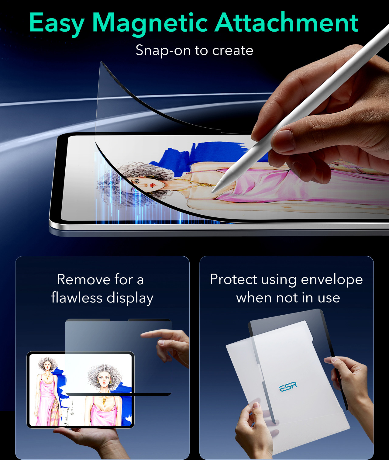 Praktische Magnetbefestigung: die magnetischen Ränder ermöglichen eine einfache Befestigung auf dem iPad-Bildschirm, wenn es Zeit ist, etwas zu erstellen, und ein schnelles Entfernen für eine makellose Sicht auf das Originaldisplay, während die Schutzhülle die Displayschutzfolie unterwegs sicher aufbewahrt.