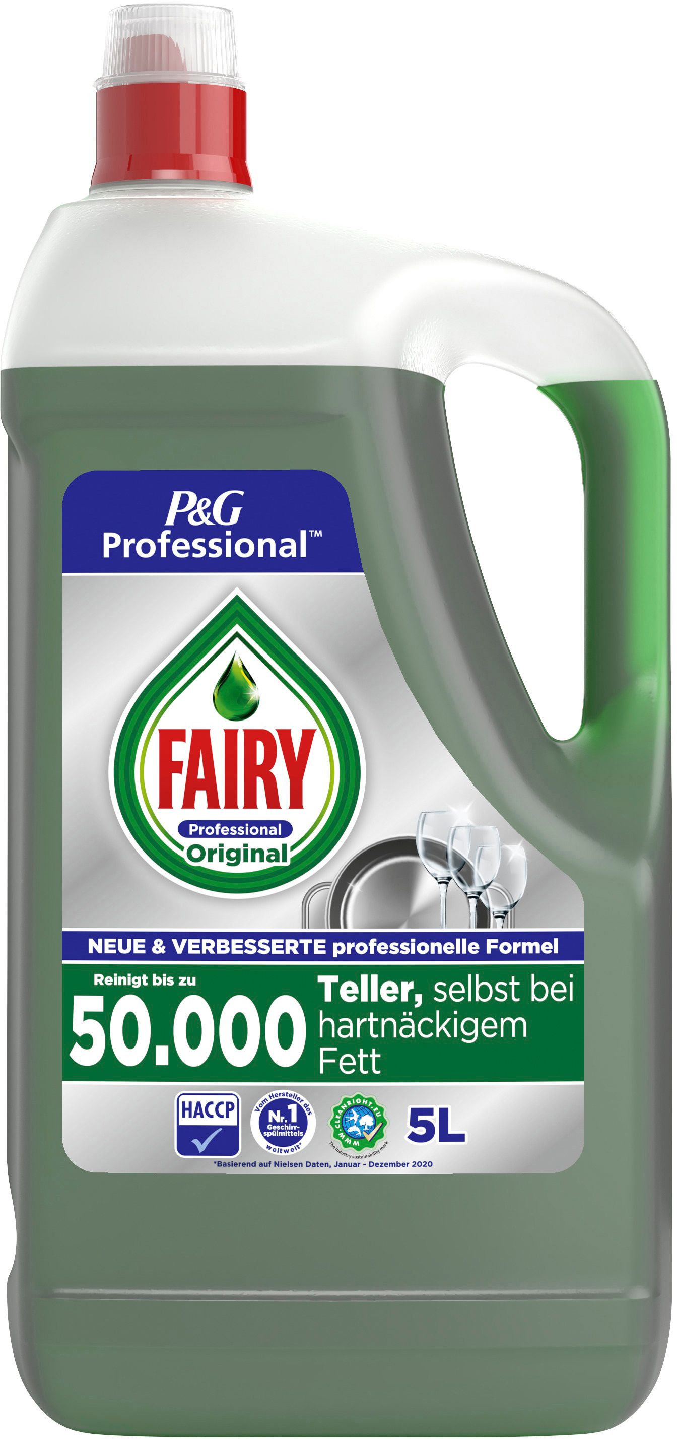 Professional FAIRY Original Handspülmittel, 5 Liter HACCP-konform, für Profiküchen, für bis zu 50.000 Teller, Effektive Entfettung, auch bei eingebranntem Fett und in kaltem Wasser, ultra-glanz konzentrierte Formel, recycelbare Flasche ohne Verschluss.