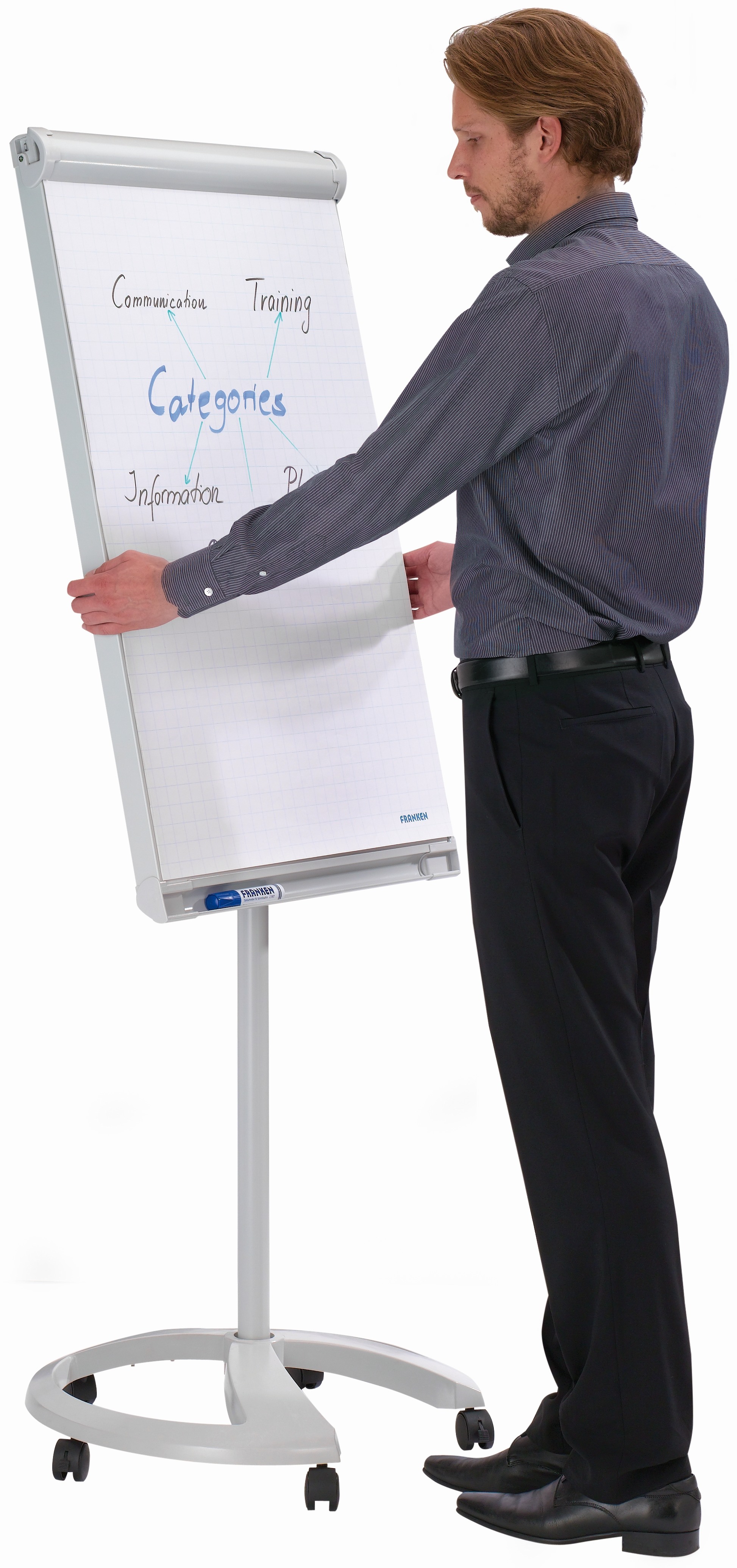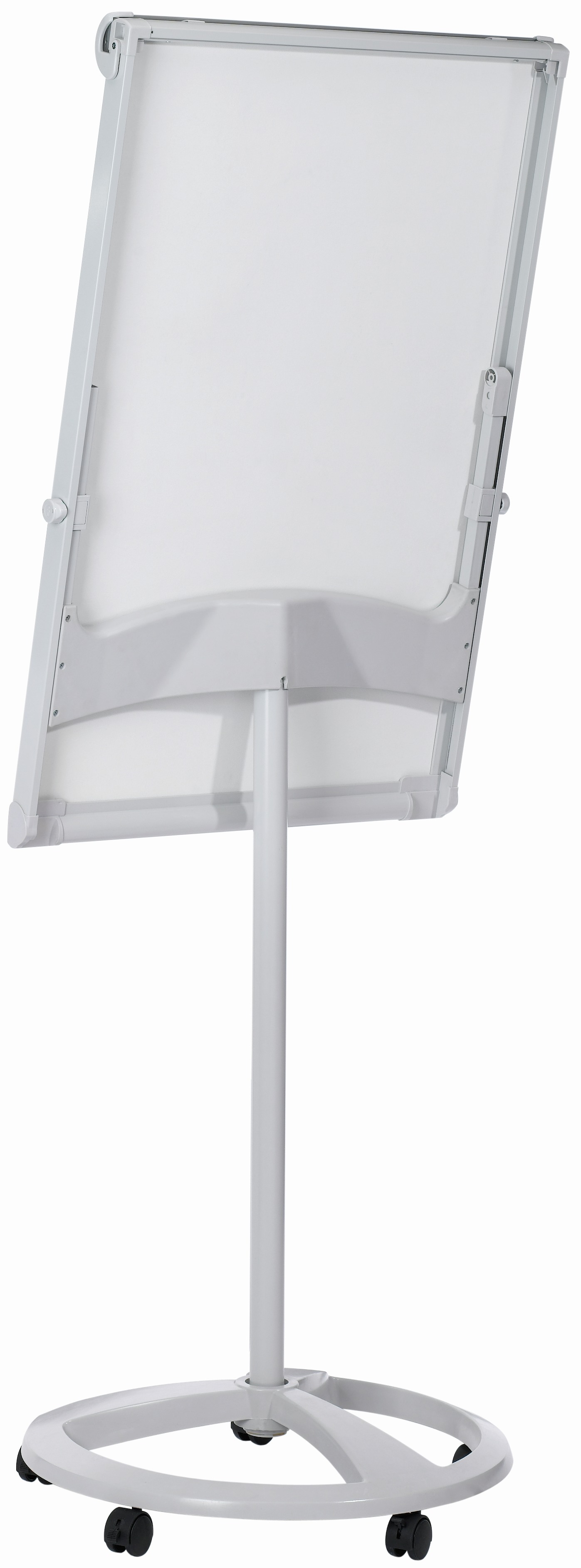 Mobiler Flipchart aus Metall/Kunststoff • Kunststoff-Rundfuss mit 5 Rollen • Schreibfläche 67 x 95 cm • Tafel beschreibbar und magnethaftend • Neigungswinkel 15° • 2 Seitenarme, 57.5 cm • mit Ablageschale • ohne Block