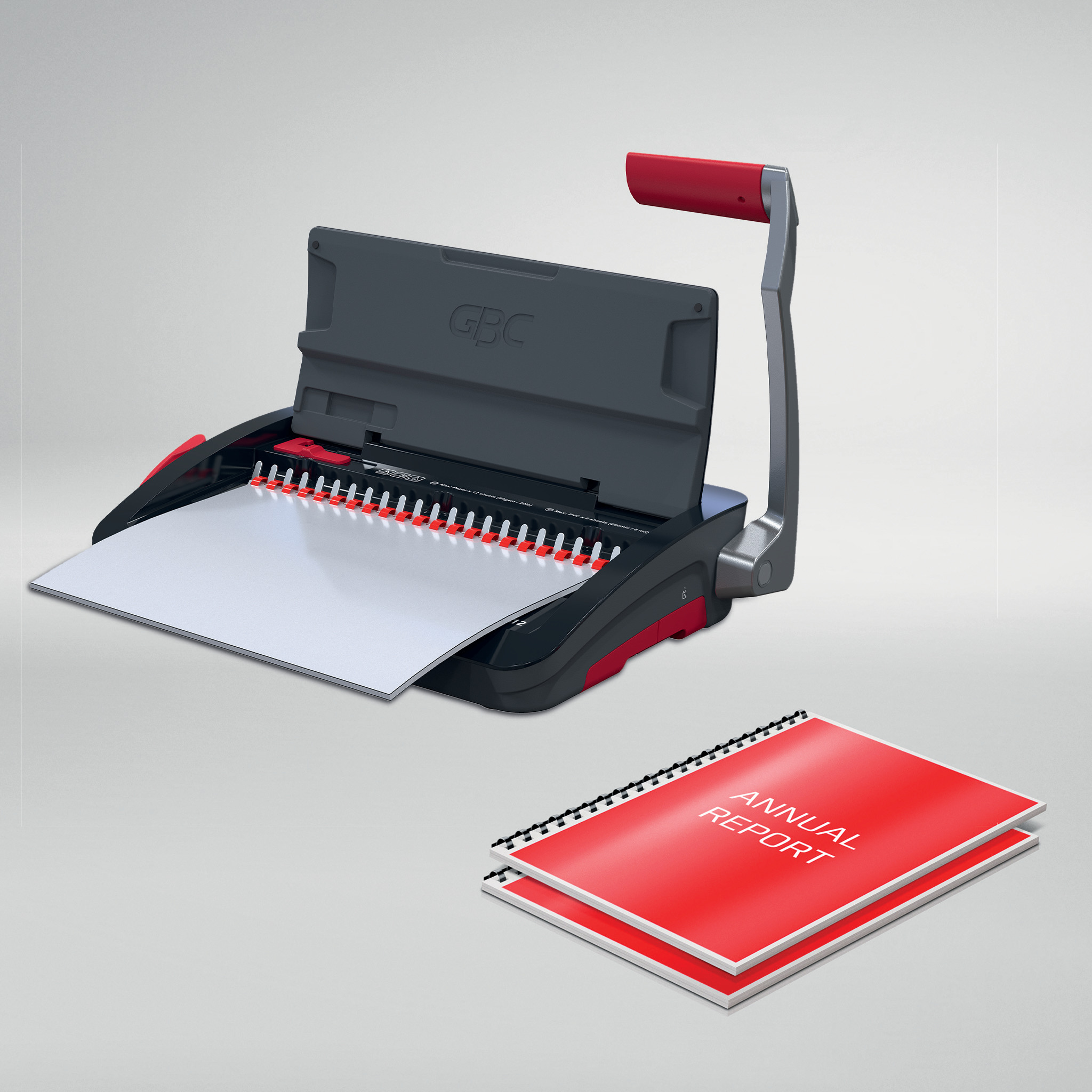 Das CombBind® CB12 ist eine zuverlässiges und kompaktes manuelles Bindegerät, perfekt für den persönlichen Gebrauch oder den Einsatz in kleinen Büros mit geringem Volumenbedarf. Es stanzt mühelos bis zu 12 Blatt 80-g/m²-Papier und kann bei Verwendung von 19-mm-Plastikbinderücken bis zu 165 Blätter gleichzeitig binden. Sein leichtes, platzsparendes Design gewährleistet, den flexiblen Einsatz. Kann bei Nichtgebrauch problemlos verstaut werden. Für zusätzlichen Komfort verfügt es über eine Auffangschale für die einfache Entsorgung des Schnittguts und ein praktisches Aufbewahrungsfach. Verbessern Sie Ihr Dokumentenmanagement mit dem GBC CB12 – hier trifft Funktionalität auf Stil. Mit einem GBC CombBind 12 lassen sich eine Vielzahl von Dokumenten professionell erstellen, darunter Berichte, Präsentationen, Handbücher, Abschlussarbeiten, Notizbücher, Fotobücher, Rezeptbücher und Kalender. Dieses Gerät ist auch ideal für die hochwertige Erstellung von Geschäftsdokumente, Schulungshandbücher, technischen Dokumentationen und kreativen Projekten geeignet. Farbe: Schwarz, Rot und Silber. Verwenden Sie GBC Originalzubehör für ein optimales Ergebnis: GBC CombBind™ Plastikbinderücken A4 12 mm, 100 Stück (Art. Nr. 4028177), GBC LeatherGrain™ Rückkarton Schwarz A4 250 g/m², 100 Stück (Art. Nr. CE040010), & GBC HiClear™ glasklares Deckblatt A4 200 Mikron, 100 Stück (Art. Nr. CE012080E)