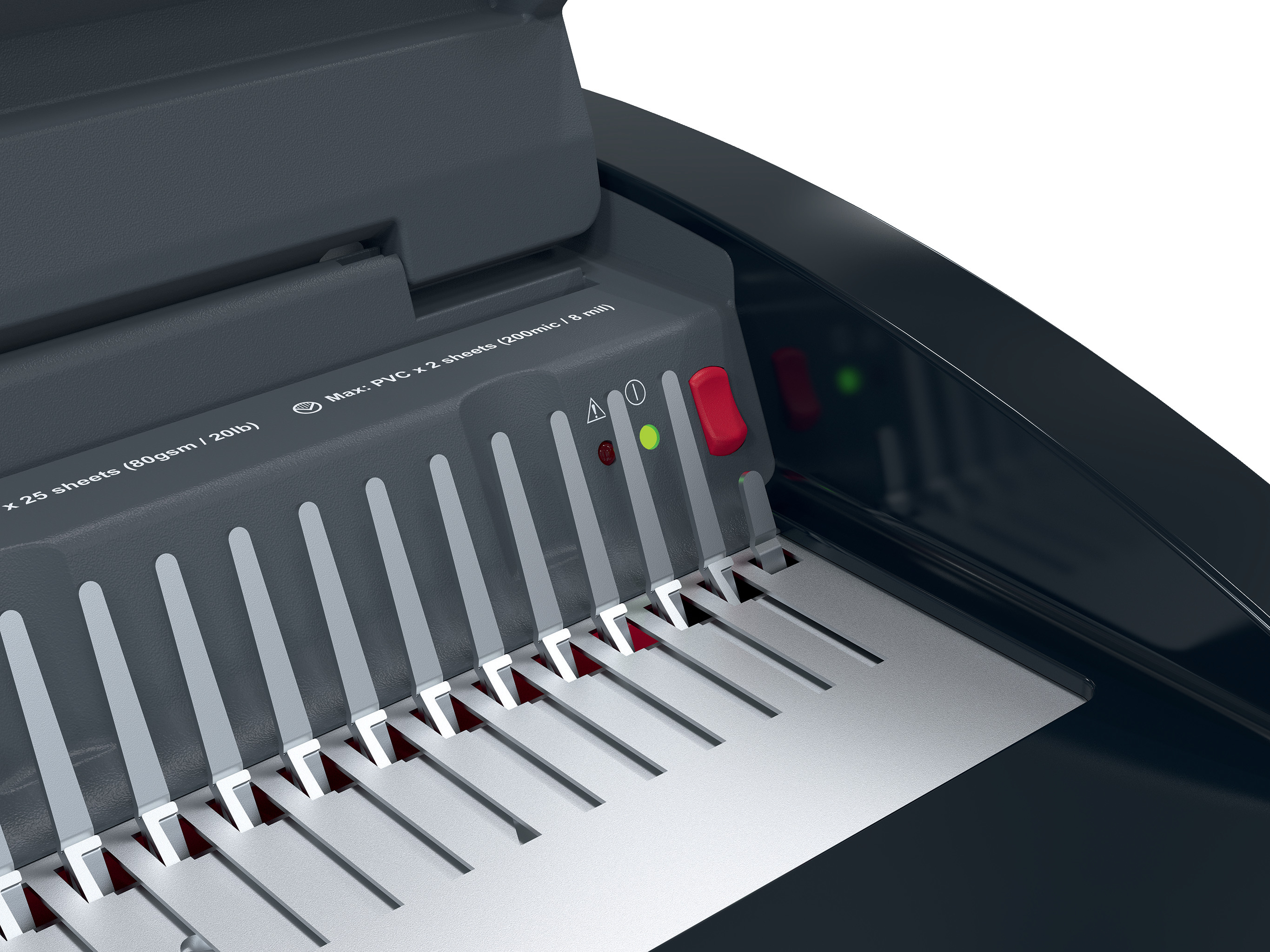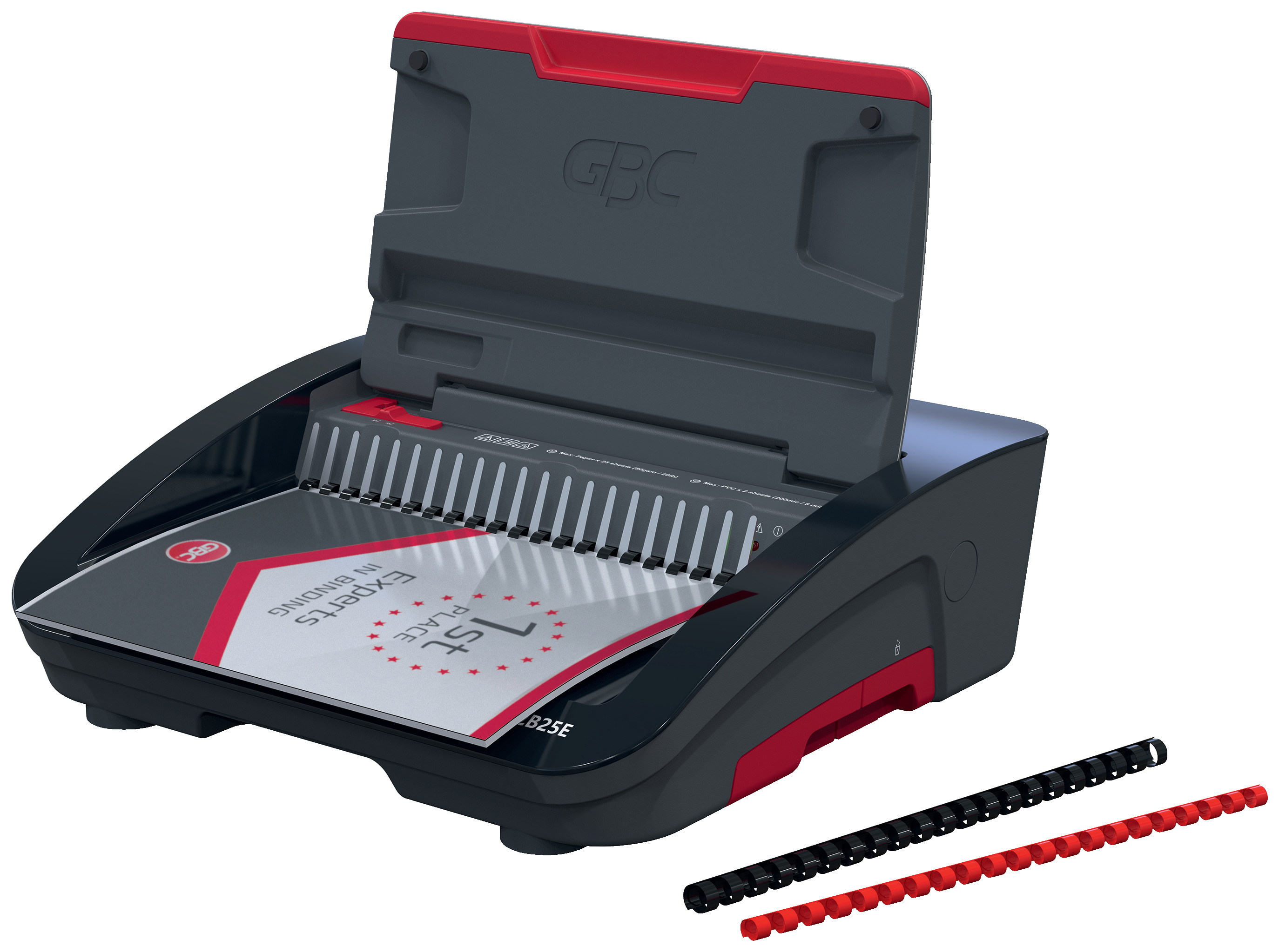 Steigern Sie Ihre Büroeffizienz mit dem CombBind® CB25E, dem ultimativen elektrischen Plastikbindegerät, welches für anspruchsvolle Umgebungen wie geschäftige Büros und Bildungseinrichtungen entwickelt wurde. Diese robuste Maschine vereinfacht den Bindevorgang, indem sie mühelos Stapel von bis zu 25 Blatt 80-g/m²-Papier locht und bis zu 390 Blätter gleichzeitig mit 45-mm-Binden sicher bindet. Sein schlankes, leichtes Design gewährleistet einen einfachen Transport und eine einfache Lagerung und macht ihn zur perfekten Ergänzung für jeden Arbeitsplatz. Das CB25E ist auf Benutzerfreundlichkeit ausgelegt und verfügt über eine LED-Anzeige gegen Papierstau und Überlastung, damit das Binden jedes Mal reibungslos und ohne Unterbrechungen abläuft. Darüber hinaus verfügt es über eine praktische Schnittgutablage und ein Ablagefach für einen aufgeräumten Arbeitsplatz. Verbessern Sie Ihr Dokumentenmanagement mit dem GBC CB25E – hier trifft Funktionalität auf Stil. Mit einem GBC CombBind 2E5 lassen sich eine Vielzahl von Dokumenten professionell erstellen, darunter Berichte, Präsentationen, Handbücher, Abschlussarbeiten, Notizbücher, Fotobücher, Rezeptbücher und Kalender. Dieses Gerät ist auch ideal für die hochwertige Erstellung von Geschäftsdokumente, Schulungshandbücher, technischen Dokumentationen und kreativen Projekten geeignet. Farbe: Schwarz, Rot und Silber. Verwenden Sie GBC Originalzubehör für ein optimales Ergebnis: GBC CombBind™ Plastikbinderücken A4 12 mm, 100 Stück (Art. Nr. 4028177), GBC LeatherGrain™ Rückkarton Schwarz A4 250 g/m², 100 Stück (Art. Nr. CE040010), & GBC HiClear™ glasklares Deckblatt A4 200 Mikron, 100 Stück (Art. Nr. CE012080E)