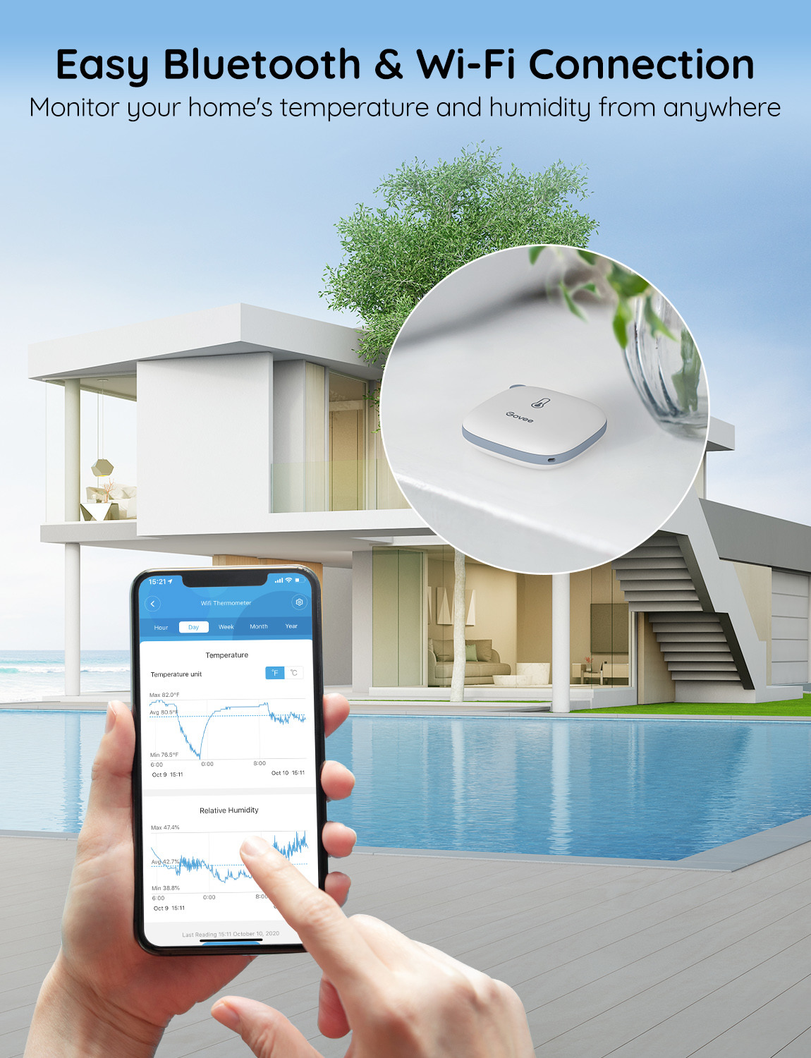 Überwachen Sie die Temperatur und Luftfeuchtigkeit in Ihren Pflanzenterrarien, Brutkästen, Weinkellern oder im Schlafzimmer mit diesem intelligenten Thermo-Hygrometer. Sorgen Sie für ein gesundes und komfortables Lebensumfeld für Sie und die Ihren - kleines, tragbares DesignHochpräziser Sensor: Die Temperaturgenauigkeit liegt bei ±0.3, die Luftfeuchtigkeit bei ±3%RH. Durch die Aktualisierung alle 2 Sekunden, werden Sie immer auf dem neuesten Stand bleiben.Sofortige Benachrichtigungen: Legen Sie voreingestellte Temperatur- und Luftfeuchtigkeitsbereiche fest und erhalten Sie eine sofortige App-Benachrichtigung, wenn die Werte ausserhalb des Bereichs liegen.2-Jahres-Datenexport und Speicherung: Geniessen Sie eine 20-tägige Online-Datenspeicherung und exportieren Sie Daten aus bis zu 2 Jahren mit klaren historischen Trends und Diagrammen