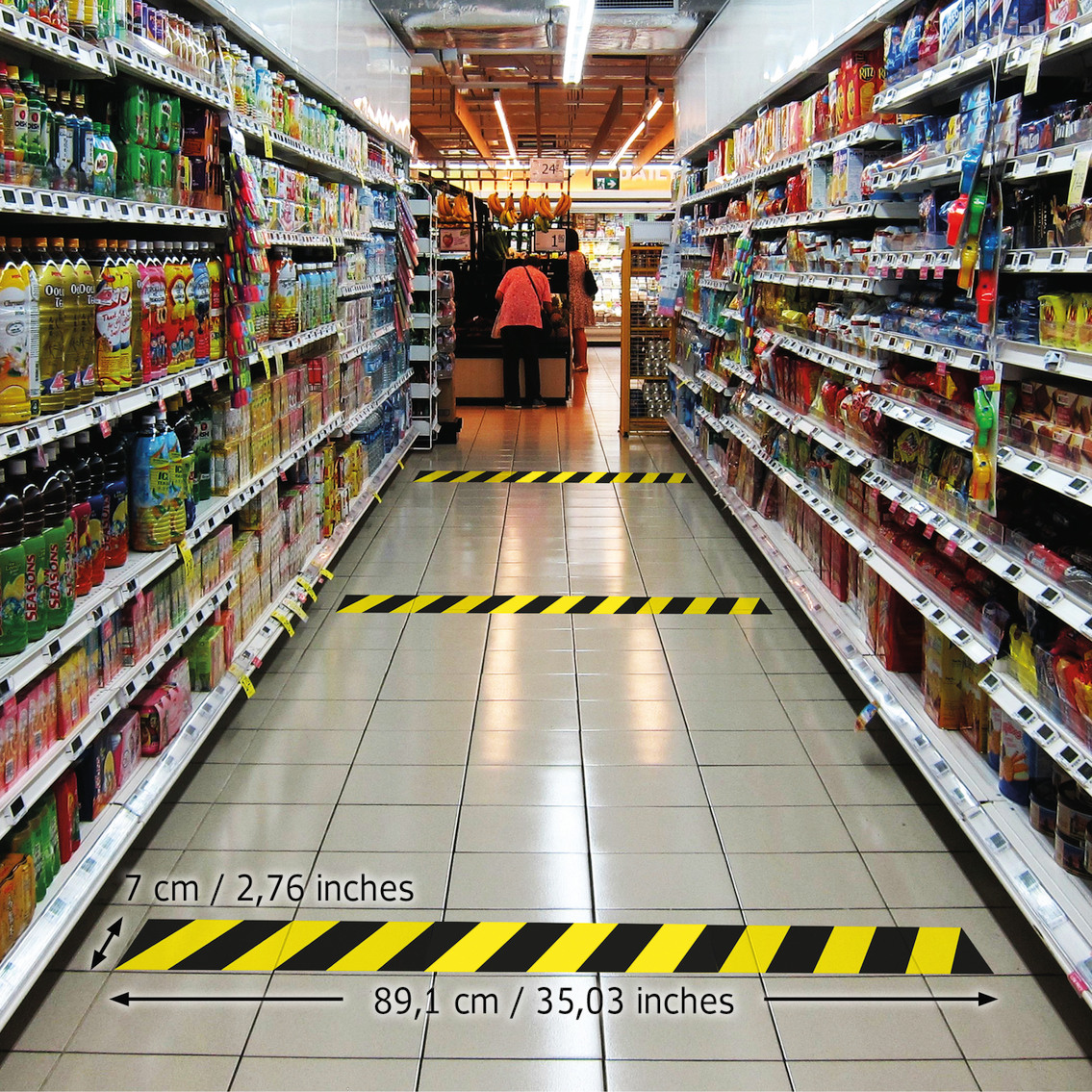 Fussbodenaufkleber aus robuster Folie, wasser-, Öl und Schmutz abweisend, wieder abziehbar, hochwertig bedruckt. 3 Aufkleber auf einem Bogen - nebeneinander geklebt circa 90 cm breit (abhängig vom Abstand zwischen den Aufklebern). Somit sind die Hinweis-Aufkleber zur Einhaltung von einem Mindestabstand flexibel einsetzbar und lassen sich auf die Räumlichkeiten/Anwendung anpassen. Die Bodenmarkierung ist einfach und schnell aufgeklebt und haftet sicher auf glatten und sauberen Fussböden und Fliesen. Ideal für die Verwendung im Ladengeschäft, Hotel, Restaurant, in Firmen, öffentlichen Einrichtungen, Arztpraxen uvm. Zur korrekten Einhaltung notwendiger Schutz- und Vorsichtsmassnahmen gegen das Coronavirus / COVID-19 und anderen übertragbaren Infektionen sowie zur Wahrung der Diskretion in Banken, Apotheken, uvm.