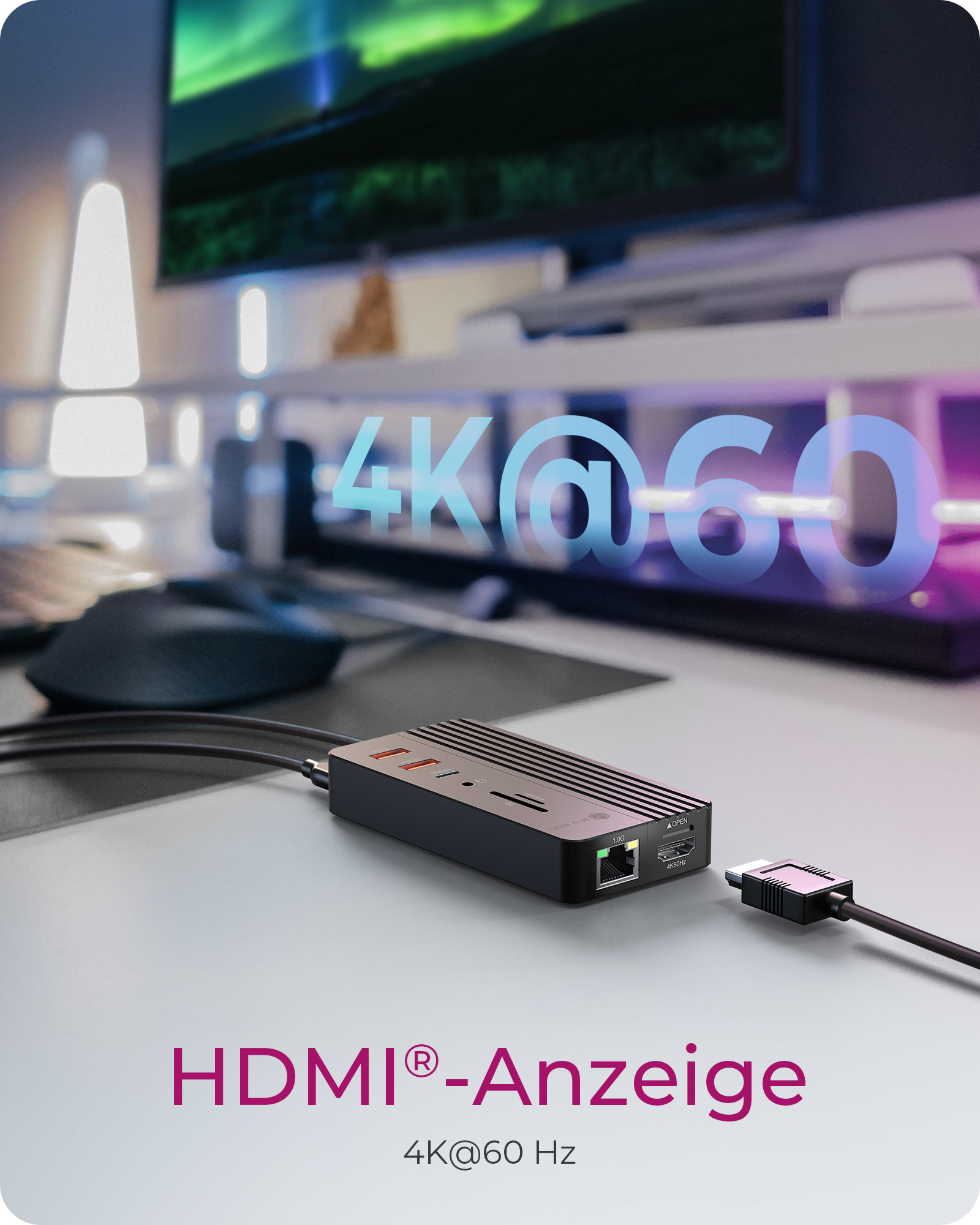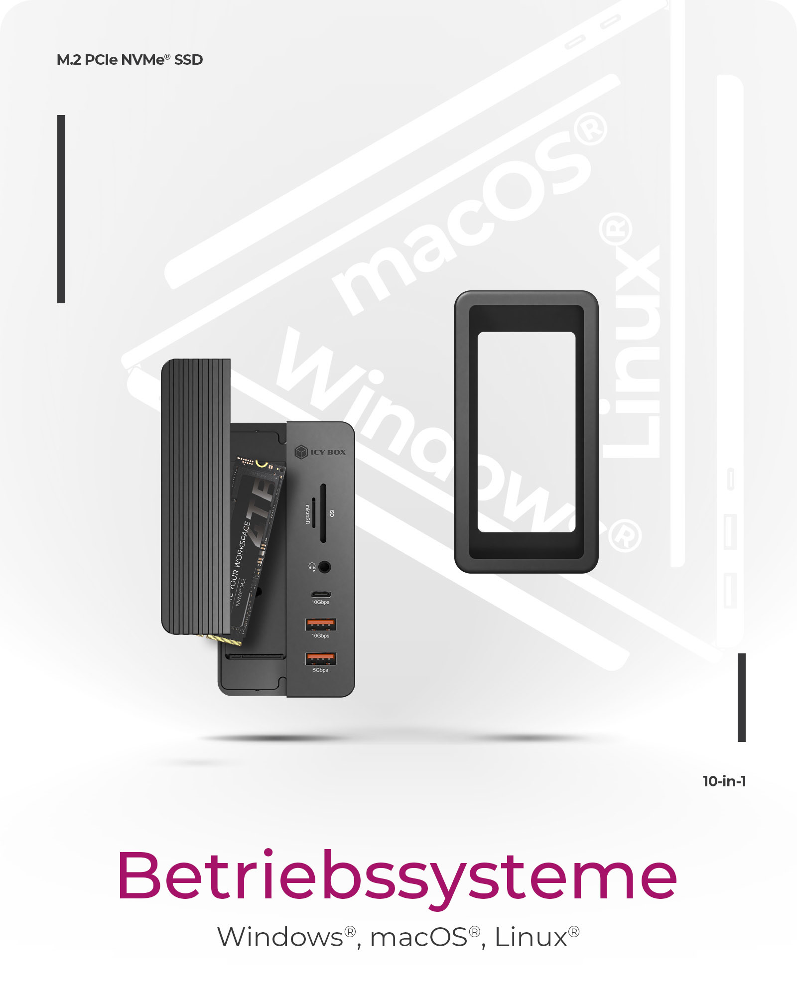 IB-DK4072M-CU31 – Die 10-in-1 DockingStation mit integriertem M.2 NVMe SSD Gehäuse für maximale Effizienz. Die IB-DK4072M-CU31 vereint durchdachtes Design mit höchster Funktionalität: Diese leistungsstarke 10-in-1 DockingStation erweitert Ihr Setup nicht nur um zahlreiche Anschlussmöglichkeiten, sondern integriert zusätzlich ein werkzeugloses M.2 NVMe SSD-Gehäuse, das PCIe Gen3x2 für ultraschnelle Datenübertragung unterstützt. Ideal für alle, die großen Wert auf flexiblen Speicherzugriff und eine schnelle, unkomplizierte SSD-Installation legen. Mit USB-C® und USB-A Ports (bis zu 10 Gbit/s), SD-/microSD-Kartenlesern, einem Gigabit-LAN-Anschluss sowie einer 3,5-mm-Audiobuchse steht Ihnen alles zur Verfügung, was Sie für produktives Arbeiten brauchen. Der HDMI®-Ausgang sorgt mit einer brillanten 4K-Auflösung bei 60 Hz für gestochen scharfe Bildwiedergabe – ob im Büro, im Homeoffice oder beim Präsentieren. Dank Power Delivery 3.0 bleiben Sie jederzeit mit bis zu 100 Watt versorgt. So laden Sie nicht nur Ihre Geräte, sondern versorgen auch gleichzeitig die DockingStation selbst – ganz ohne unnötige Kabel oder Netzteile. Für zusätzlichen Schutz unterwegs ist eine passgenaue Gummihülle im Lieferumfang enthalten, die das Gerät sicher und sauber hält. Kompatibel mit Windows®, macOS® und Linux®, fügt sich die DockingStation nahtlos in jede Systemumgebung ein – perfekt für alle, die zwischen verschiedenen Workstations wechseln. Ob kreatives Arbeiten, Datensicherung oder mobiles Office: Die IB-DK4072M-CU31 ist Ihre leistungsstarke All-in-One-Lösung.