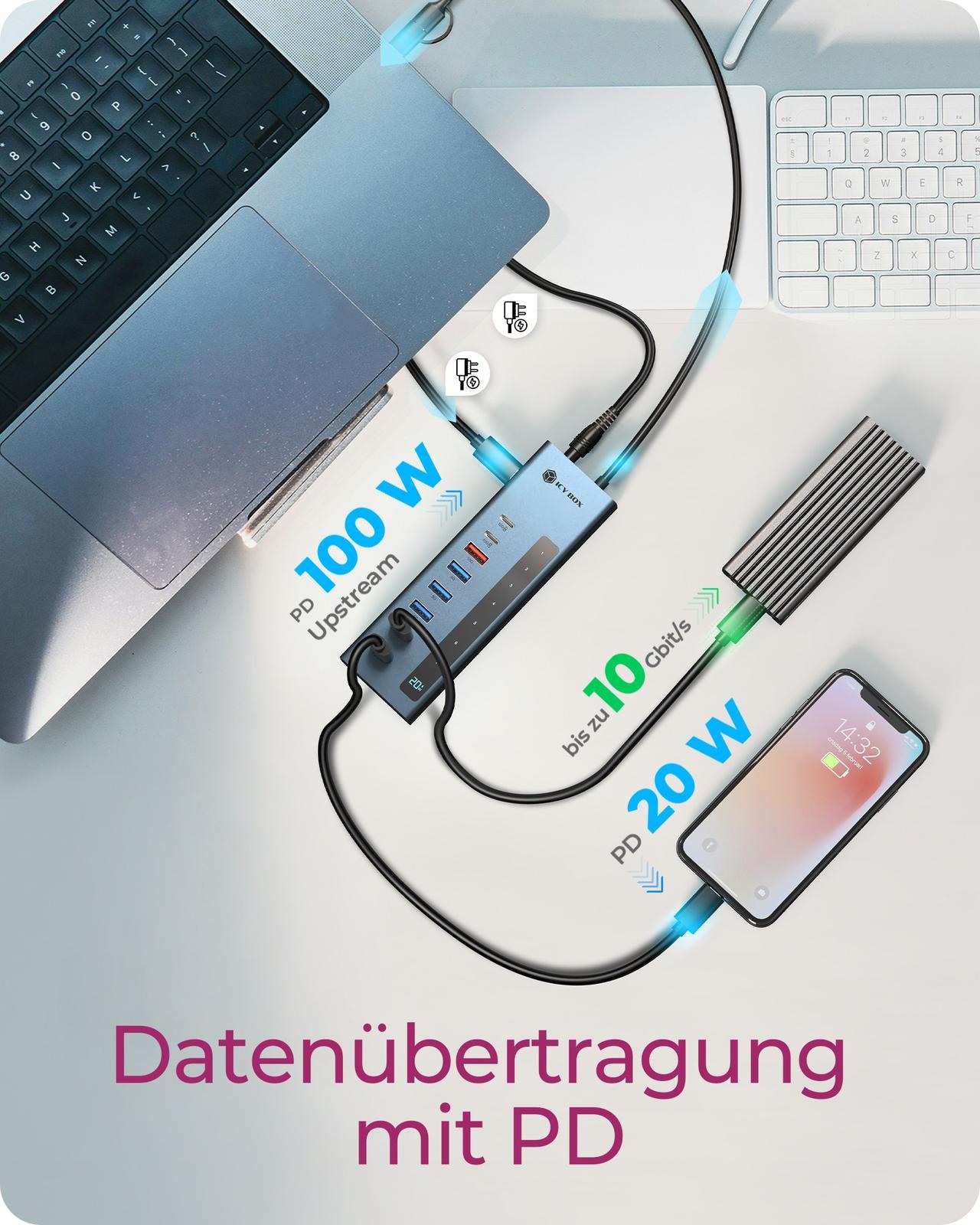Der ICY BOX® IB-HUB1743-CPD ist die smarte All-in-One-Lösung für moderne Arbeitsplätze und mobile Setups. Als vielseitiger 9-in-1 USB-C/A Hub erweitert er Ihr Notebook oder Ihren Desktop-PC um zahlreiche Anschlüsse und sorgt so für maximale Konnektivität – ganz gleich, ob Sie im Büro, Homeoffice oder unterwegs arbeiten. Ausgestattet mit insgesamt neun Ports, darunter vier USB-A-Anschlüsse (davon ein USB 3.2 Gen 2 und drei USB 3.2 Gen 1), drei USB-C® Ports sowie ein dedizierter USB-C Power Delivery Port mit LED-Anzeige, bietet der Hub eine umfassende Schnittstellenvielfalt. Damit schließen Sie problemlos externe Festplatten, USB-Sticks, Eingabegeräte oder sogar Smartphones an – und laden sie gleichzeitig effizient auf. Die Datenübertragungsrate von bis zu 10 Gbit/s sorgt für ultraschnelle Dateiübertragungen und flüssiges Arbeiten auch mit großen Datenmengen. Dank UASP-Unterstützung profitieren Sie zusätzlich von einer optimierten Performance beim Zugriff auf externe Speicherlösungen.Der Hub überzeugt nicht nur durch Leistung, sondern auch durch Design: Das robuste Gehäuse aus blau eloxiertem Aluminium ist nicht nur elegant, sondern bietet auch eine passive Kühlung für einen dauerhaft zuverlässigen Betrieb – ganz ohne Lüftergeräusche. Eine integrierte LED-Anzeige informiert jederzeit über Betrieb und Datenzugriffe sowie den Ladezustand via Power Delivery.Die Stromversorgung erfolgt über ein mitgeliefertes 12V/4A-Netzteil, sodass auch leistungshungrige Geräte zuverlässig mit Energie versorgt werden können. Der 60 cm lange Anschluss über USB 3.2 Gen 2 Type-C® bietet Flexibilität am Arbeitsplatz und ist kompatibel mit Windows®, macOS® und Linux®. Der Hub funktioniert sowohl an modernen USB-C®-Ports als auch an USB-A-Anschlüssen (mit passendem Adapter).